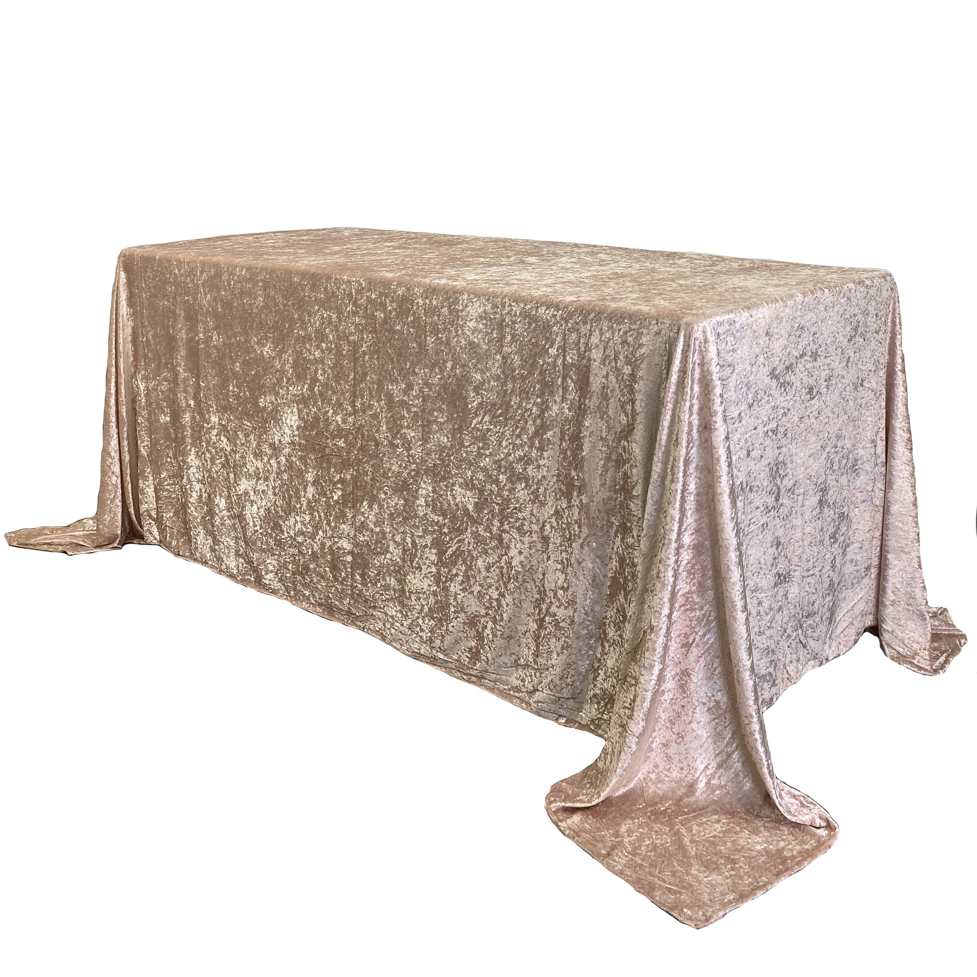Revamp your event décor with the stunning beauty of our champagne Crushed Velvet 90 x 156-inch Rectangular Tablecloths. The velvety texture and dazzling color combination provide a euphoric and romantic event setting. Crafted from high-quality 190 GSM crushed velvet fabric also known as panne velvet, our 90 x 156-inch rectangular crushed velvet tablecloths in champagne are designed to provide a floor-length drop on a standard 8-foot rectangular table with a 30-inch height. Additionally, each tablecloth is seamless and features a serged finish setting the standard of sophistication further magnifying your event.