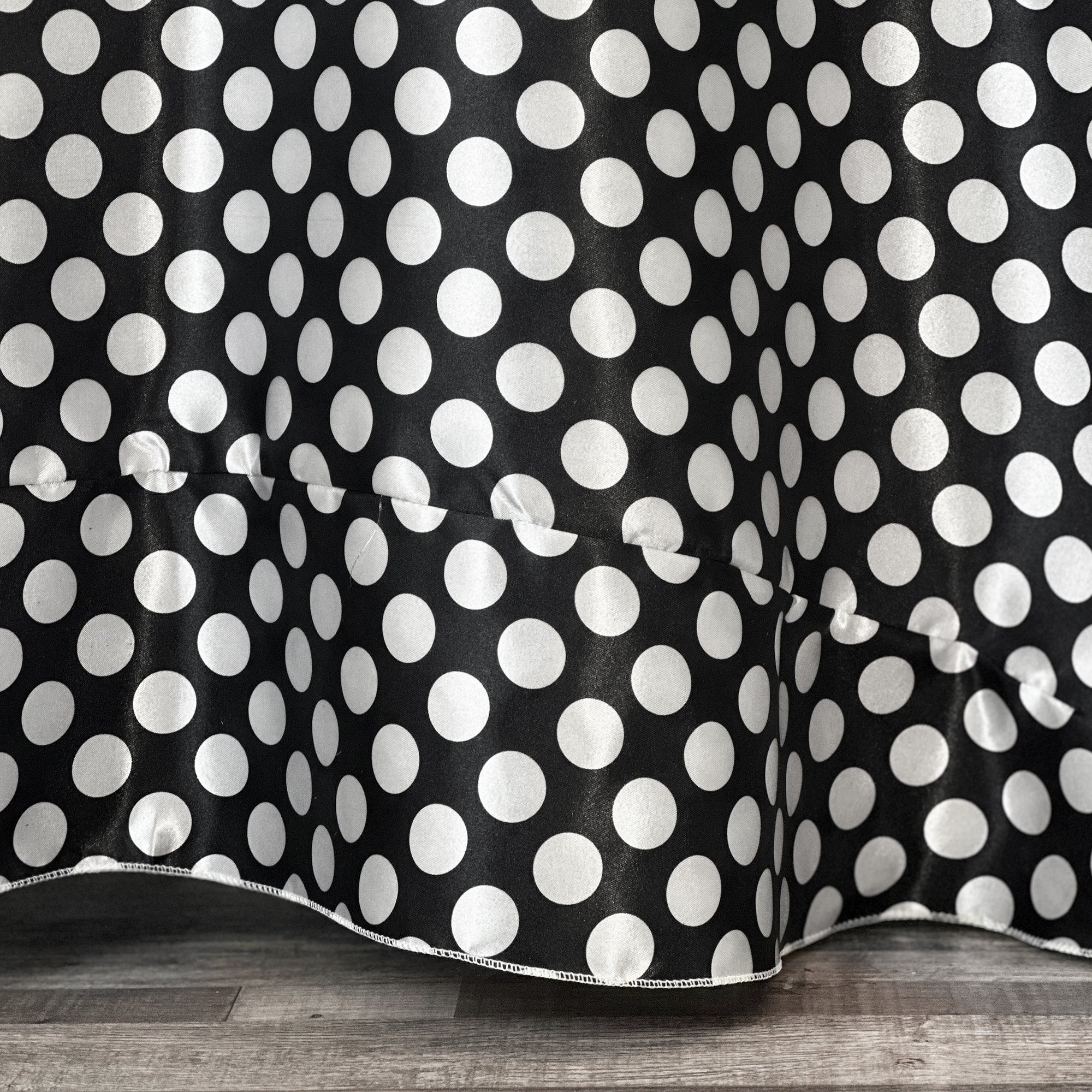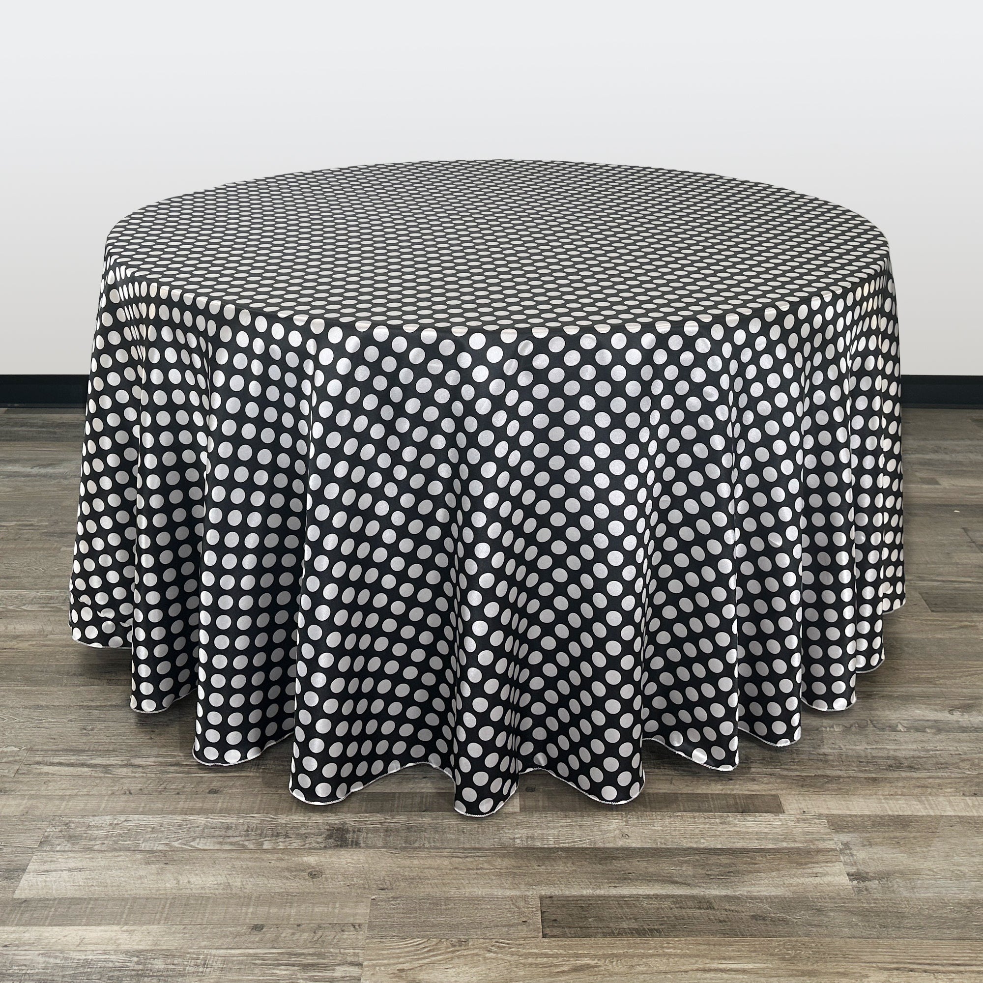 120 inch satin round tablecloths in black and white polka dots are designed to fully drape the most common table used in banquet halls or wedding reception centers--the 60 inch round table or 5 ft round table with 30 inch height. Meaning, a 120-inch black and white polka dots round tablecloth will drop all the way to the floor, giving the table an elegant appearance. Aside from that fact that they are fully drapable, wedding planners and fine-dining professionals prefer to use black and white polka dots 120 inch rounds over other wedding linen tablecloths due to their soft and silky-satin feel, iridescent and shimmering appearance, durability plus stain and wrinkle resistant properties.
