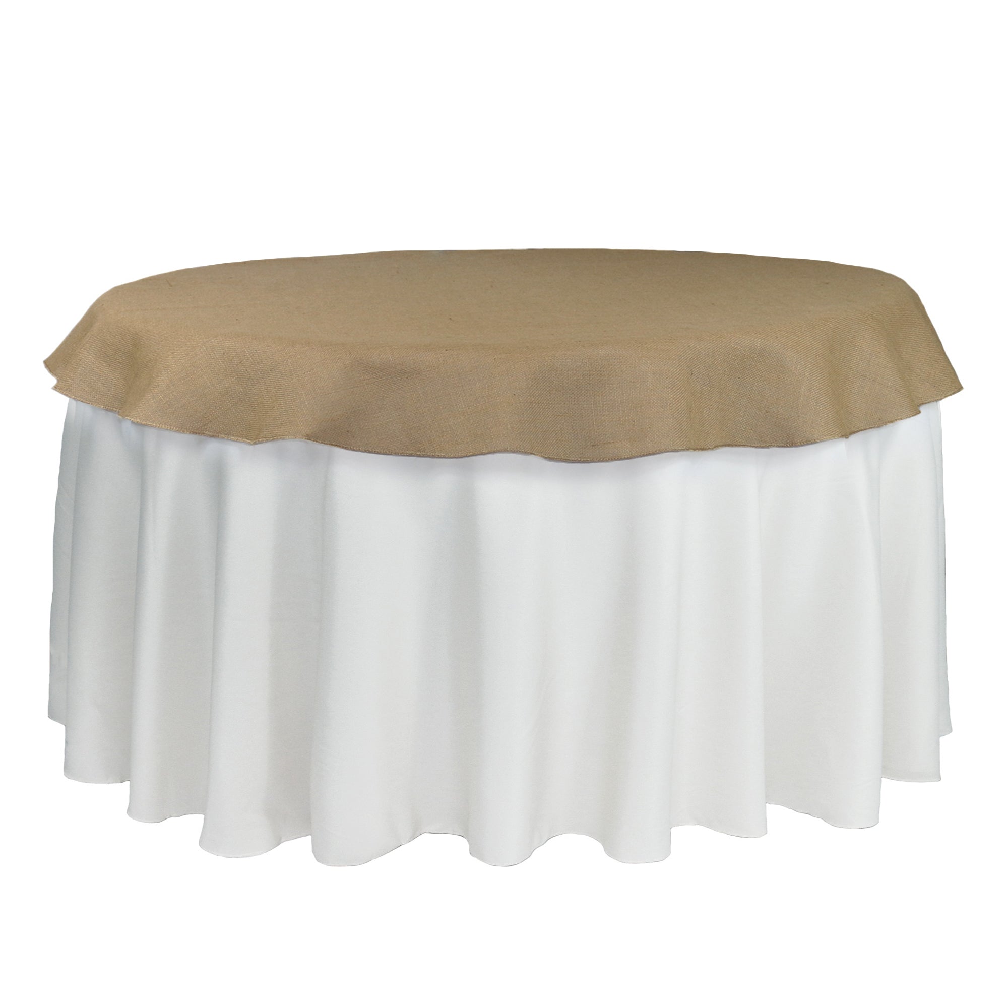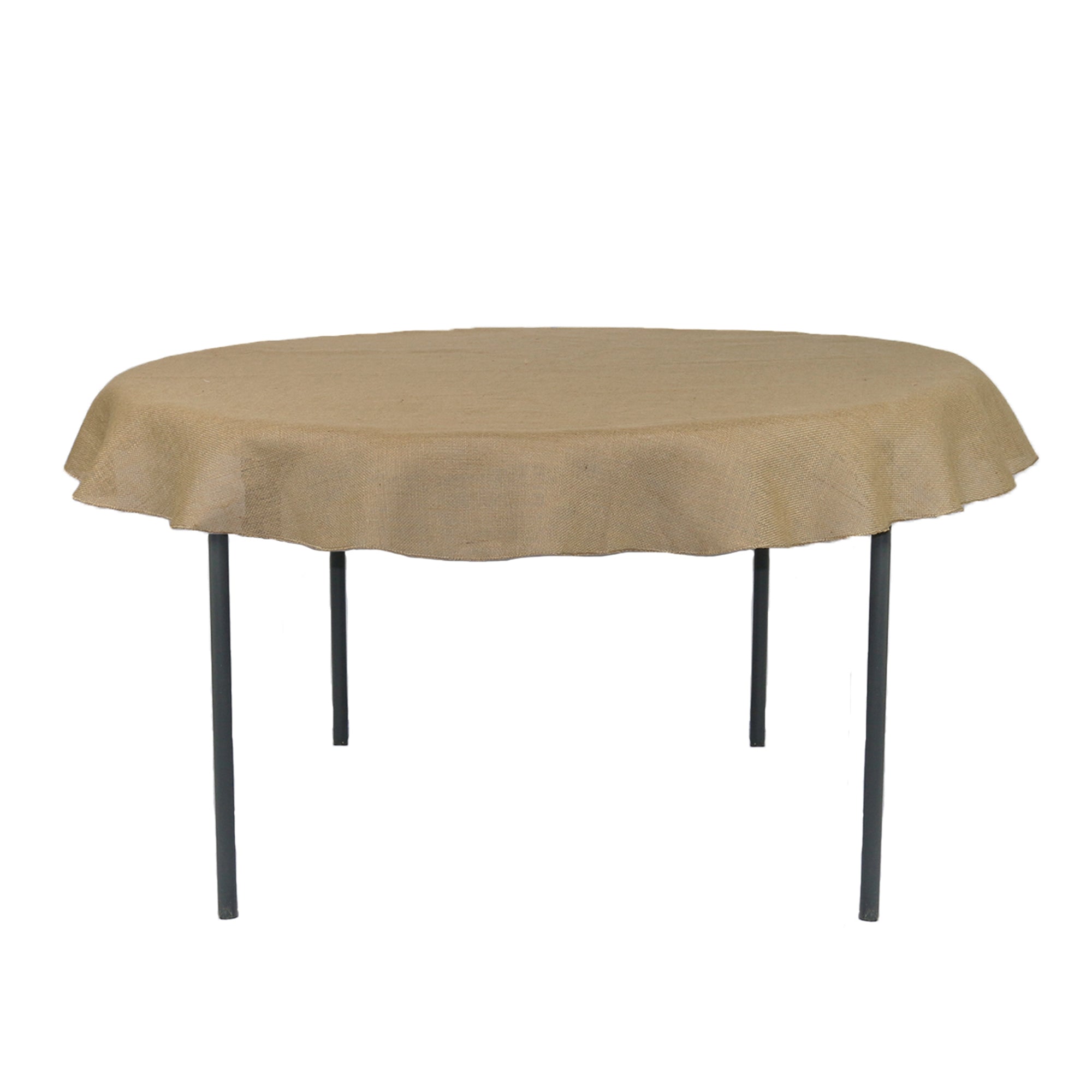 Our 72 inch round burlap tablecloths are made from high quality and durable burlap material. These round tablecloths are seamless (crafted from a single piece of burlap fabric) and feature serged edges for extra durability. When used on a 5 ft or 60 inch round table with a 30 inch height, the 72 inch round table linen offers a tablecloth drop of 24 inches--granting guests more leg room. Or 18 inch drop when used on a 6 ft or 72 inch round table. Some wedding planners use this tablecloth as a stylish 72 inch round table overlay on top of a rectangular table linen. You can also create the popular scalloped overlay style by using multiple 72 inch tablecloths as overlays on a long table.