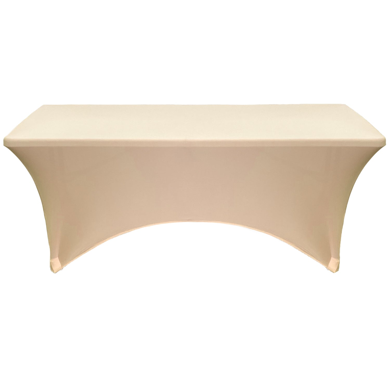 Made from high-quality four-way stretch spandex material, our champagne stretch spandex 6 ft rectangular table covers exemplify modern sophistication and luxurious elegance and are designed to fit 6 ft or 72" rectangular tables with 30" height at weddings, casinos, hotels, restaurants, and other special events. Champagne spandex tablecloths from Bridal Tablecloths have deep canvas foot pockets, are durable, do not require ironing, and can be laundered countless times. Please note that there are inferior and cheaper versions of this champagne spandex tablecloth available in the market, ours is crafted from a hotel and restaurant quality spandex type of material.