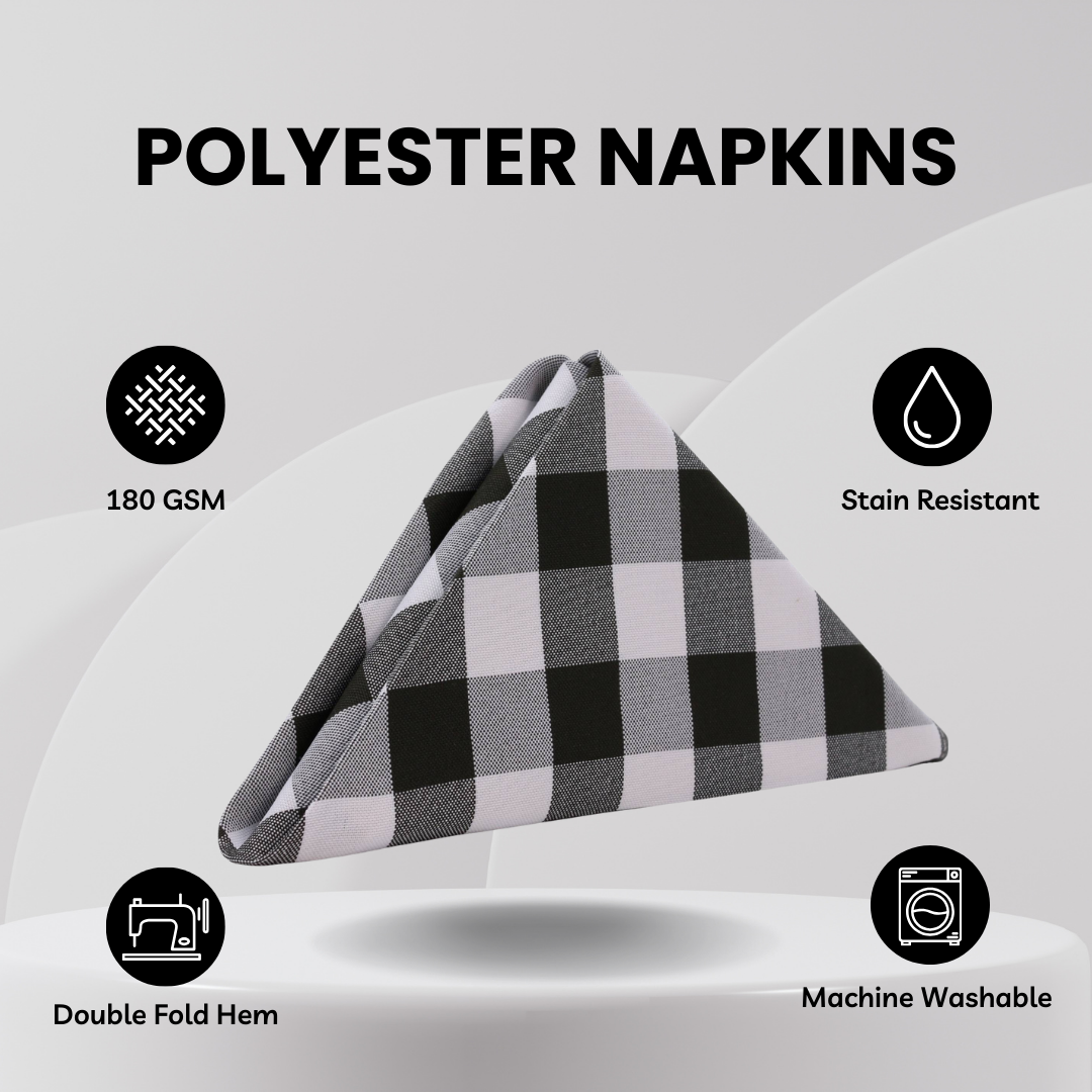 Linen tablecloths and napkins. These are the focal points of any luxurious event or elegant wedding reception table. Aside from its main use of being a cloth napkin, our 20-inch x 20-inch polyester napkin in checkered black will definitely help you put together a cohesive, wedding design--as far as creating color-themed weddings is concerned. Use them as a key component of your style palette, just like what event planners would do. Implement style and hue elements by using cloth napkins instead of other wedding decors. As part of our commitment to the wedding industry, we only sell high-quality napkins at affordable, wholesale prices.