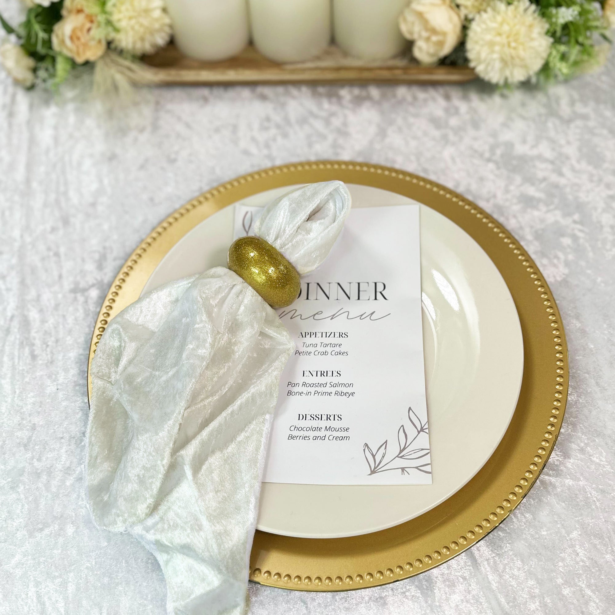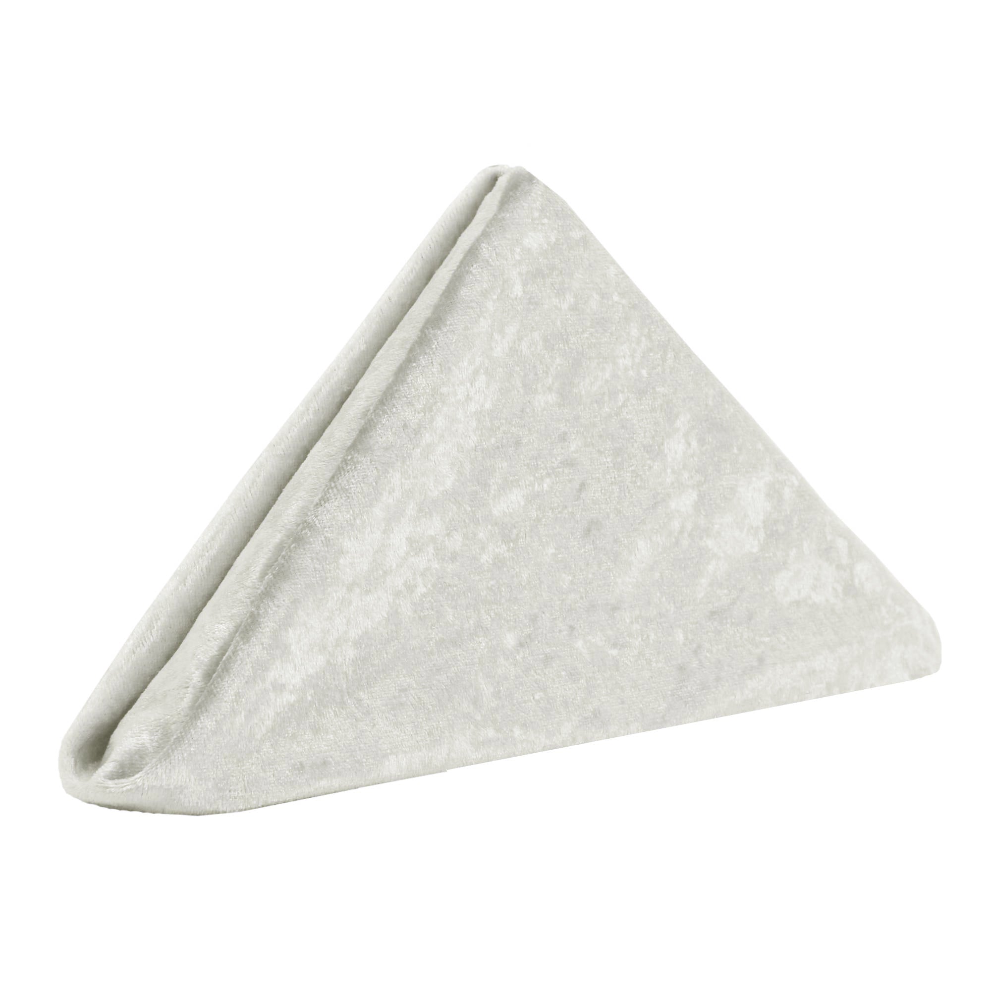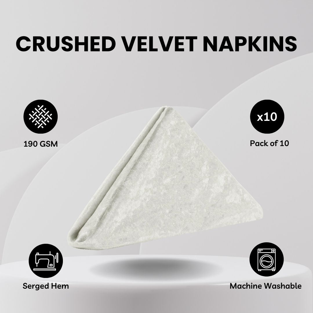 Give your table décor the royal treatment it deserves with our Crushed Velvet Napkins – Ivory. Aside from their main use of being a cloth napkin, our silky soft 20" x 20" crushed velvet napkins in ivory are constructed from high-quality 190 GSM lush velvet fabric thick enough to uphold any napkin folding design. In addition to the premium velvet fabric, our crushed velvet napkins feature a double-fold hem and are seamless allowing you to assemble a polished and luxurious table design. Utilize them as a key component of your style palette or perfectly pair them with our collection of crushed velvet tablecloths and table runners. If you're looking for elegant wedding napkins, you can't go wrong with ivory crushed velvet napkins as decorative linen napkins.