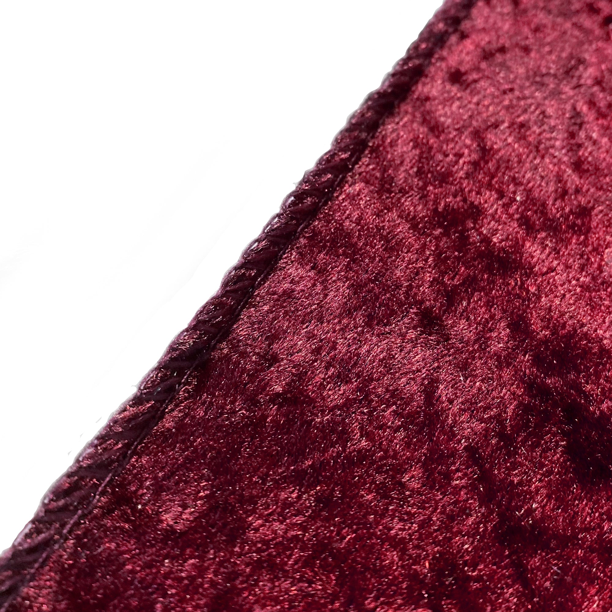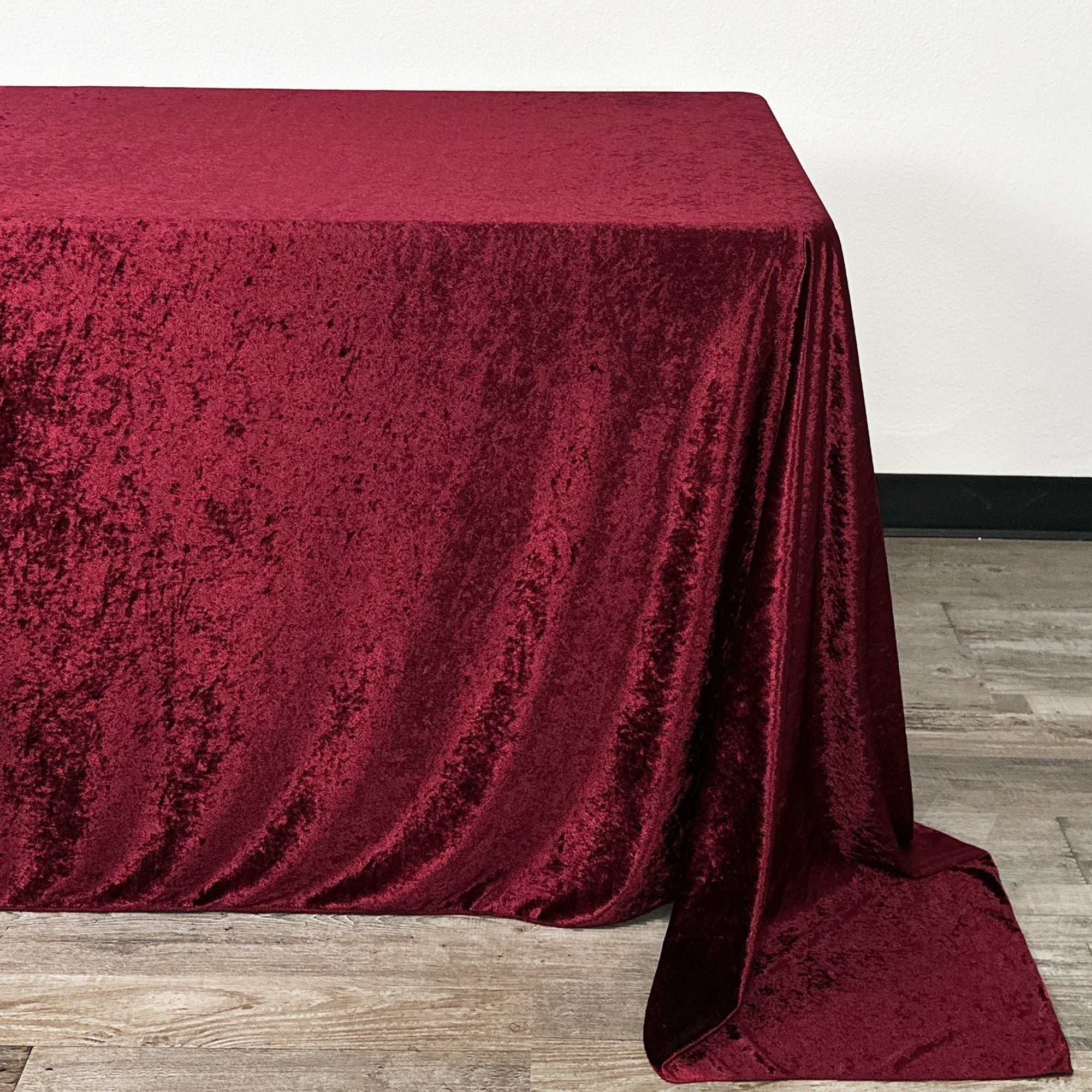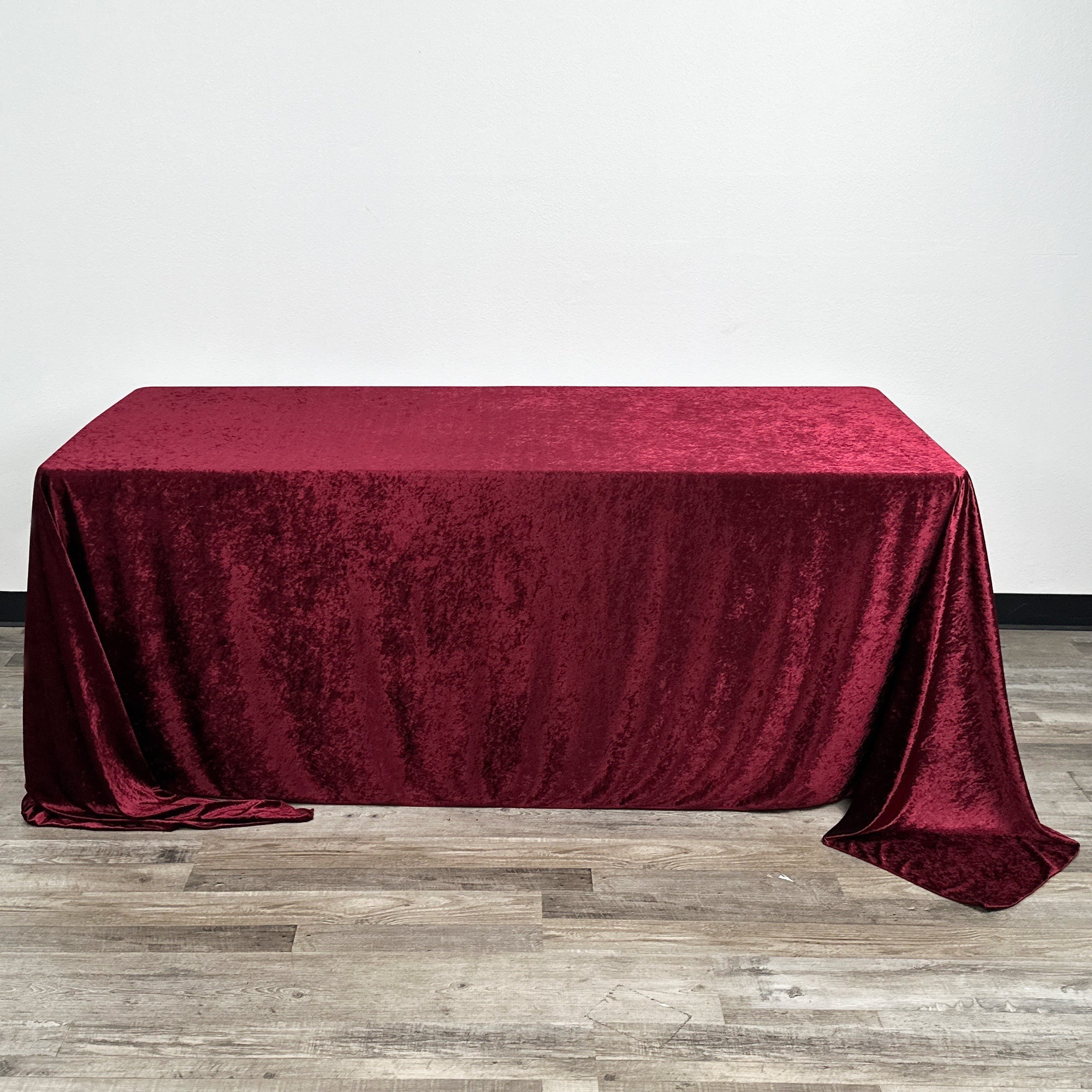 Revamp your event décor with the stunning beauty of our burgundy Crushed Velvet 90 x 156-inch Rectangular Tablecloths. The velvety texture and dazzling color combination provide a euphoric and romantic event setting. Crafted from high-quality 190 GSM crushed velvet fabric also known as panne velvet, our 90 x 156-inch rectangular crushed velvet tablecloths in burgundy are designed to provide a floor-length drop on a standard 8-foot rectangular table with a 30-inch height. Additionally, each tablecloth is seamless and features a serged finish setting the standard of sophistication further magnifying your event.