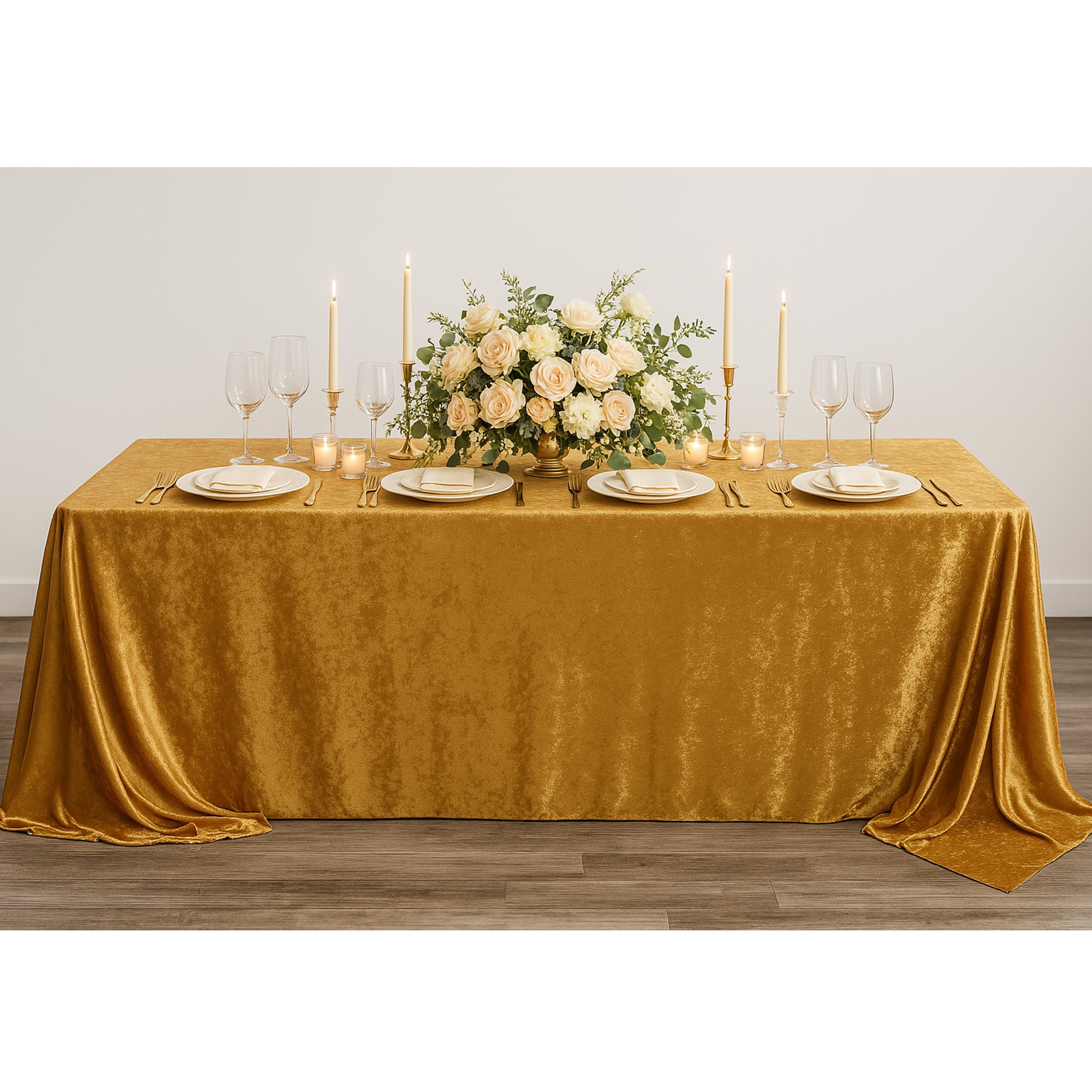 Revamp your event décor with the stunning beauty of our gold Crushed Velvet 90 x 156-inch Rectangular Tablecloths. The velvety texture and dazzling color combination provide a euphoric and romantic event setting. Crafted from high-quality 190 GSM crushed velvet fabric also known as panne velvet, our 90 x 156-inch rectangular crushed velvet tablecloths in gold are designed to provide a floor-length drop on a standard 8-foot rectangular table with a 30-inch height. Additionally, each tablecloth is seamless and features a serged finish setting the standard of sophistication further magnifying your event.