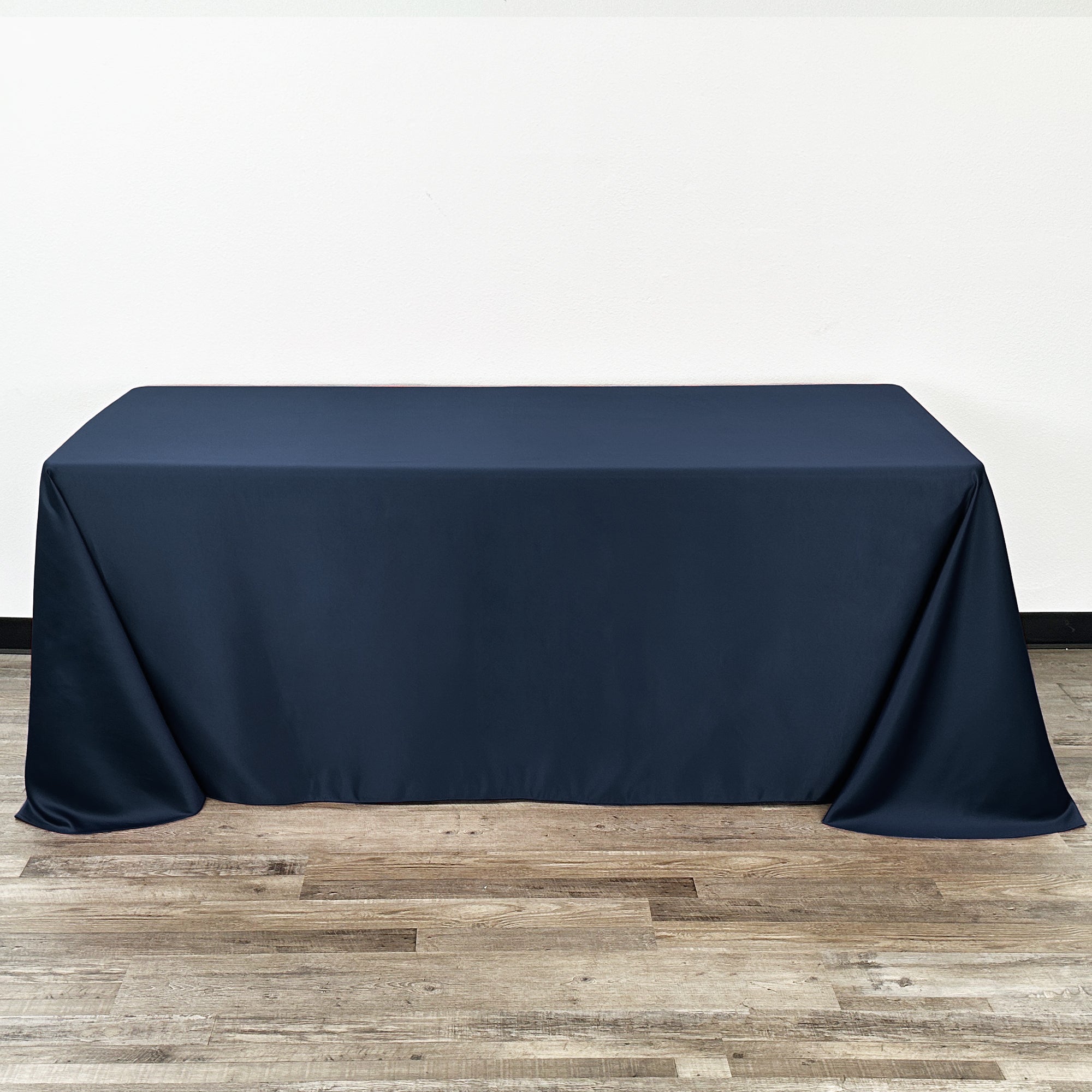 Cloth napkins and linen tablecloths. These are the focal points of any luxurious event or elegant wedding reception table. Aside from its main use of being a table linen, our 90 x 132 inch l'amour rectangular tablecloth in navy blue will definitely help you put together a cohesive, wedding design--as far as creating color themed weddings is concerned. These navy blue tablecloths feature the elegant, matte appearance that lamour fabrics are known for. Use them as a key component of your style palette, just like what event planners would do. Implement style and hue elements by using cloth napkins instead of other wedding decor. As part of our commitment to the wedding industry, we only sell high quality navy blue lamour tablecloths at affordable, wholesale prices.