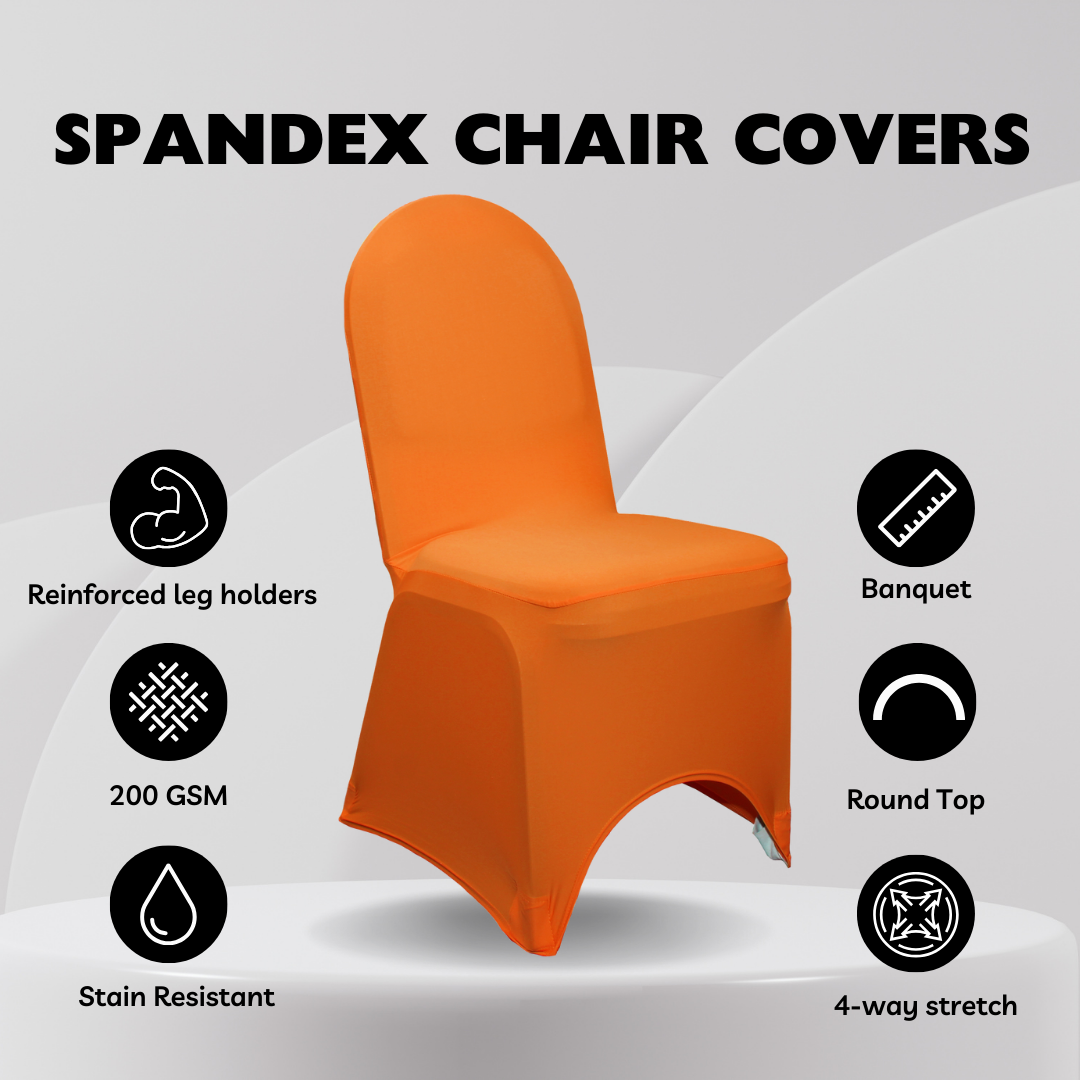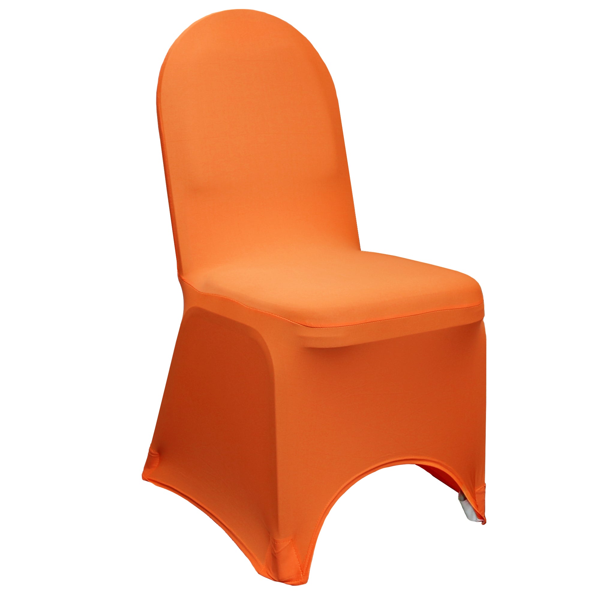 Made from high-quality four-way stretch spandex material, our Orange stretch spandex chair covers exemplify modern sophistication and luxurious elegance and are designed to fit round-top banquet chairs at weddings, casinos, hotels, restaurants, and other special events. Orange spandex chair covers from Bridal Tablecloths have deep elastic foot pockets, are durable, do not require ironing, and can be laundered countless times. There are cheaper versions of this material available in the market, ours is crafted from a hotel and restaurant quality spandex type of material.