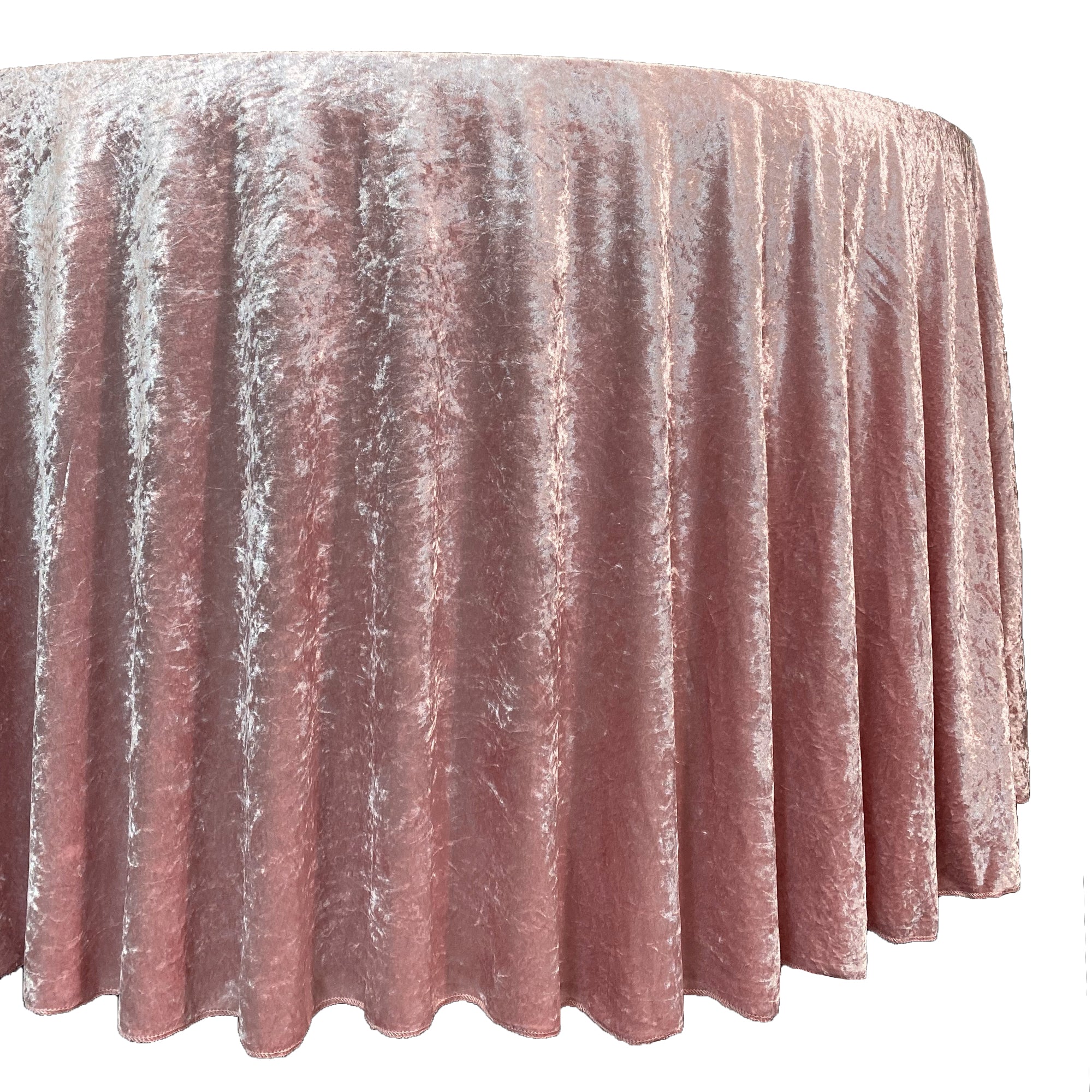 Revamp your event décor with the stunning beauty of our crushed velvet 120-inch round tablecloths – dusty rose. The velvety texture and dazzling color combination provide a euphoric and romantic event setting. We continually strive to offer high-quality rental standard tablecloths and our crushed velvet, also known as panne velvet tablecloths, is no exception! Our dusty rose 120-inch round crushed velvet tablecloths are primarily designed to provide a floor-length drop on a standard 5-foot round banquet table or provide a 24-inch drop on a 6-foot round banquet table. However, these velvet tablecloths are also ideal for highboy cocktail tables. Our 120-inch round crushed velvet tablecloths can be draped over a 36-inch highboy cocktail table to provide a floor-length drop and on a 30-inch highboy cocktail table to create a 3-inch puddle on the ground.