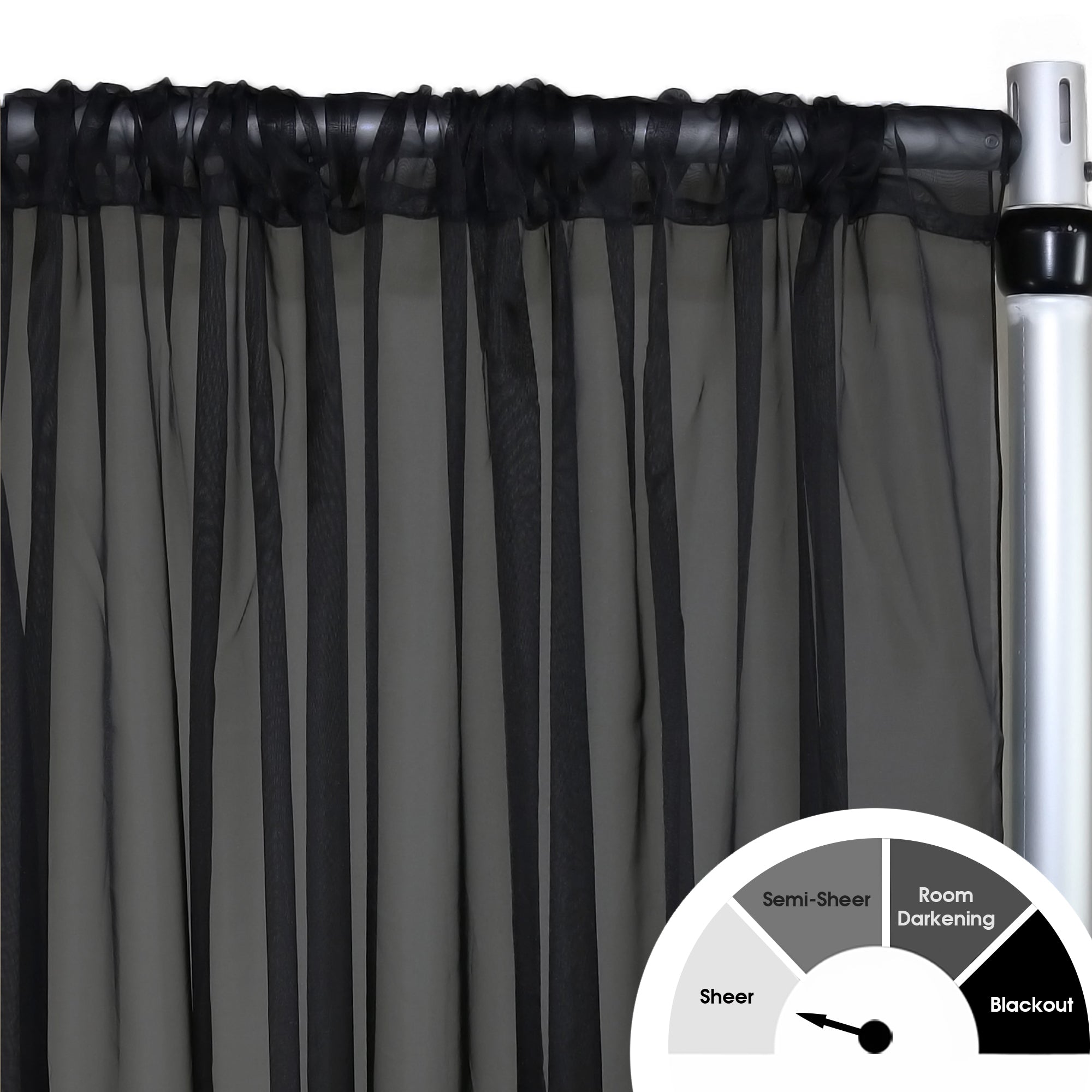Voile Sheer Drape/Backdrop 12 ft x 116 Inches Black is made from high-quality voile material. These multipurpose drapes can be used to add allure and supplemental beauty for weddings, trade shows, birthdays, and any event that requires the coverage of walls or ceilings. Why rent drapes if you can purchase them brand new for the cost of a rental? These premium backdrops are a great addition to an event planner’s inventory, and also, for DIY brides. These Black drapes/backdrops will exquisitely compliment your decor and create a beautiful setting for your special day.