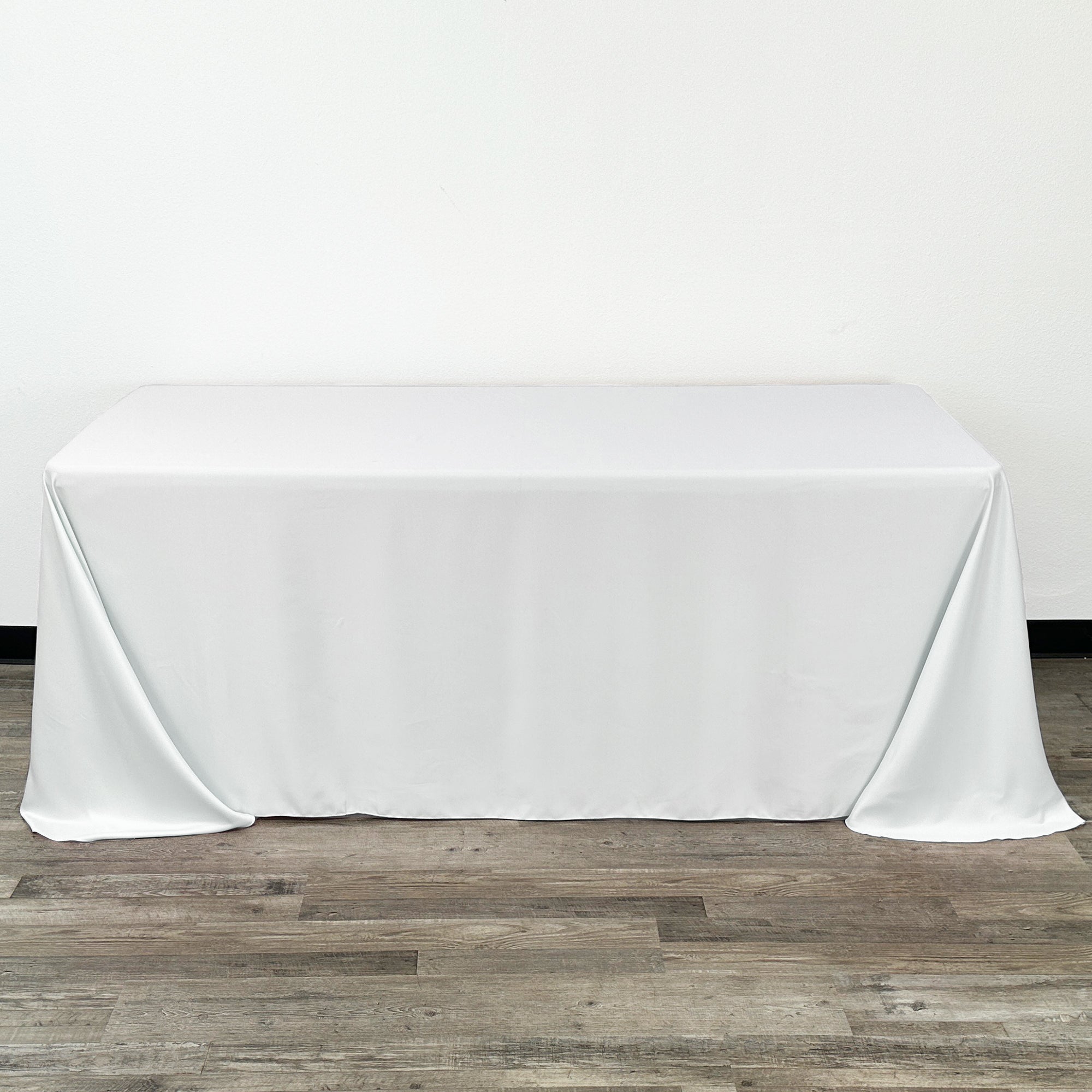 Cloth napkins and linen tablecloths. These are the focal points of any luxurious event or elegant wedding reception table. Aside from its main use of being a table linen, our 90 x 156 inch l'amour rectangular tablecloth in white will definitely help you put together a cohesive, wedding design--as far as creating color themed weddings is concerned. These white tablecloths feature the elegant, matte appearance that lamour fabrics are known for. Use them as a key component of your style palette, just like what event planners would do. Implement style and hue elements by using cloth napkins instead of other wedding decor. As part of our commitment to the wedding industry, we only sell high quality white lamour tablecloths at affordable, wholesale prices.