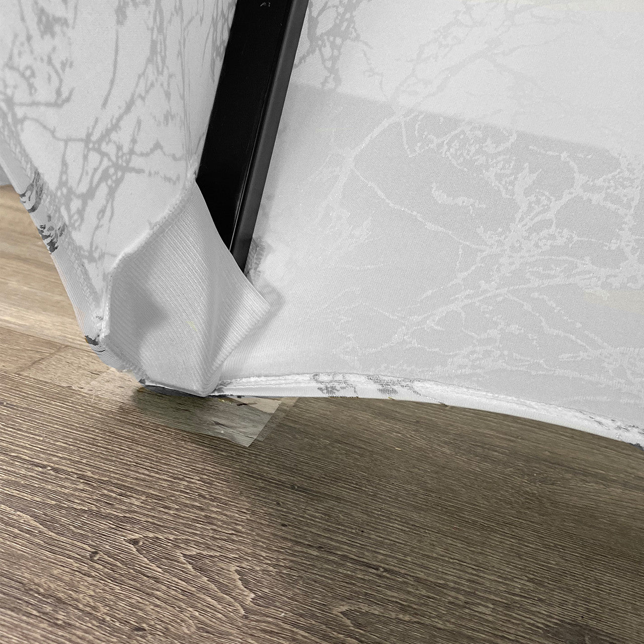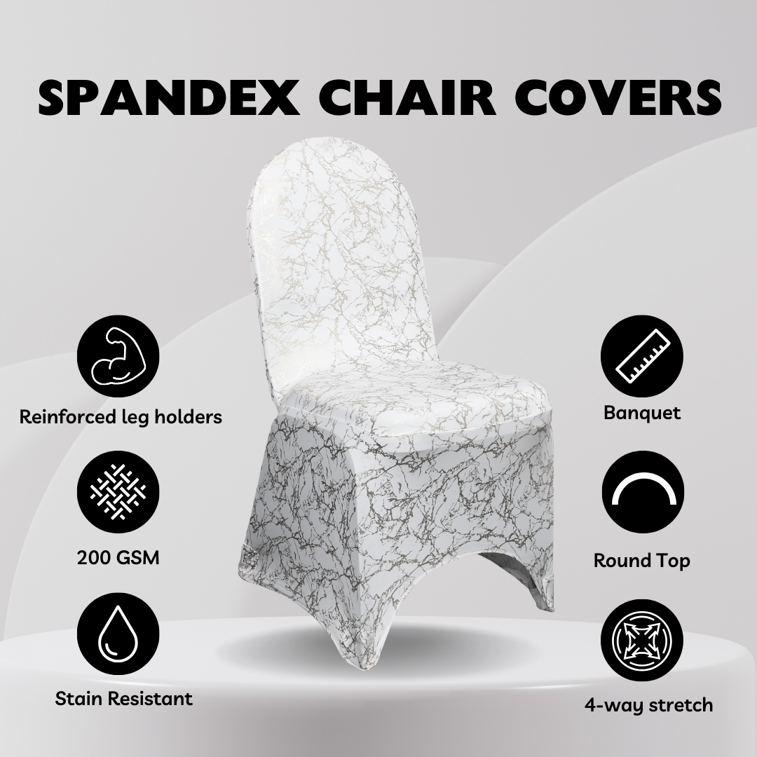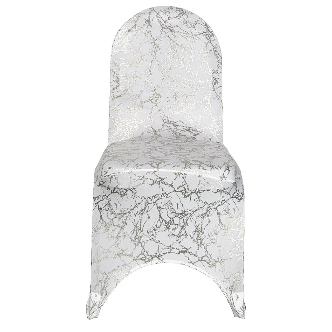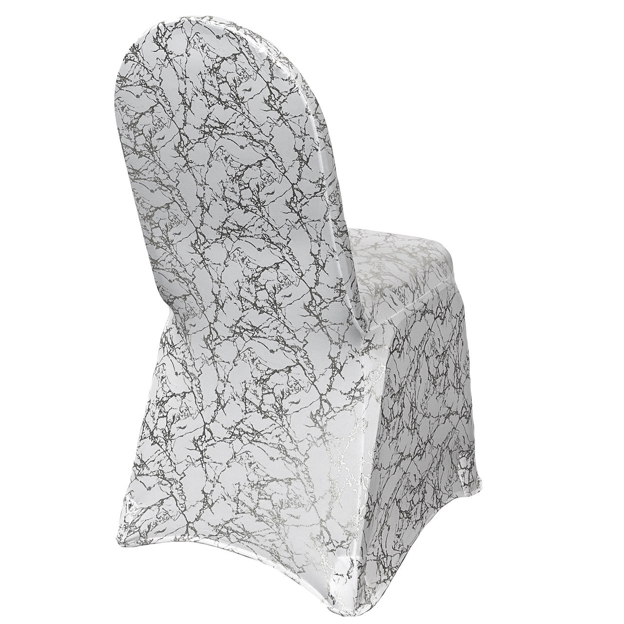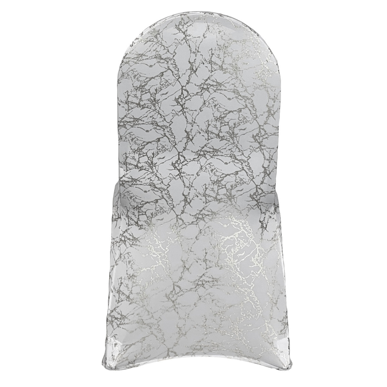 Made from high-quality four-way stretch spandex material, our white with silver marbling stretch spandex chair covers exemplify modern sophistication and luxurious elegance and are designed to fit round-top banquet chairs at weddings, casinos, hotels, restaurants, and other special events. White with Silver Marbling spandex chair covers from Bridal Tablecloths have deep elastic foot pockets, are durable, do not require ironing, and can be laundered countless times. There are cheaper versions of this material available in the market, ours is crafted from a hotel and restaurant quality spandex type of material.