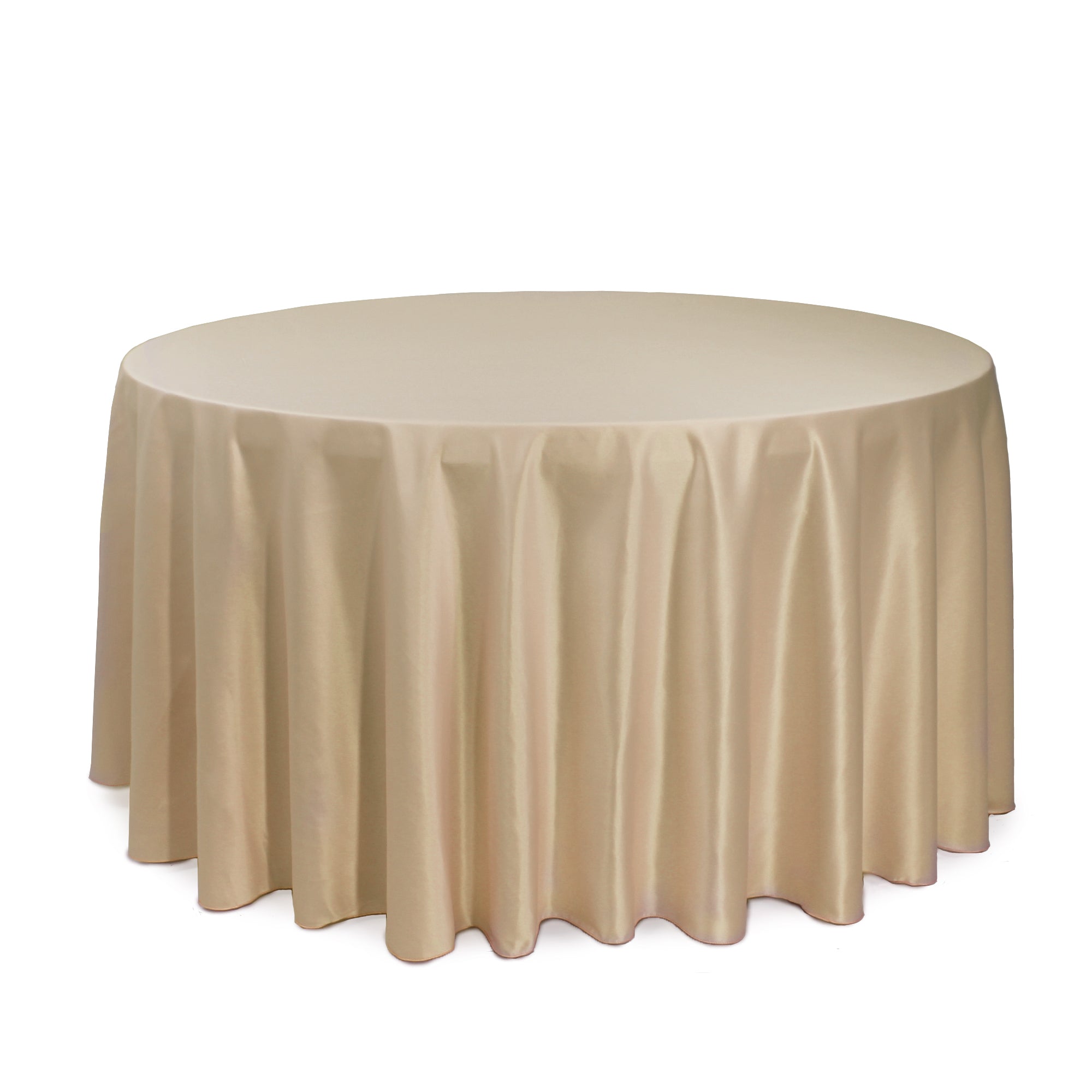 Napkins and Tablecloths. These are the focal points of any luxurious event or elegant wedding reception table. Aside from its main use of being a table linen, our 120 inch l'amour round tablecloth in Champagne will definitely help you put together a cohesive, wedding design--as far as creating color themed weddings is concerned. These Champagne tablecloths feature the elegant, matte appearance that lamour fabrics are known for. Use them as a key component of your style palette, just like what event planners would do. Implement style and hue elements by using cloth napkins instead of other wedding decor. As part of our commitment to the wedding industry, we only sell high quality Champagne lamour tablecloths at affordable, wholesale prices.