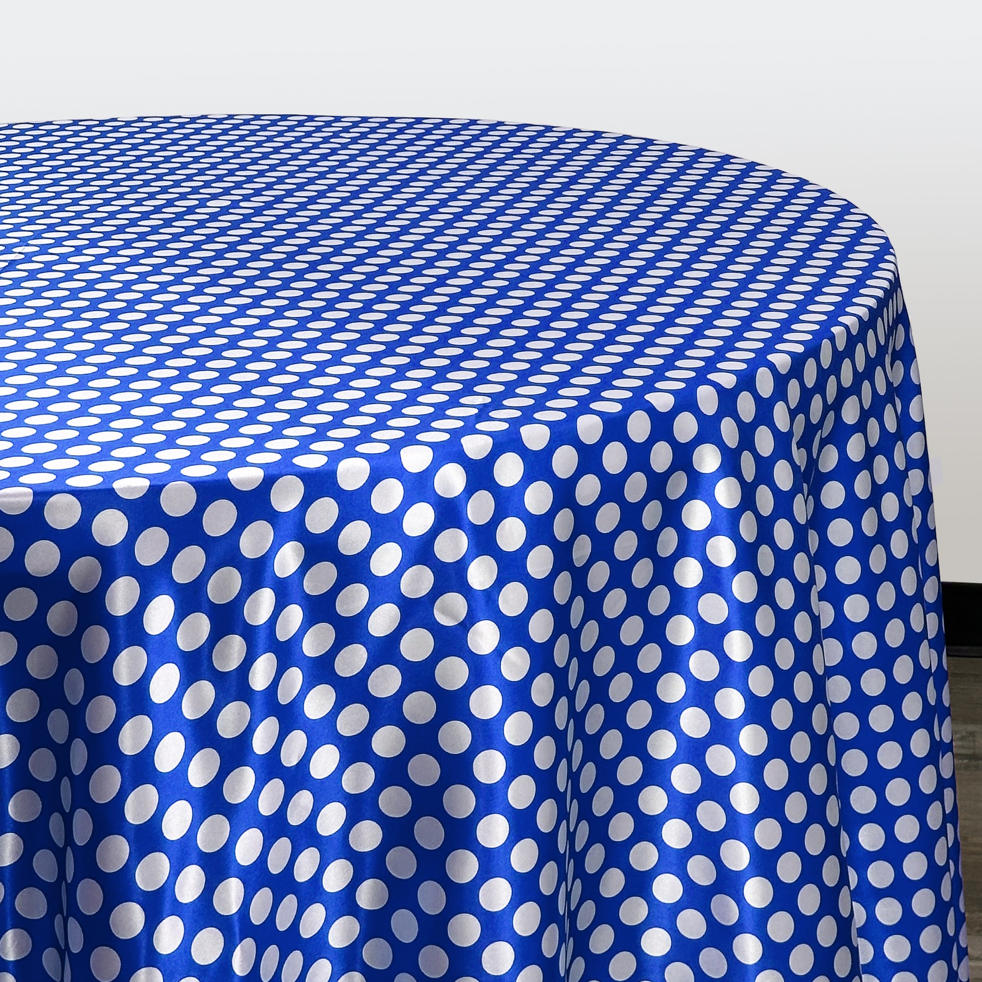 132 inch Satin Round Tablecloth Royal Blue and White Polka Dots