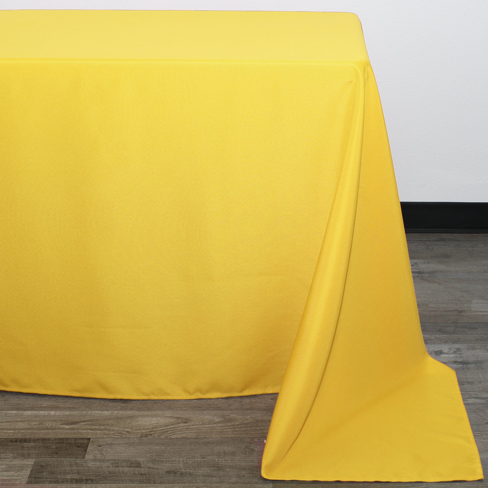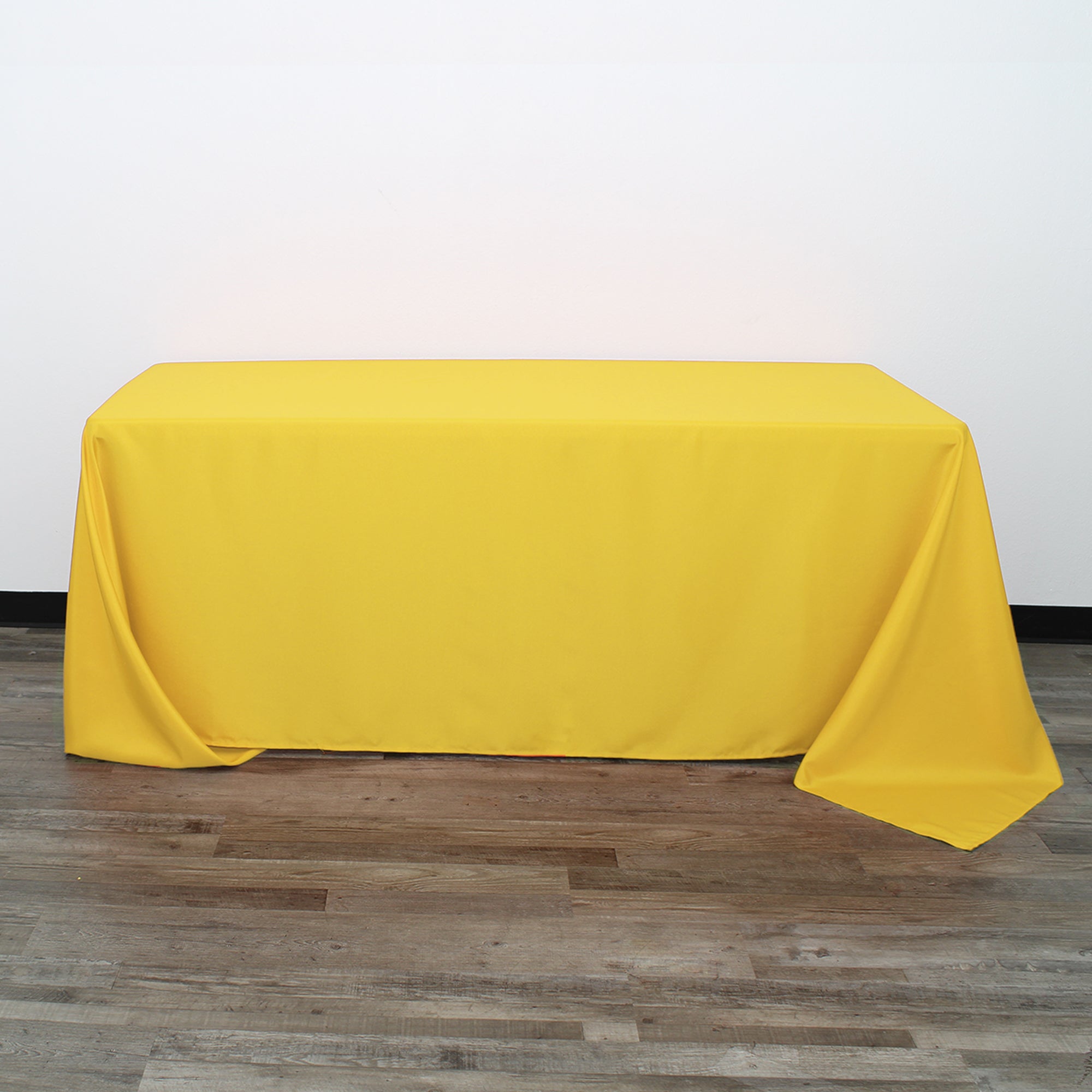 90 x 132-inch polyester rectangular tablecloths in canary yellow are designed to fully drape 72-inch rectangular tables or 6 ft rectangle tables with 30-inch height. Meaning, a 90 x 132-inch canary yellow rectangular poly tablecloth will drop all the way to the floor, giving the table an elegant appearance. High-quality large rectangle tablecloths are a rare find in the wedding industry and Bridal Tablecloths is dedicated to supplying these types of rectangular table linens. Aside from the fact that it's fully drapable, wedding planners and fine-dining professionals prefer to use canary yellow 90 x 132-inch rectangle tablecloths over other wedding linen tablecloths due to their matte finish, durability plus stain and wrinkle-resistant properties.