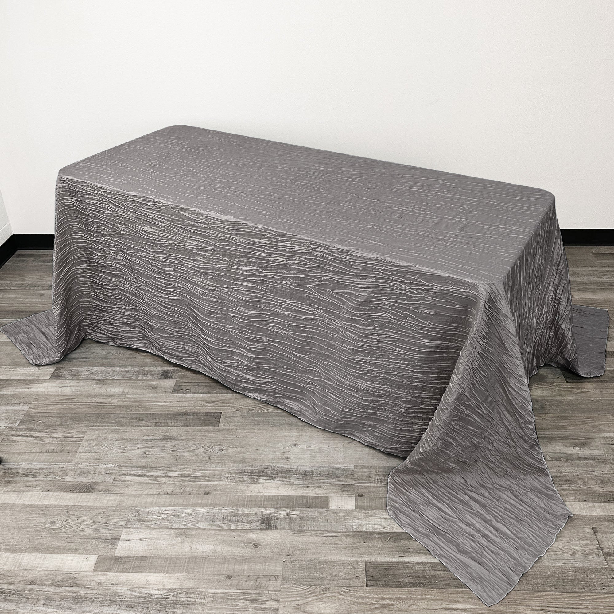 Unique, classy and sophisticated. This is how most people would describe our 90 x 156 inch Crinkle Taffeta Rectangular Tablecloths in Platinum (also known as dark silver rectangle tablecloths or as metallic gray tablecloths). If you are styling a wedding or special event that calls for exquisite designs and modern elegance, our platinum crinkle taffeta table linen for wedding reception tables will definitely fit the bill. When used to complement your wedding chair covers or as a wedding reception hall accent, the textured look of crushed or crinkle platinum taffeta will definitely help make a stylish statement (TIP: You can go easy on other wedding decor). This taffeta tablecloth that fits 96 inch rectangle tables or 8 ft rectangular table sizes is one of our specialty linens here at Bridal Tablecloths.