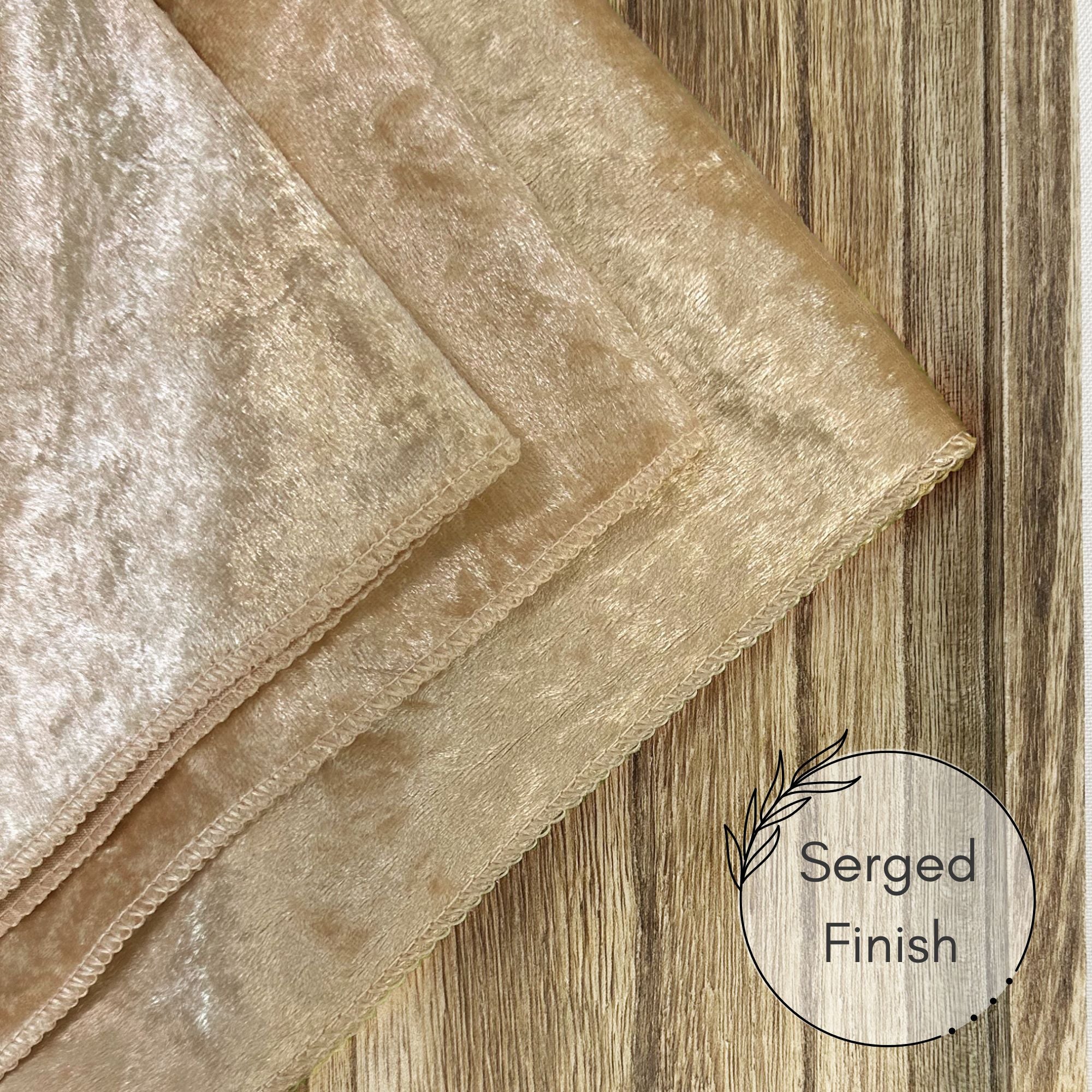 Revamp your table décor with the stunning beauty of our champagne crushed velvet napkins. The velvety texture and dazzling color combination provide a euphoric and romantic event setting. Aside from their main use of being a cloth napkin, our silky soft 20" x 20" crushed velvet napkins in champagne will undeniably help assemble a cohesive, event table design. Our crushed velvet napkins are made from high-quality 190 GSM velvet fabric, are seamless, and feature a serged finish allowing you to assemble a phenomenal table design. Utilize them as a key component of your style palette or perfectly pair them with our collection of crushed velvet tablecloths, table runners, drapes, and napkin rings.