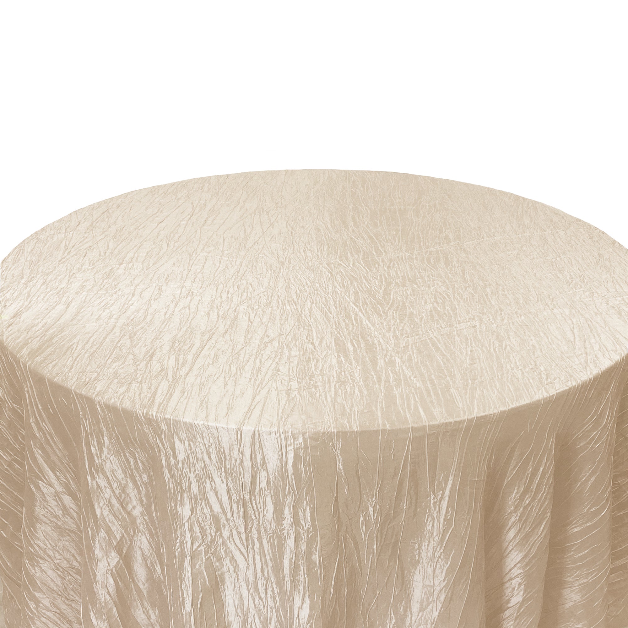 Elegant and classy. This is how most people would describe our 108 inch Crinkle Taffeta Round Tablecloths in Champagne. If you are styling a wedding or special event that calls for exquisite designs and modern elegance, our champagne crinkle taffeta table linen for wedding reception tables will definitely fit the bill. When used to complement your wedding chair covers or as a wedding reception hall accent, the textured look of crushed or crinkle taffeta will definitely help make a stylish statement. This taffeta tablecloth is versatile and can be used to fully drape a 48 inch round table or 24 in drop on a 60 inch/5 ft. round table or as a round overlay on a 72 inch/ 6 ft. round table.