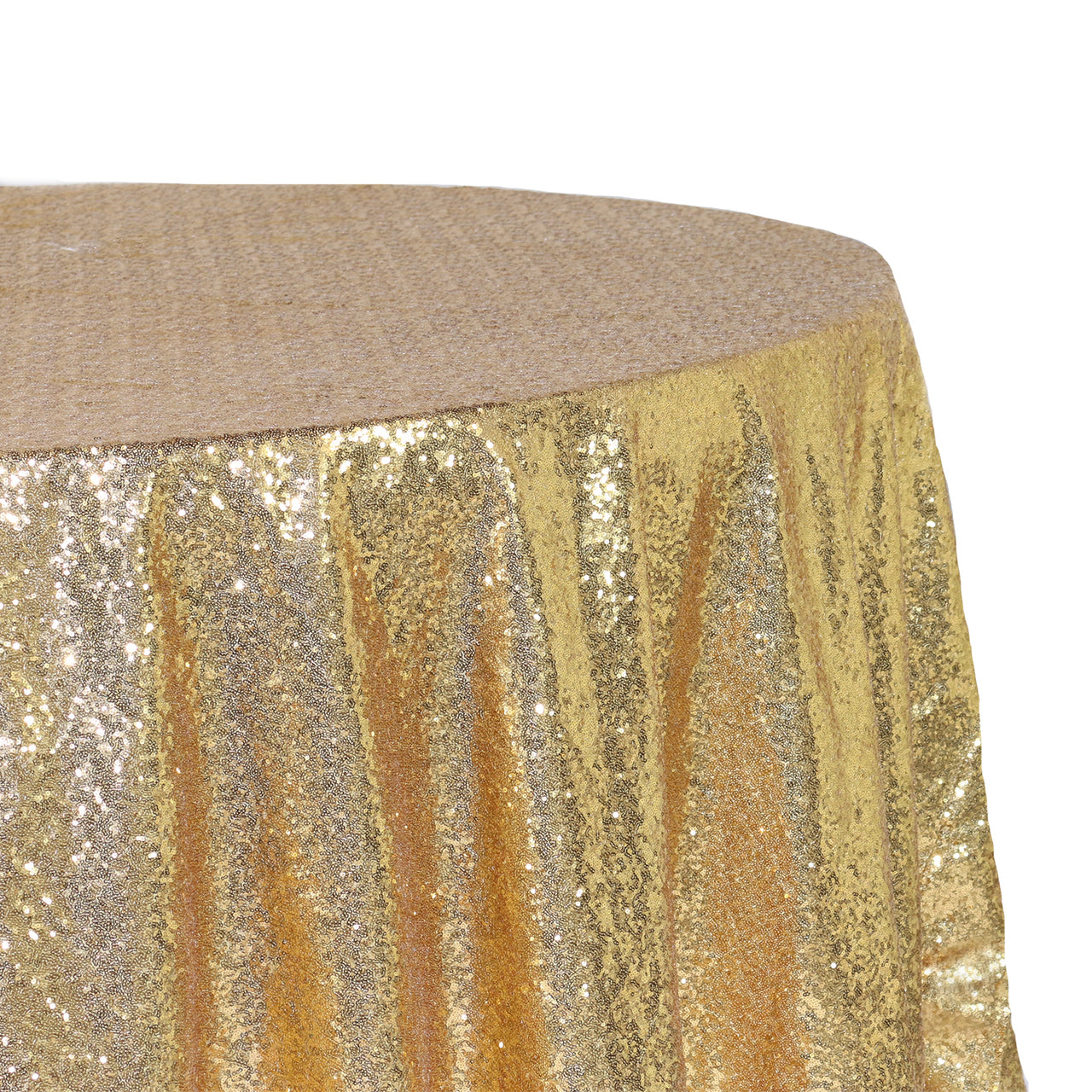 120 inch Round Glitz Sequin Tablecloths in Gold for weddings, special events and corporate parties that demand modern elegance or urban sophistication. Each round sequin tablecloth features intricate and lustrous rows of sequins embedded on a high quality gold taffeta fabric. This specialty table linen is excellent for upscale weddings, Quinceanera birthday parties, Hollywood Glamour inspired events, and other stylish metallic themes. Our 120 round sequin tablecloths are designed to fully drape 5 ft round tables with table height of 30 inches. Planning to use this sequin table linen on a 30" x 42" highboy table? This tablecloth will offer a dramatic three-inch fabric puddle.