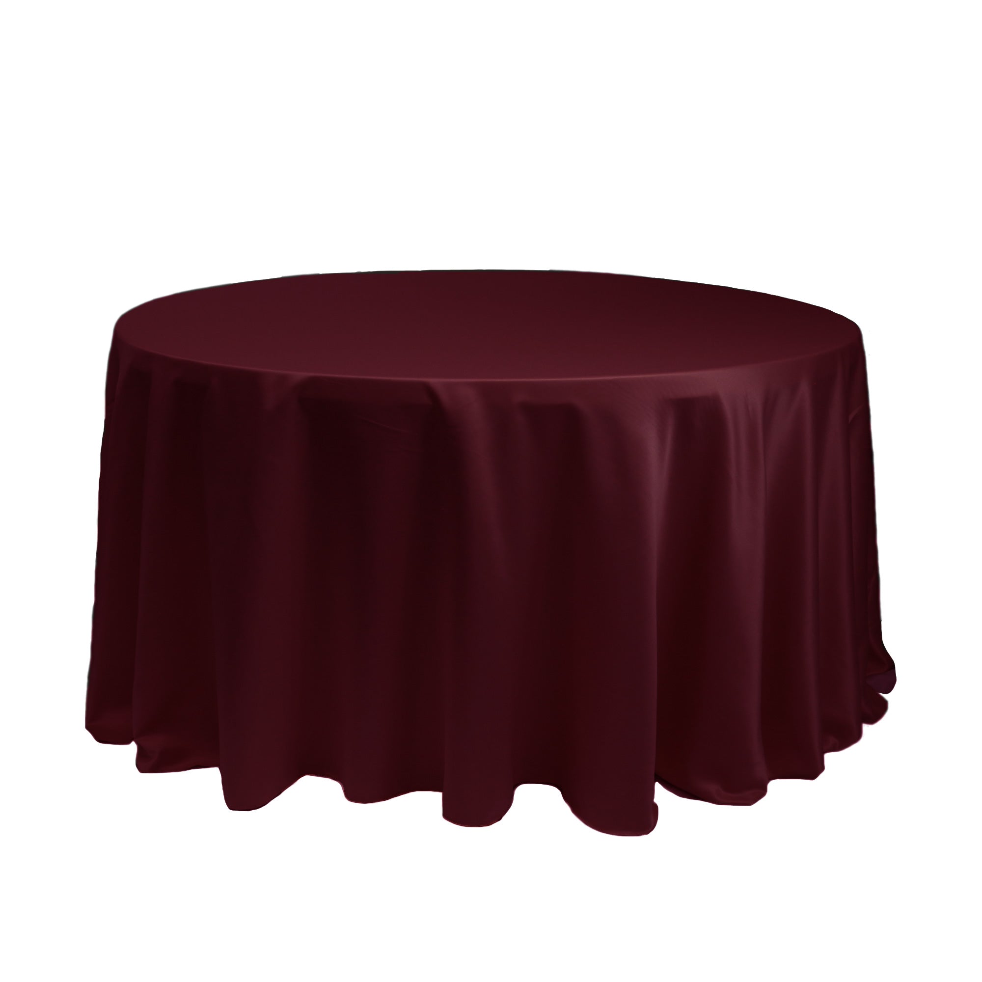 Napkins and Tablecloths. These are the focal points of any luxurious event or elegant wedding reception table. Aside from its main use of being a table linen, our 120 inch l'amour round tablecloth in Burgundy will definitely help you put together a cohesive, wedding design--as far as creating color themed weddings is concerned. These Burgundy tablecloths feature the elegant, matte appearance that lamour fabrics are known for. Use them as a key component of your style palette, just like what event planners would do. Implement style and hue elements by using cloth napkins instead of other wedding decor. As part of our commitment to the wedding industry, we only sell high quality Burgundy lamour tablecloths at affordable, wholesale prices.
