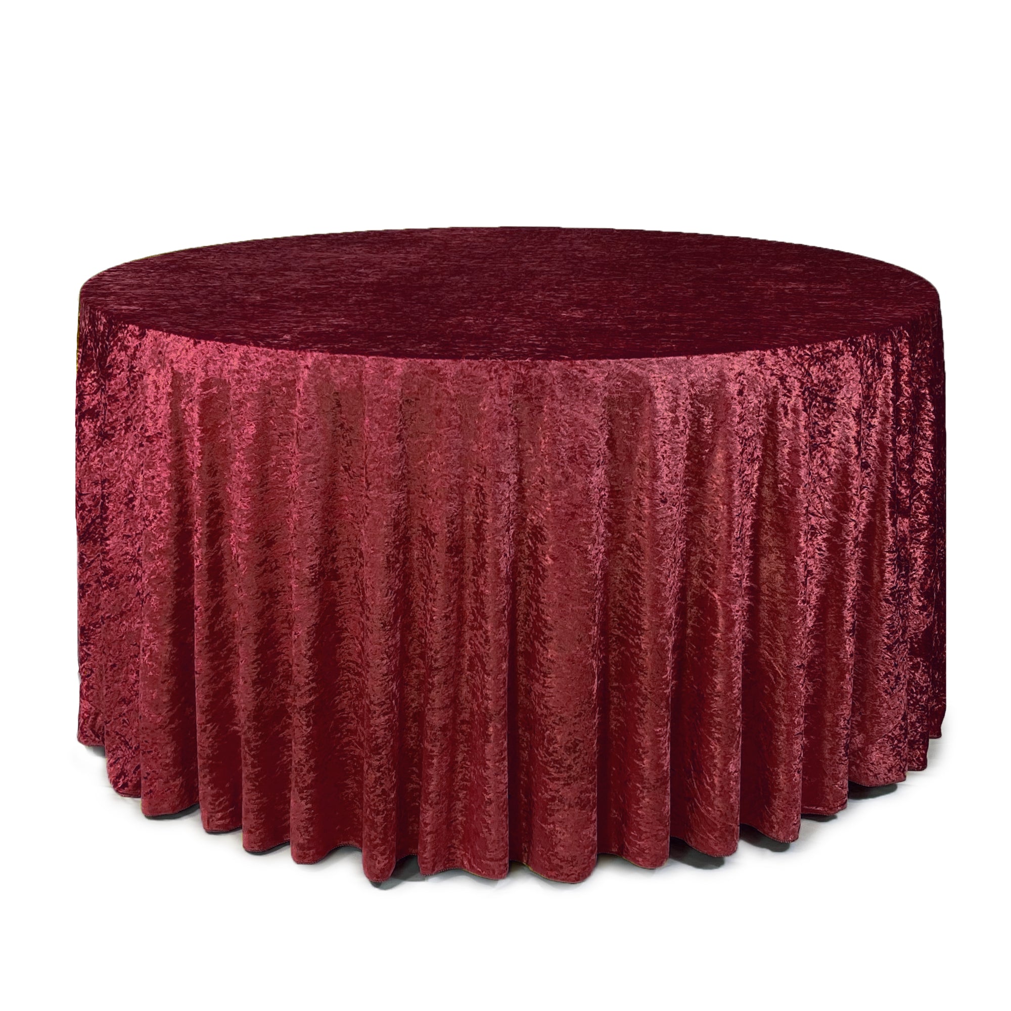 Revamp your event décor with the stunning beauty of our crushed velvet 120-inch round tablecloths – burgundy. The velvety texture and dazzling color combination provide a euphoric and romantic event setting. We continually strive to offer high-quality rental standard tablecloths and our crushed velvet, also known as panne velvet tablecloths, is no exception! Our burgundy 120-inch round crushed velvet tablecloths are primarily designed to provide a floor-length drop on a standard 5-foot round banquet table or provide a 24-inch drop on a 6-foot round banquet table. However, these velvet tablecloths are also ideal for highboy cocktail tables. Our 120-inch round crushed velvet tablecloths can be draped over a 36-inch highboy cocktail table to provide a floor-length drop and on a 30-inch highboy cocktail table to create a 3-inch puddle on the ground.