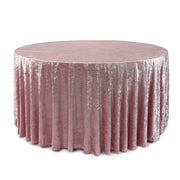 Revamp your event décor with the stunning beauty of our crushed velvet 120-inch round tablecloths – dusty rose. The velvety texture and dazzling color combination provide a euphoric and romantic event setting. We continually strive to offer high-quality rental standard tablecloths and our crushed velvet, also known as panne velvet tablecloths, is no exception! Our dusty rose 120-inch round crushed velvet tablecloths are primarily designed to provide a floor-length drop on a standard 5-foot round banquet table or provide a 24-inch drop on a 6-foot round banquet table. However, these velvet tablecloths are also ideal for highboy cocktail tables. Our 120-inch round crushed velvet tablecloths can be draped over a 36-inch highboy cocktail table to provide a floor-length drop and on a 30-inch highboy cocktail table to create a 3-inch puddle on the ground.