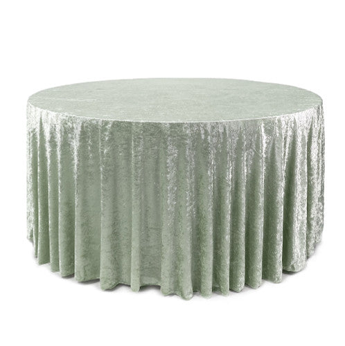 Revamp your event décor with the stunning beauty of our crushed velvet 120-inch round tablecloths – sage. The velvety texture and dazzling color combination provide a euphoric and romantic event setting. We continually strive for offer high-quality rental standard tablecloths and our crushed velvet, also known as panne velvet tablecloths, are no exception! Our sage 120-inch round crushed velvet tablecloths are primarily designed to provide a floor-length drop on a standard 5-foot round banquet table or provide a 24-inch drop on a 6-foot round banquet table. However, these velvet tablecloths are also ideal for highboy cocktail tables. Our 120-inch round crushed velvet tablecloths can be draped over a 36-inch highboy cocktail table to provide a floor-length drop and on a 30-inch highboy cocktail table to create a 3-inch puddle on the ground.