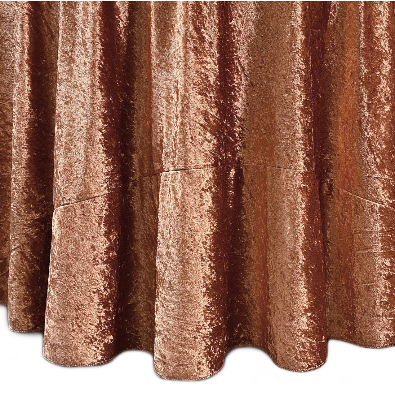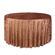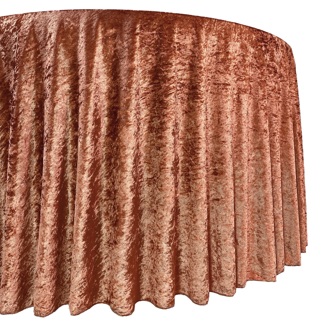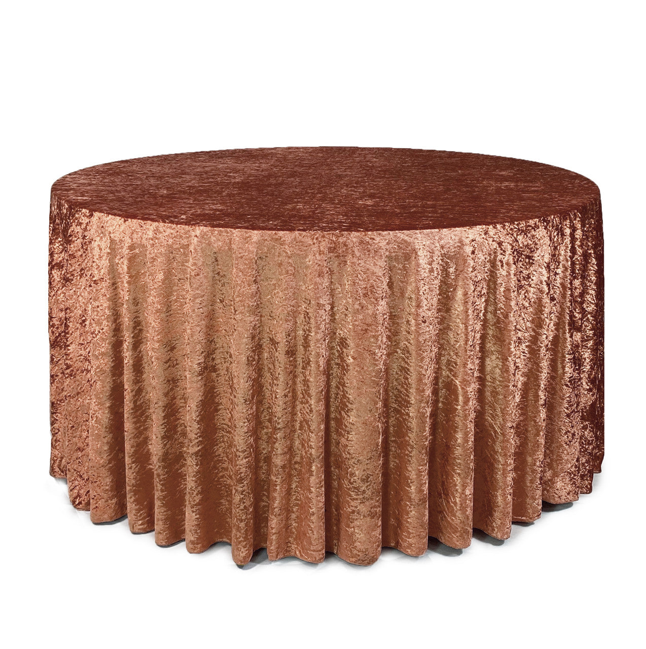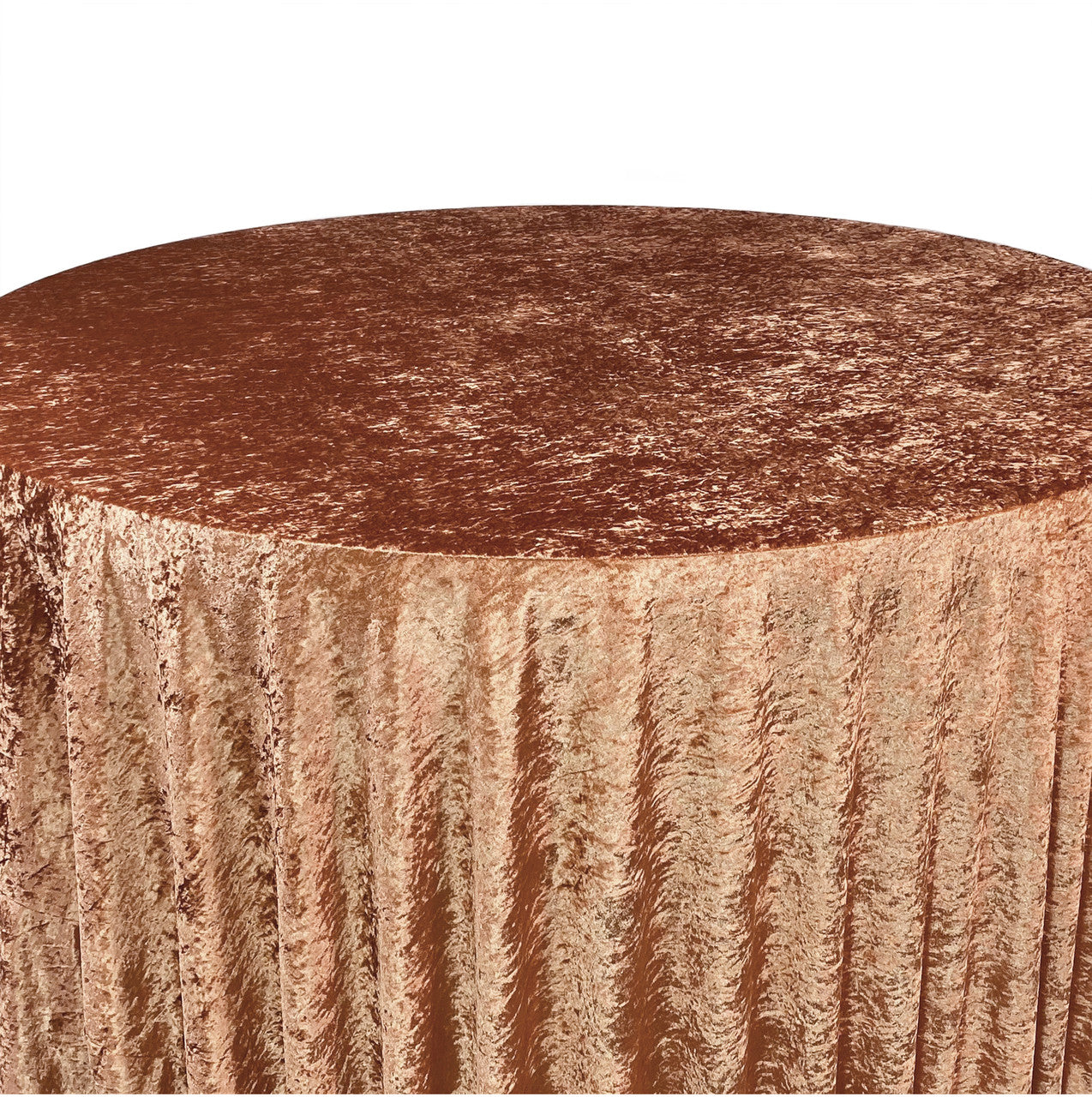 Revamp your event décor with the stunning beauty of our crushed velvet 120-inch round tablecloths – terracotta. The velvety texture and dazzling color combination provide a euphoric and romantic event setting. We continually strive for offer high-quality rental standard tablecloths and our crushed velvet, also known as panne velvet tablecloths, are no exception! Our terracotta 120-inch round crushed velvet tablecloths are primarily designed to provide a floor-length drop on a standard 5-foot round banquet table or provide a 24-inch drop on a 6-foot round banquet table. However, these velvet tablecloths are also ideal for highboy cocktail tables. Our 120-inch round crushed velvet tablecloths can be draped over a 36-inch highboy cocktail table to provide a floor-length drop and on a 30-inch highboy cocktail table to create a 3-inch puddle on the ground.