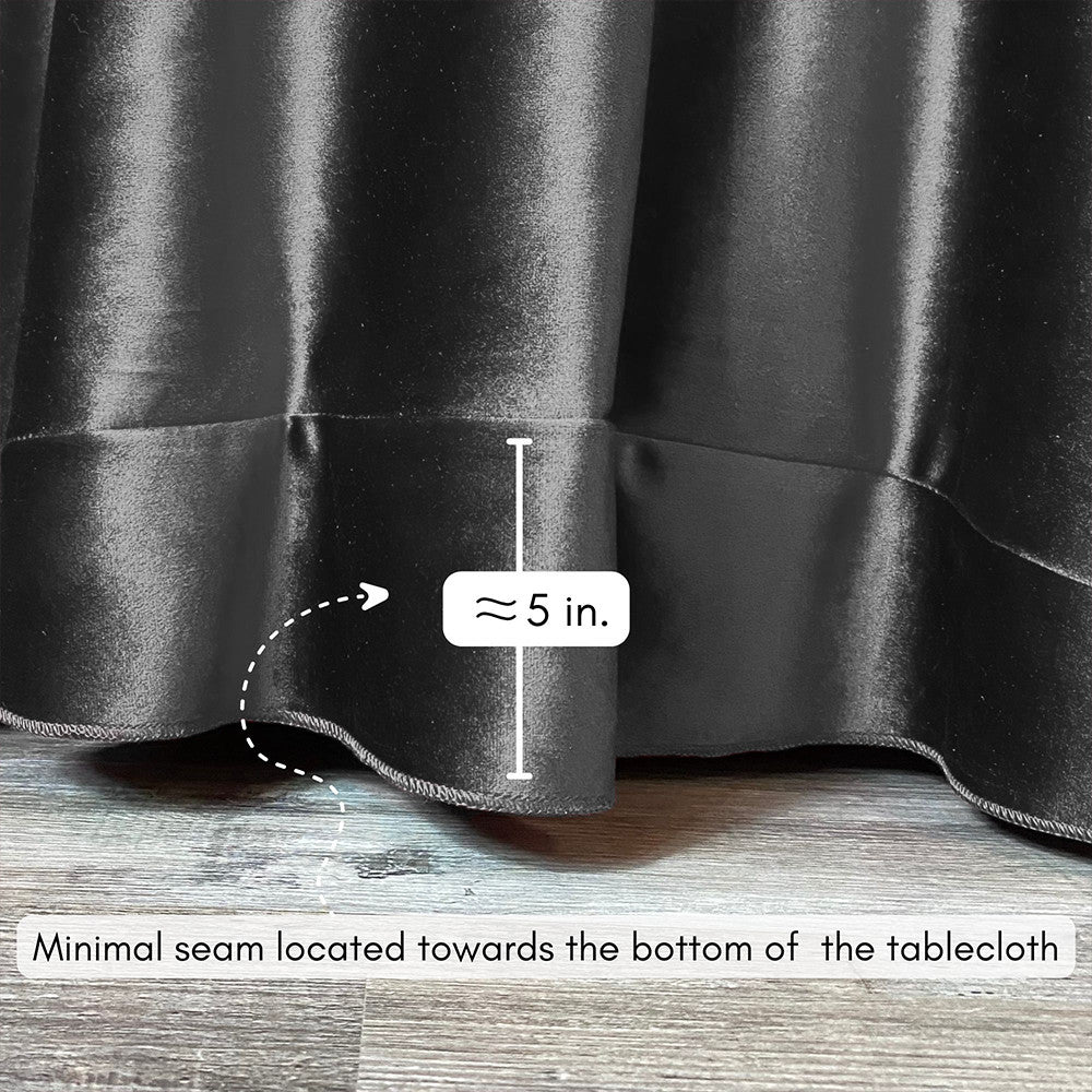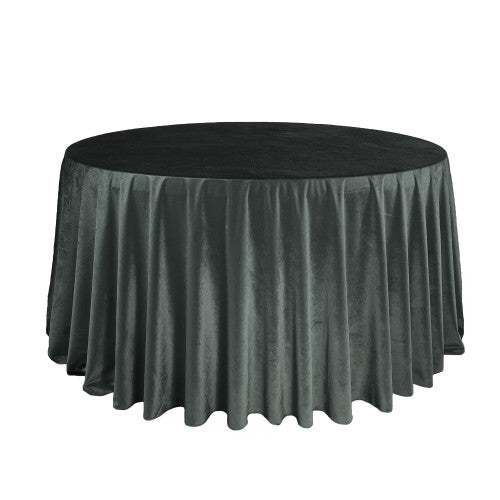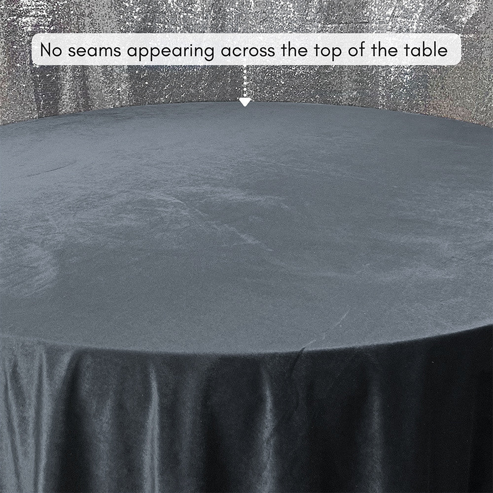 Experience the lap of luxury with the majestic look and feel of our 120 in. Round Velvet Tablecloths - Black. This premium velvet tablecloth provides the ultimate level of elegance that captures the essence of pure royalty. We continually strive to provide high-quality rental standard tablecloths and these plain velvet tablecloths are no exception. Our 120 in. Round Velvet Tablecloths in black are primarily designed to provide a floor-length drop on a standard 5 ft. round banquet table or provide a 24 in. drop on a 6 ft. round banquet table. We have made certain that the round premium velvet tablecloths will not have any seams appearing across the top of the table whether you are using a 5 ft. or 6 ft. round table. Each round tablecloth features a large 110-in wide middle piece ensuring minimal seams to enhance their elegance. Additionally, the serged finish and high-quality 275GSM velvet fabric will set the standard of sophistication further magnifying your event.