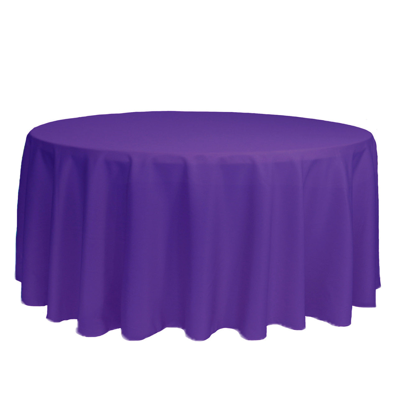 132 inch polyester round tablecloths in purple are designed to fully drape the most common larger tables used in banquet halls or wedding reception centers--the 72 inch round table or 6 ft round table with 30 inch height. Meaning, a 132-inch purple round tablecloth will drop all the way to the floor, giving the table an elegant appearance. High quality large round tablecloths are a rare find in the wedding industry and Bridal Tablecloths is dedicated to supply these types of round table linens. Aside from that fact that it's fully drapable, wedding planners and fine-dining professionals prefer to use purple 132 inch rounds over other wedding linen tablecloths due to their matte finish, durability plus stain and wrinkle resistant properties.