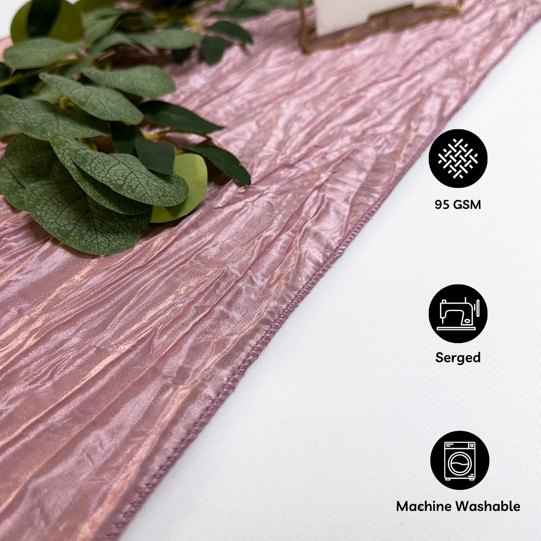 Designed to complement wedding tablecloths, crinkle taffeta table runners in dusty rose have always been the go-to reception table accent for wedding planners, event coordinators, and fine dining professionals. These 14 x 108-inch dusty rose table runners feature the textured look of crushed or crinkled dusty rose taffeta. Each dusty rose crinkle taffeta runner is luxurious to the touch, wide enough for wedding reception tables and adds the perfect hint of glam and color.
