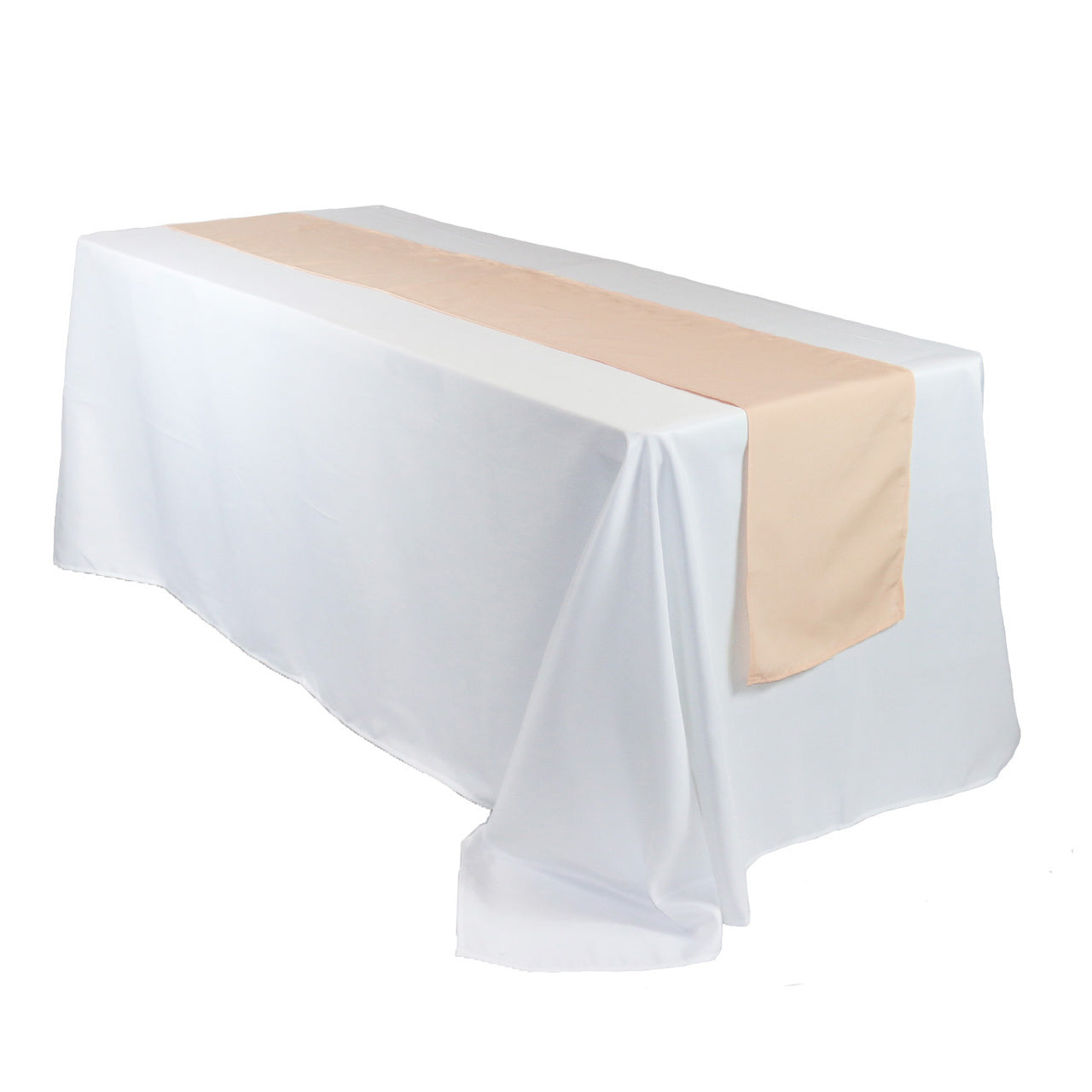 Designed to complement wedding tablecloths, polyester table runners in peach have always been the go-to reception table accent for wedding planners, event coordinators and fine dining professionals. These 14 x 108 inch peach table runners feature the matte appearance and subtle elegance of peach polyester. Each peach polyester runner is luxurious to the touch, wide enough for wedding reception tables, and adds the perfect hint of glam and color.