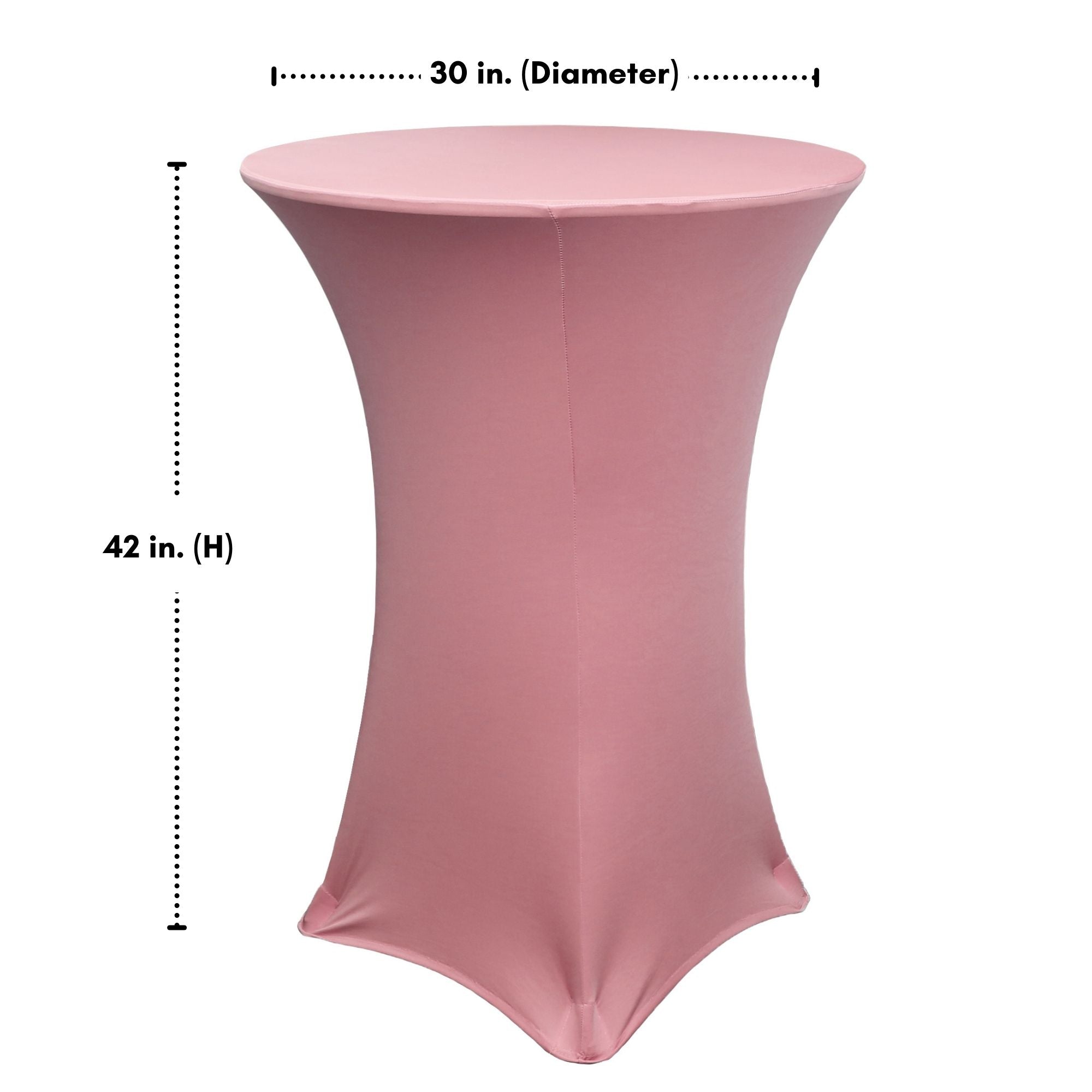 Made from high-quality four-way stretch spandex material, our dusty rose stretch spandex 30-inch round highboy cocktail table covers exemplify modern sophistication and luxurious elegance. They are designed to fit 30" round highboy tables with 42" height at weddings, casinos, hotels, restaurants, and other special events. Dusty Rose spandex highboy tablecloths from Bridal Tablecloths have deep canvas foot pockets, are durable, do not require ironing, and can be laundered countless times. Please note that there are inferior and cheaper versions of this material available in the market, ours is crafted from a hotel and restaurant quality spandex type of material.