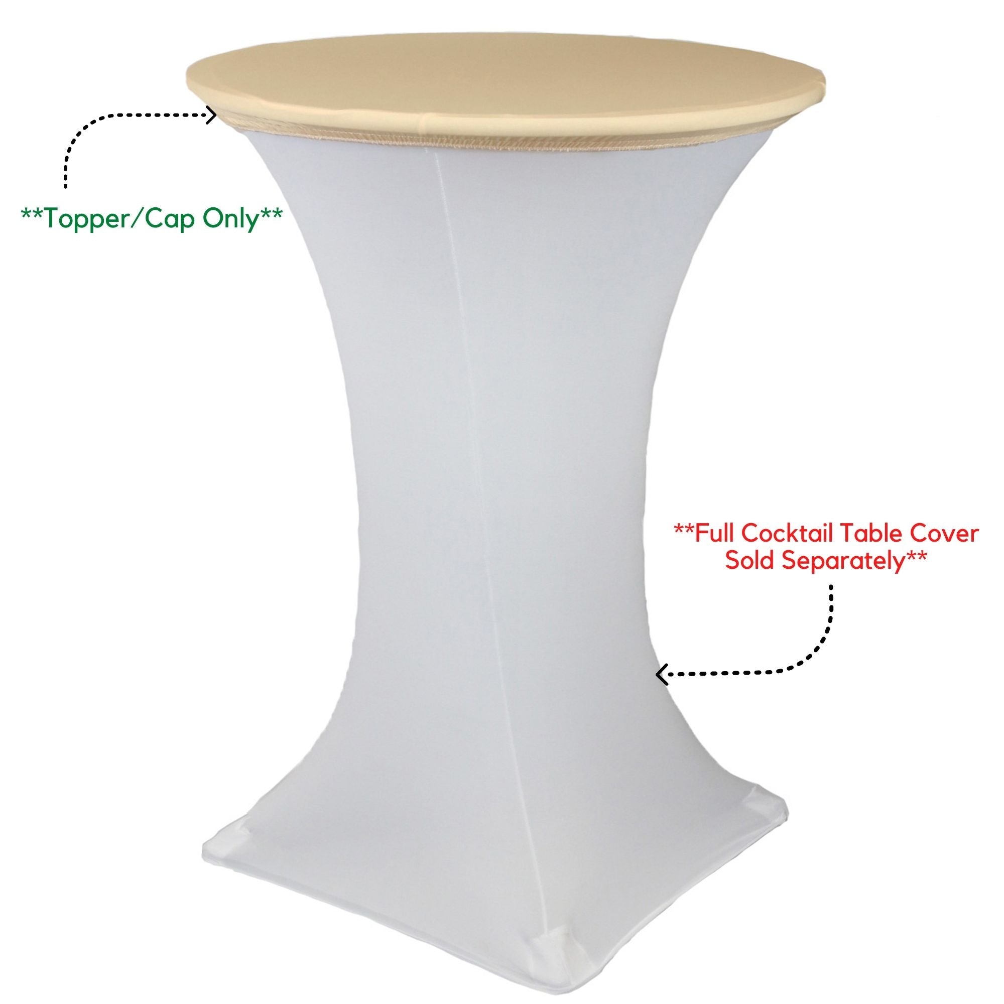Enhance the look of your highboy or lowboy cocktail tables with our 30 inch Spandex Table Toppers in champagne. Use our high quality 30 inch stretch spandex table toppers over stretch spandex table covers (sold separately) to complete the look of your wedding and event tables! Made from high quality four-way stretch spandex material, our 30 inch stretch spandex table toppers in champagne exemplify modern sophistication and luxurious elegance. They are designed to fit 30" round highboy or lowboy tables at weddings, casinos, hotels, restaurants and other special events.
