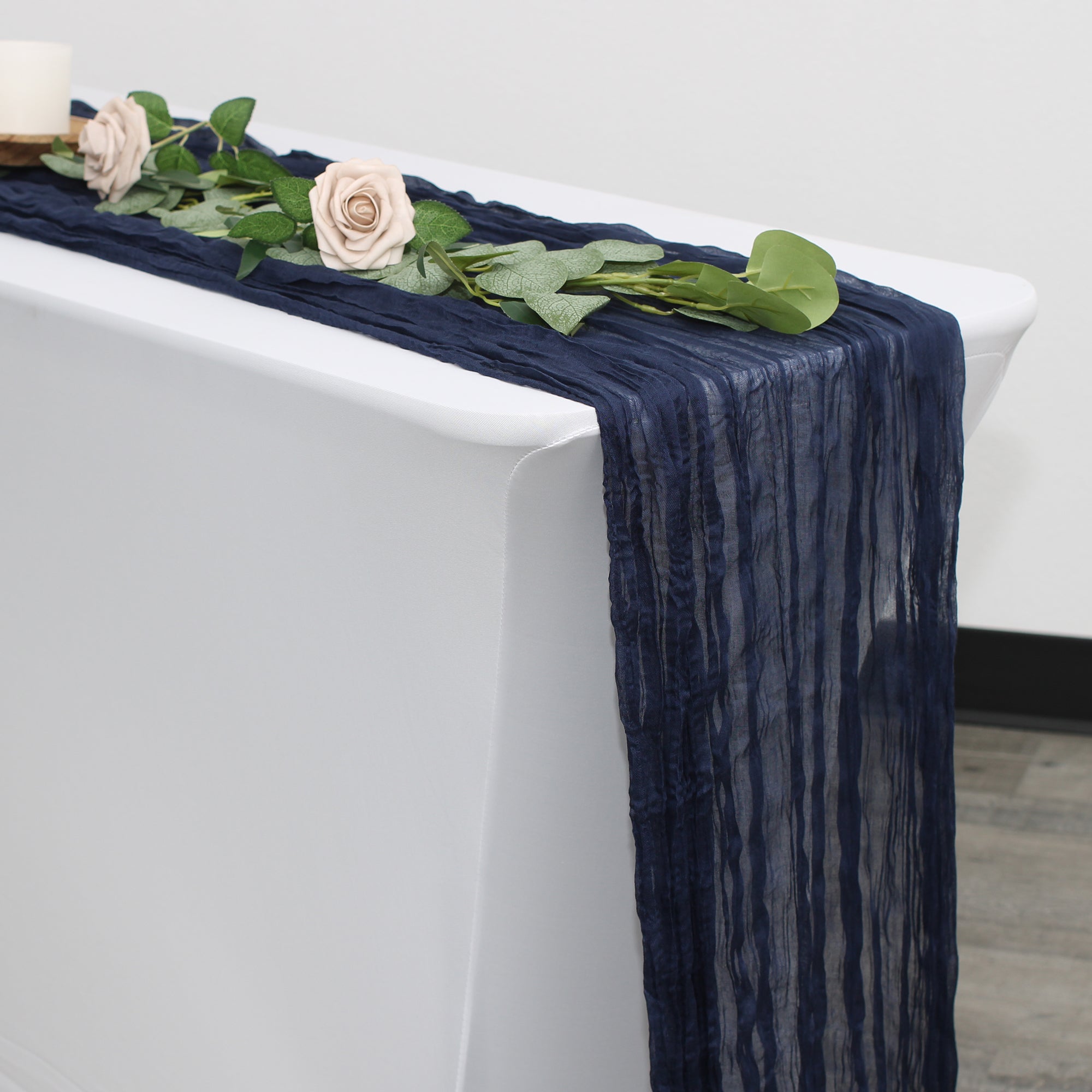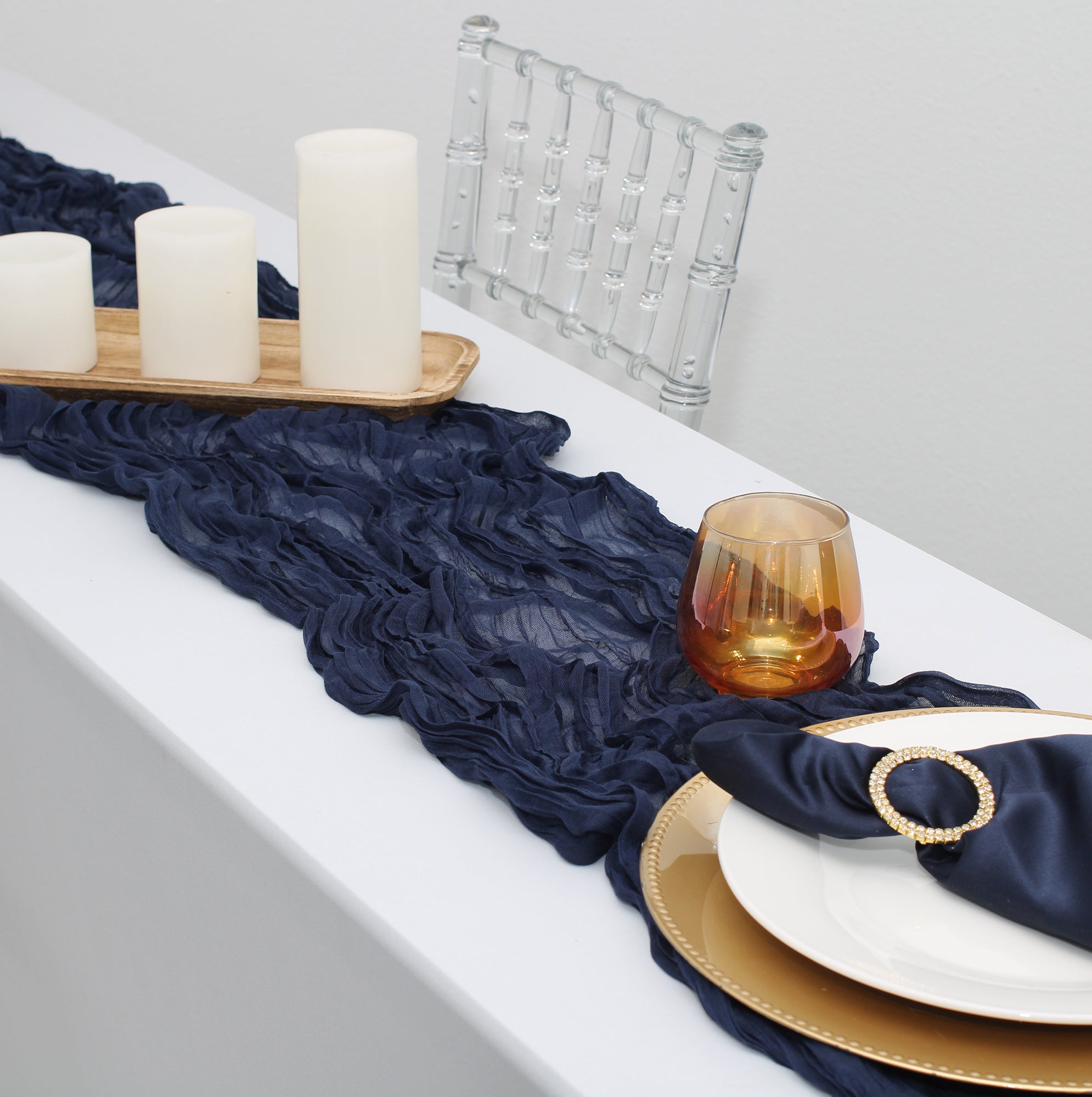 Gauze Cheesecloth Table Runner in Navy Blue is the perfect addition to elevate your table setting with a soft, romantic touch. Made from lightweight, semi-sheer gauze fabric, it drapes elegantly across long tables, providing a delicate, airy feel. The navy blue color adds a subtle, warm hue, ideal for weddings, baby showers, or any special occasion where a gentle, feminine ambiance is desired. Its extra-long length ensures it fits a variety of table sizes, while the raw, unfinished edges give a chic, rustic look. Perfect for layering or using as a standalone centerpiece accent.
