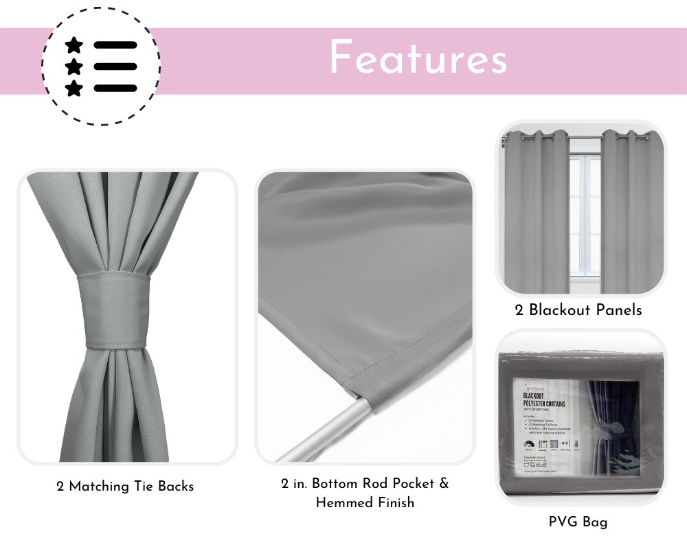 Blackout Polyester Curtains in gray are made from high-quality polyester material. These multipurpose curtains can be used to add allure and supplemental beauty for weddings, trade shows, or your home. Our blackout polyester curtains include 2 soft drapable blackout curtain panels; each panel measures 42 inches wide x 84 inches long and features 8 large plastic decorative grommets on top and a 2 inch bottom rod pocket for different styling options. Additionally, blackout polyester curtains provide privacy and are energy efficient. These blackout polyester curtains are sure to exquisitely compliment your décor and create a beautiful setting in any room.