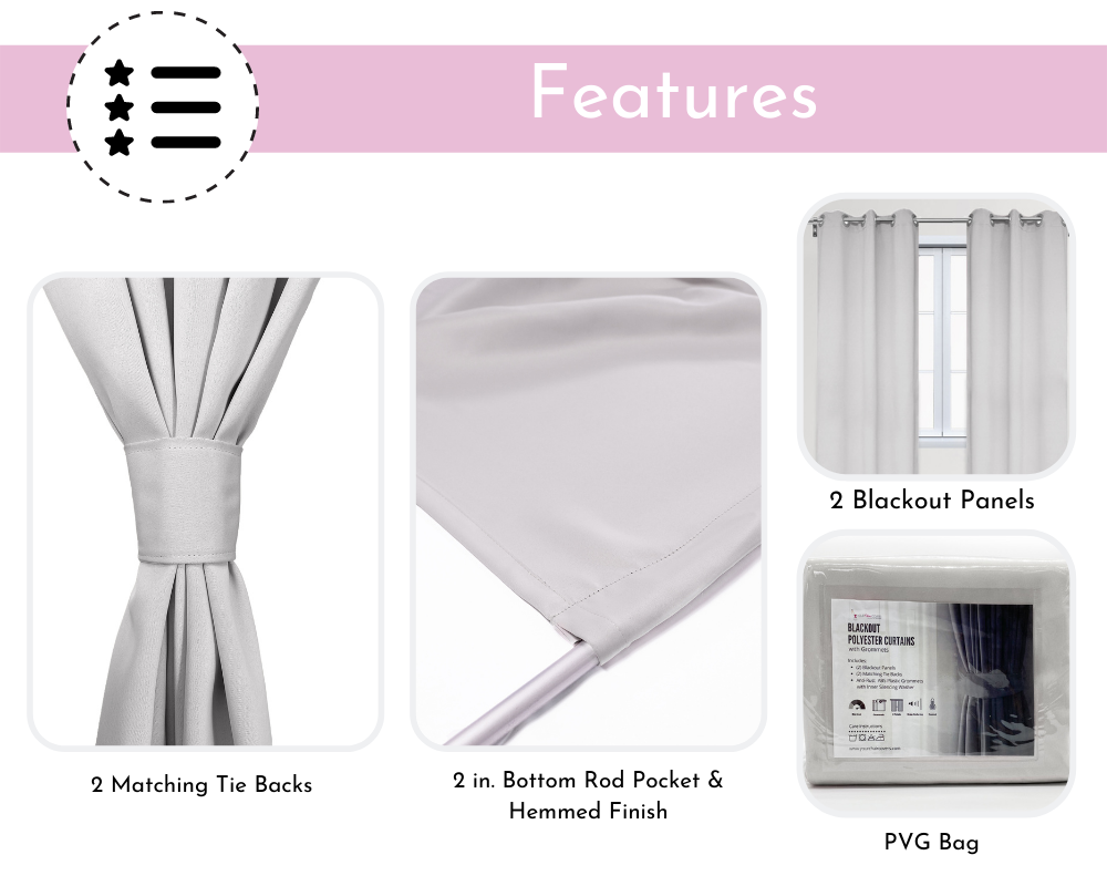 Blackout Polyester Curtains in grayish white are made from high-quality polyester material. These multipurpose curtains can be used to add allure and supplemental beauty for weddings, trade shows, or your home. Our blackout polyester curtains include 2 soft drapable blackout curtain panels; each panel measures 52 inches wide x 63 inches long and features 8 large plastic decorative grommets on top and a 2 inch bottom rod pocket for different styling options. Additionally, blackout polyester curtains provide privacy and are energy efficient. These blackout polyester curtains are sure to exquisitely compliment your décor and create a beautiful setting in any room.