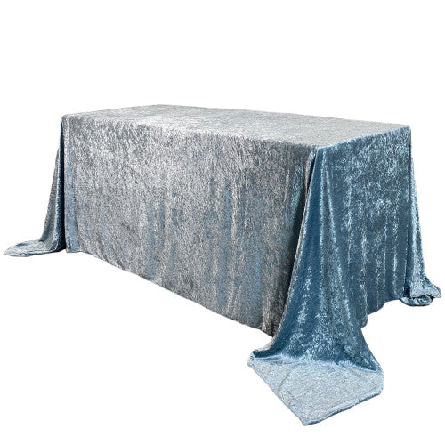 Revamp your event décor with the stunning beauty of our dusty blue Crushed Velvet 90 x 132-inch Rectangular Tablecloths. The velvety texture and dazzling color combination provide a euphoric and romantic event setting. Crafted from high-quality 190 GSM crushed velvet fabric also known as panne velvet, our 90 x 132-inch rectangular crushed velvet tablecloths in dusty blue are designed to provide a floor-length drop on a standard 6-foot rectangular table with a 30-inch height. Additionally, each tablecloth is seamless and features a serged finish setting the standard of sophistication further magnifying your event.