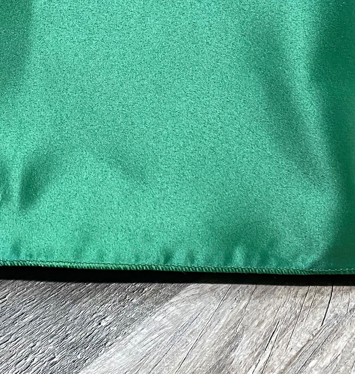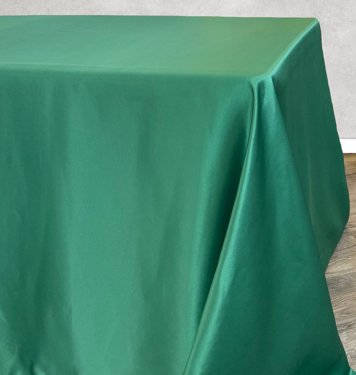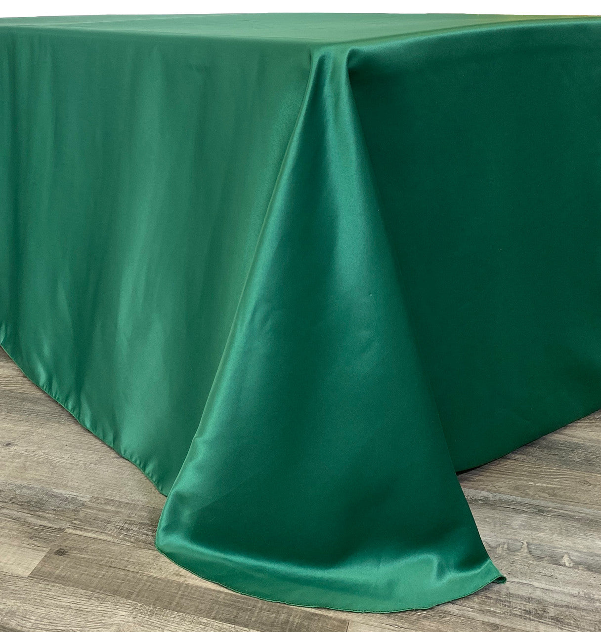 PREMIUM QUALITY 90 x 132 INCH RECTANGULAR L'AMOUR TABLECLOTHS. Not to be confused with the regular silky and shiny satin, 90 x 132 inch L'amour Tablecloths in Emerald Green combine the silky feel of satin and the matte sophistication that L'amour fabrics are known for. L'amour table linens feature rounded corners, a tempered sheen and they are noticeably thicker than other wedding tablecloths that you will find at comparable prices. Who needs to rent tablecloths when you can buy them cheaper?