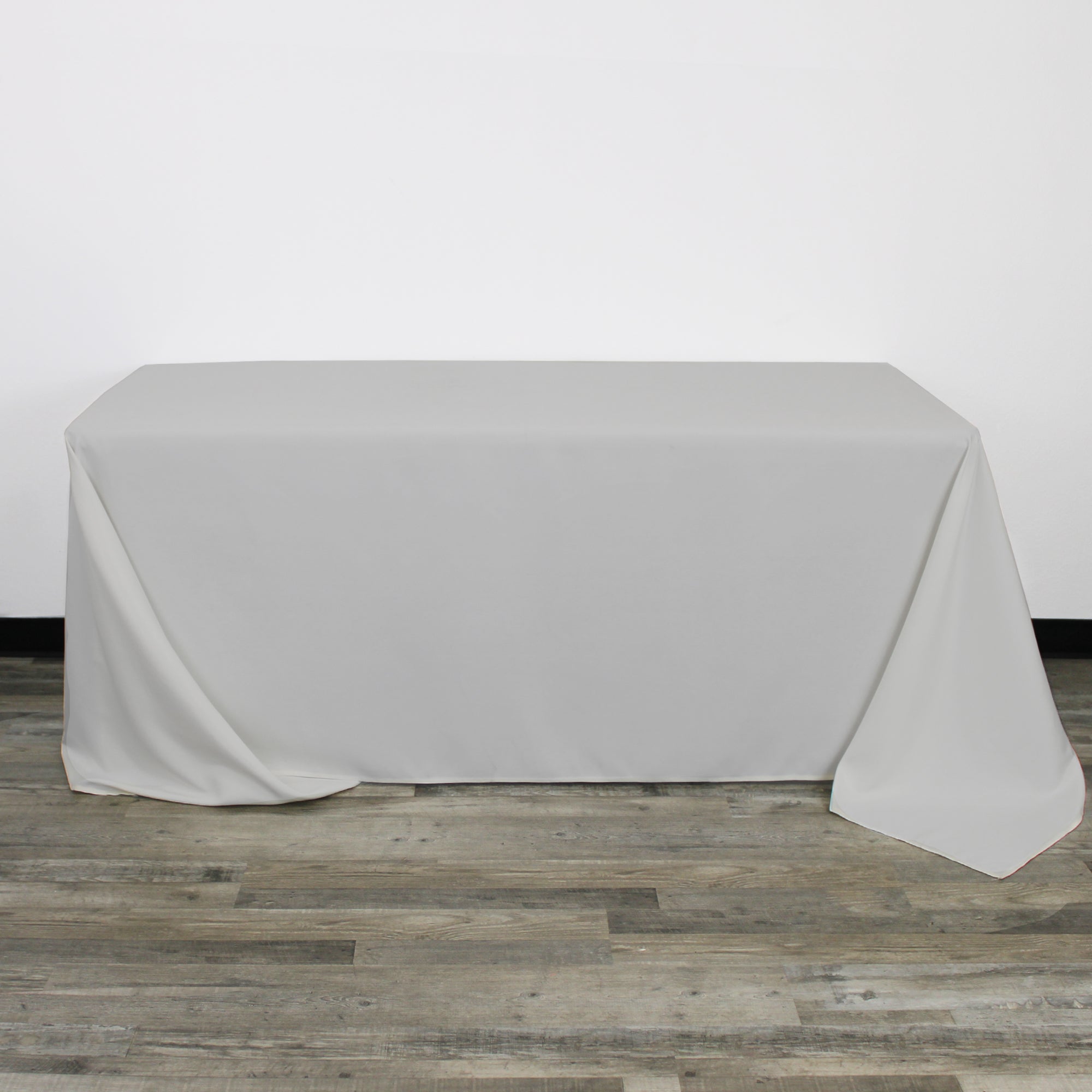 90 x 156 inch polyester rectangular tablecloths in silver are designed to fully drape 96 inch rectangular tables or 8 ft rectangle tables with 30 inch height. Meaning, a 90 x 156-inch silver rectangular poly tablecloth will drop all the way to the floor, giving the table an elegant appearance. High quality large rectangle tablecloths are a rare find in the wedding industry and Bridal Tablecloths is dedicated to supply these types of rectangular table linens. Aside from that fact that it's fully drapable, wedding planners and fine-dining professionals prefer to use silver 90 x 156 inch rectangle tablecloths over other wedding linen tablecloths due to their matte finish, durability plus stain and wrinkle resistant properties.