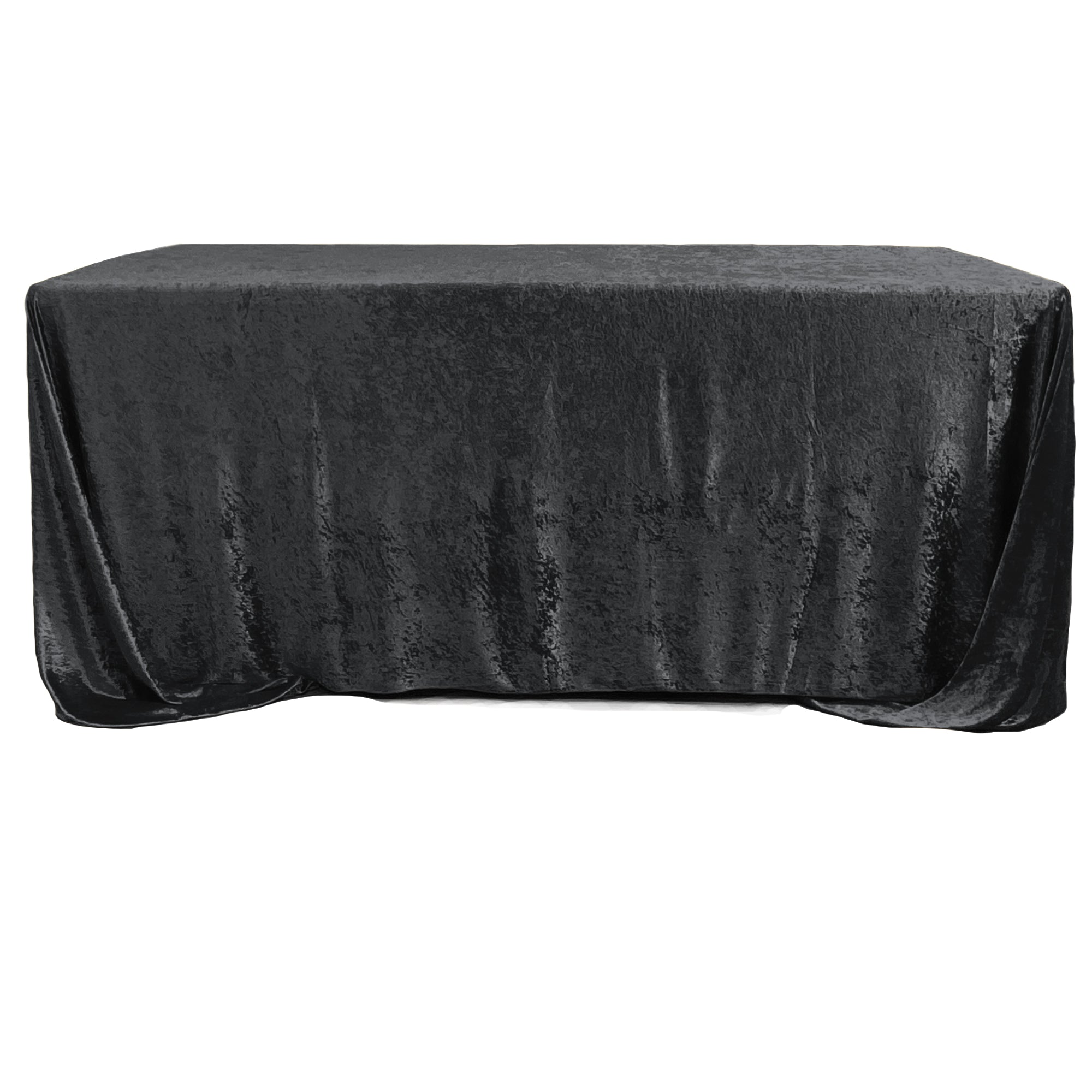Revamp your event décor with the stunning beauty of our Black Crushed Velvet 90 x 156-inch Rectangular Tablecloths. The velvety texture and dazzling color combination provide a euphoric and romantic event setting. Crafted from high-quality 190 GSM crushed velvet fabric also known as panne velvet, our 90 x 156-inch rectangular crushed velvet tablecloths in black are designed to provide a floor-length drop on a standard 8-foot rectangular table with a 30-inch height. Additionally, each tablecloth is seamless and features a serged finish setting the standard of sophistication further magnifying your event.