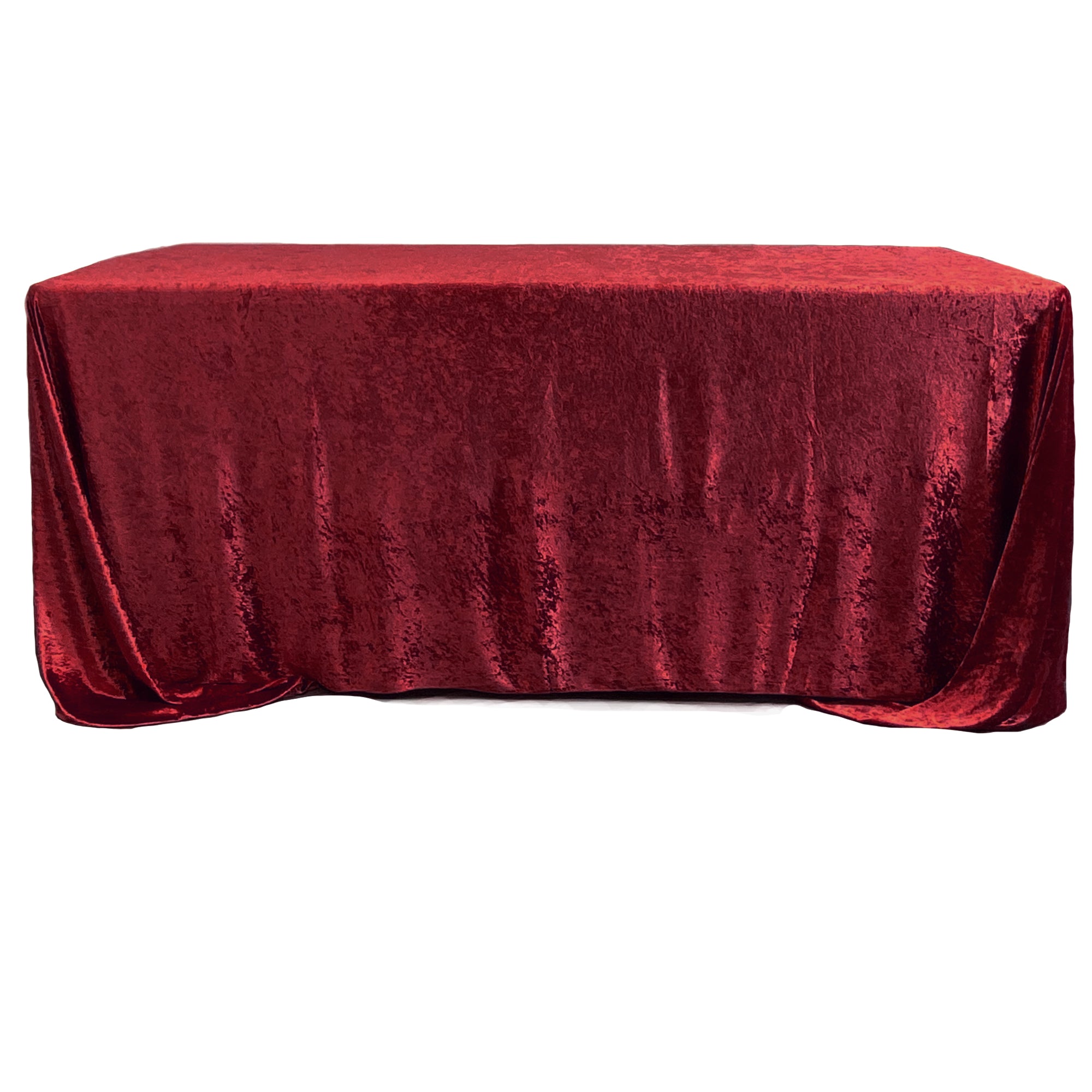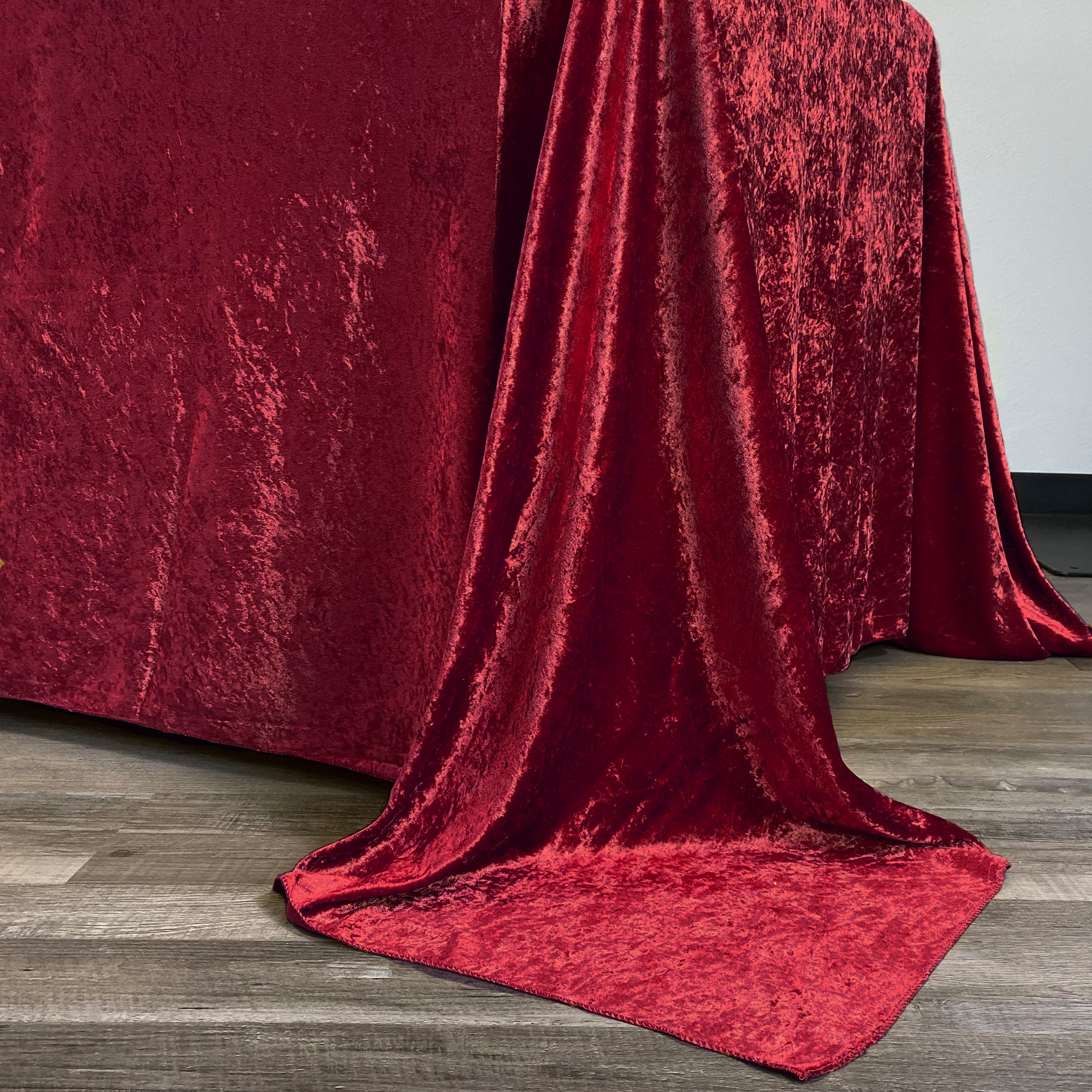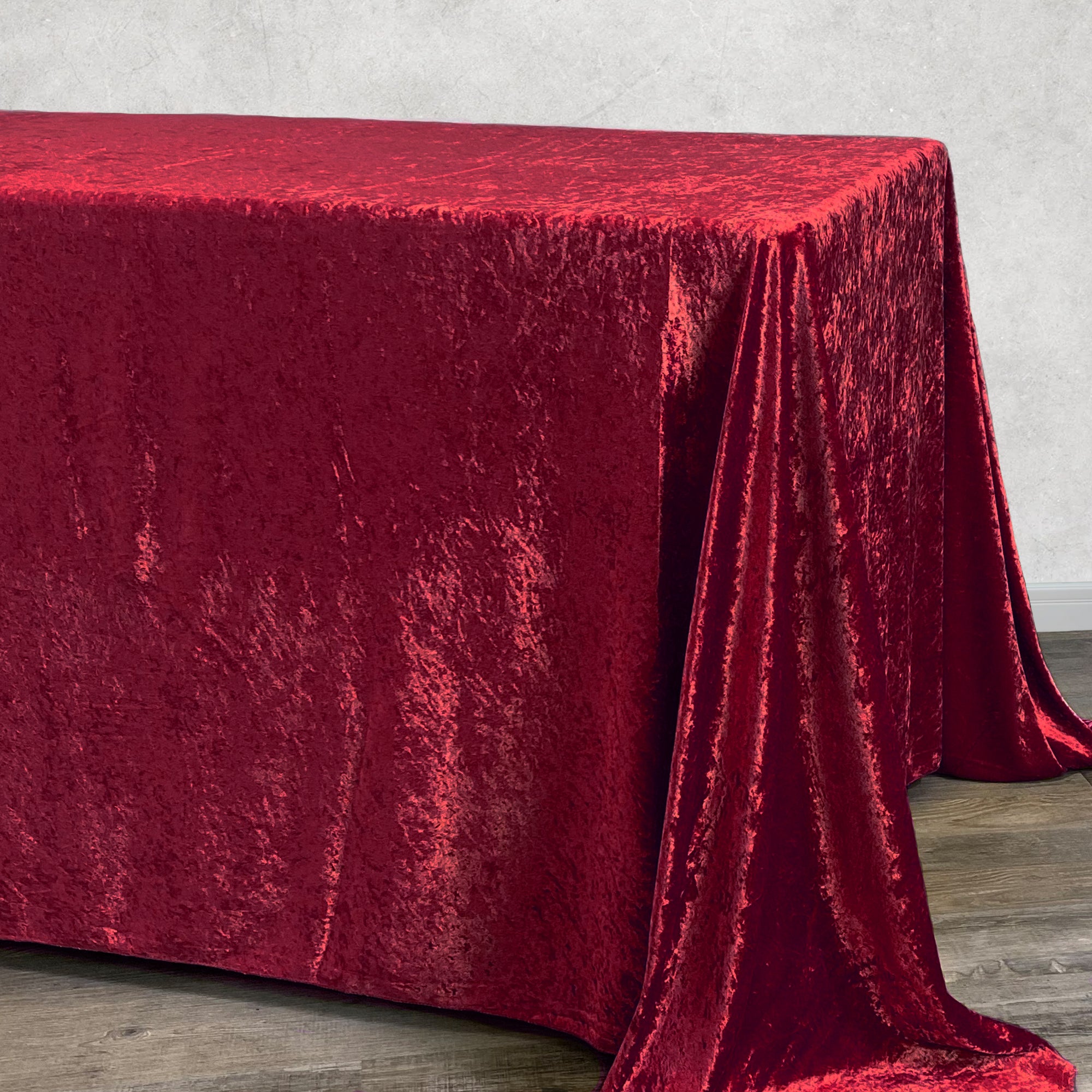 Revamp your event décor with the stunning beauty of our burgundy Crushed Velvet 90 x 156-inch Rectangular Tablecloths. The velvety texture and dazzling color combination provide a euphoric and romantic event setting. Crafted from high-quality 190 GSM crushed velvet fabric also known as panne velvet, our 90 x 156-inch rectangular crushed velvet tablecloths in burgundy are designed to provide a floor-length drop on a standard 8-foot rectangular table with a 30-inch height. Additionally, each tablecloth is seamless and features a serged finish setting the standard of sophistication further magnifying your event.
