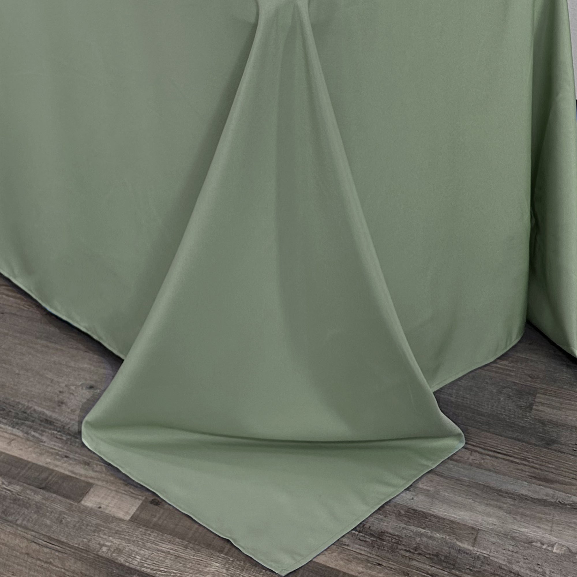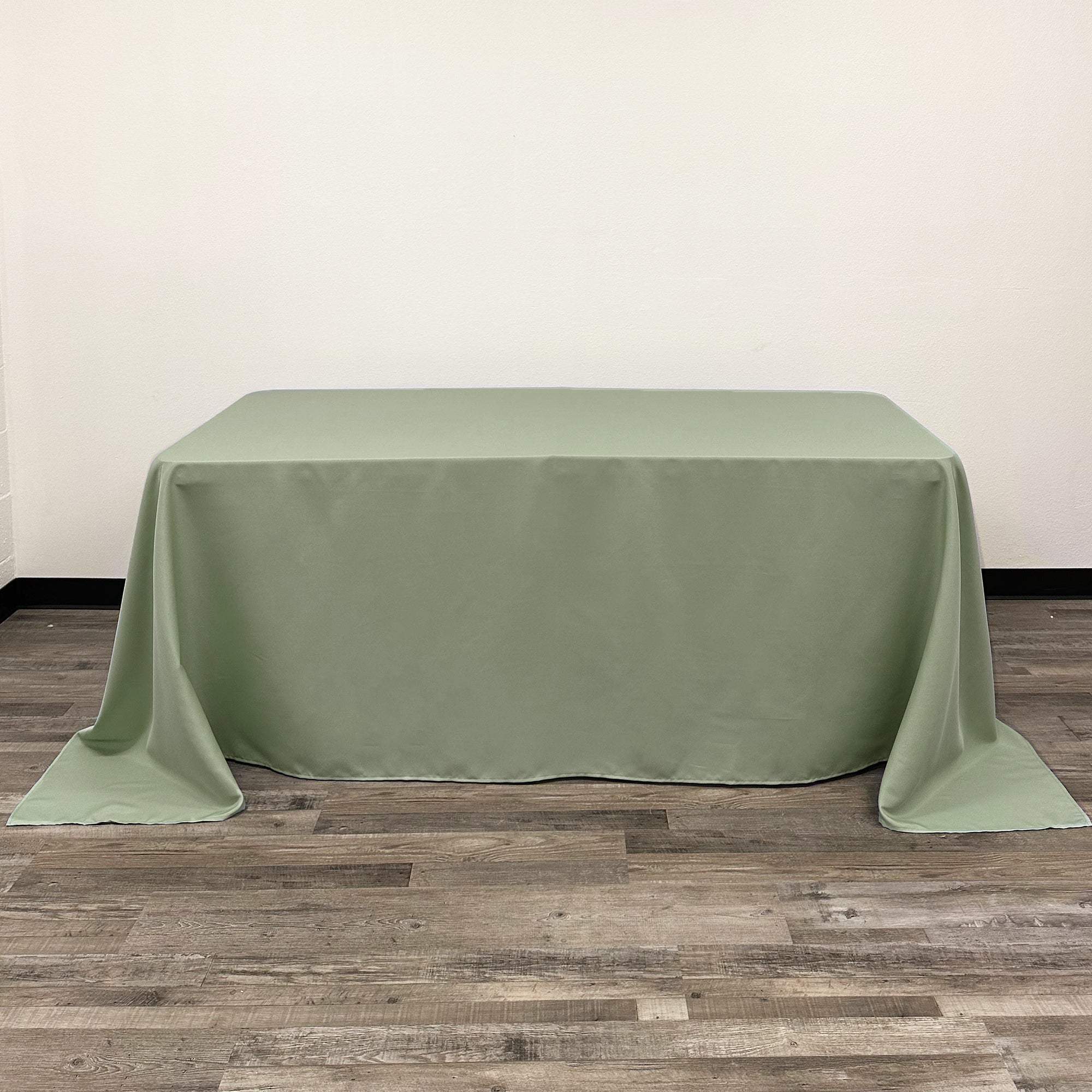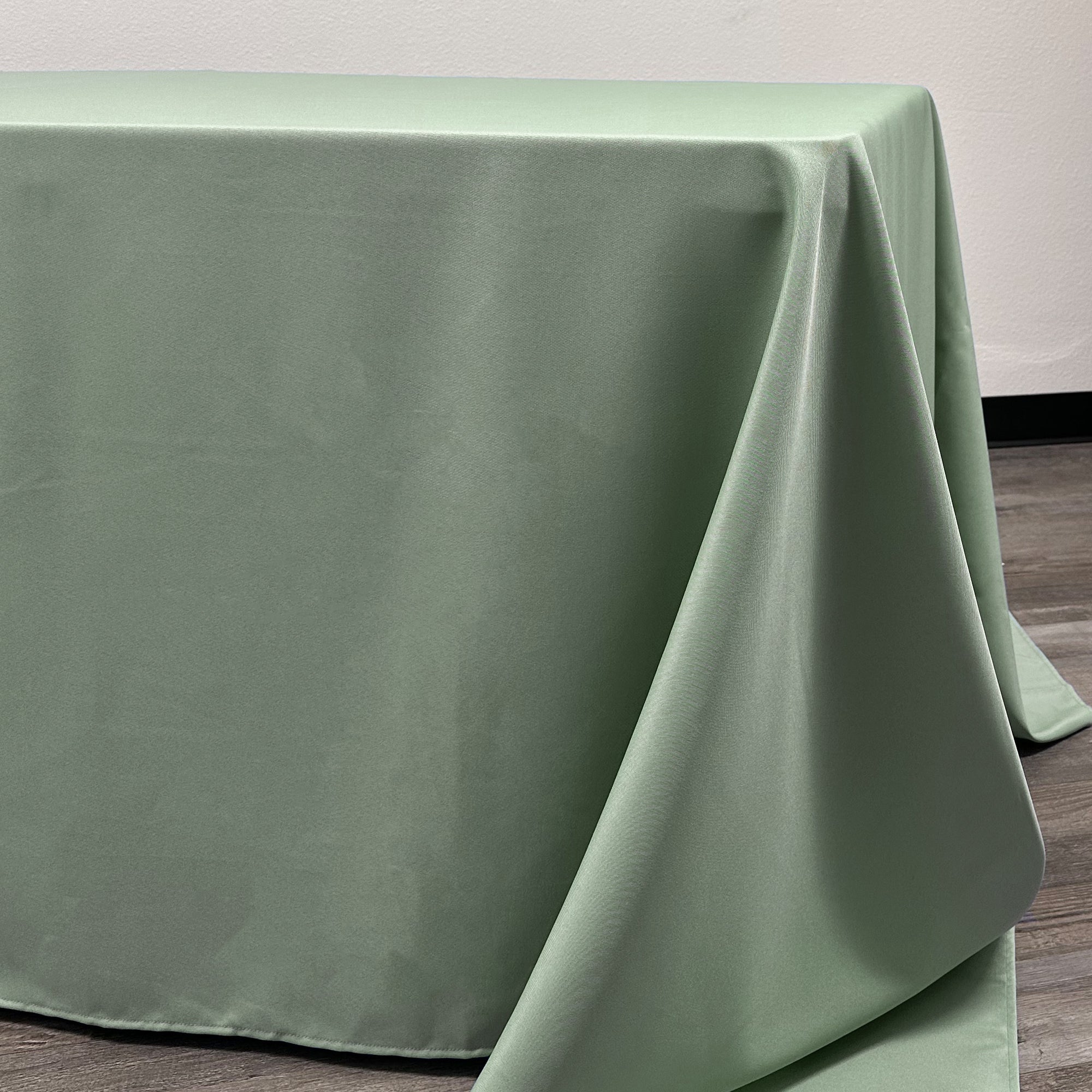 90 x 156 inch polyester rectangular tablecloths in sage are designed to fully drape 96 inch rectangular tables or 8 ft rectangle tables with 30 inch height. Meaning, a 90 x 156-inch sage rectangular poly tablecloth will drop to the floor, giving the table an elegant appearance. High quality large rectangle tablecloths are a rare find in the wedding industry and Bridal Tablecloths is dedicated to supplying these types of rectangular table linens. Aside from that fact that it's fully drapable, wedding planners and fine-dining professionals prefer to use sage 90 x 156 inch rectangle tablecloths over other wedding linen tablecloths due to their matte finish, durability plus stain and wrinkle resistant properties.