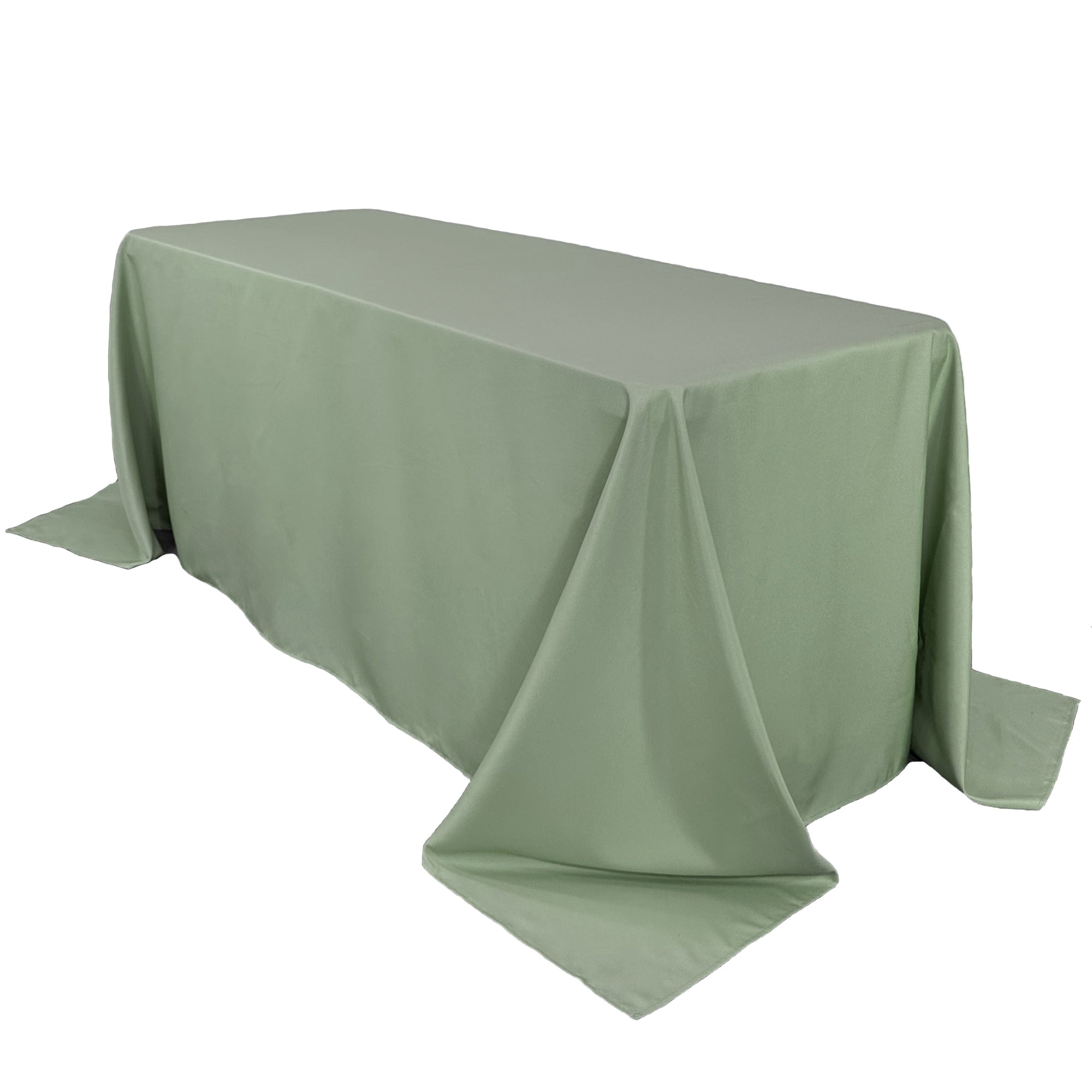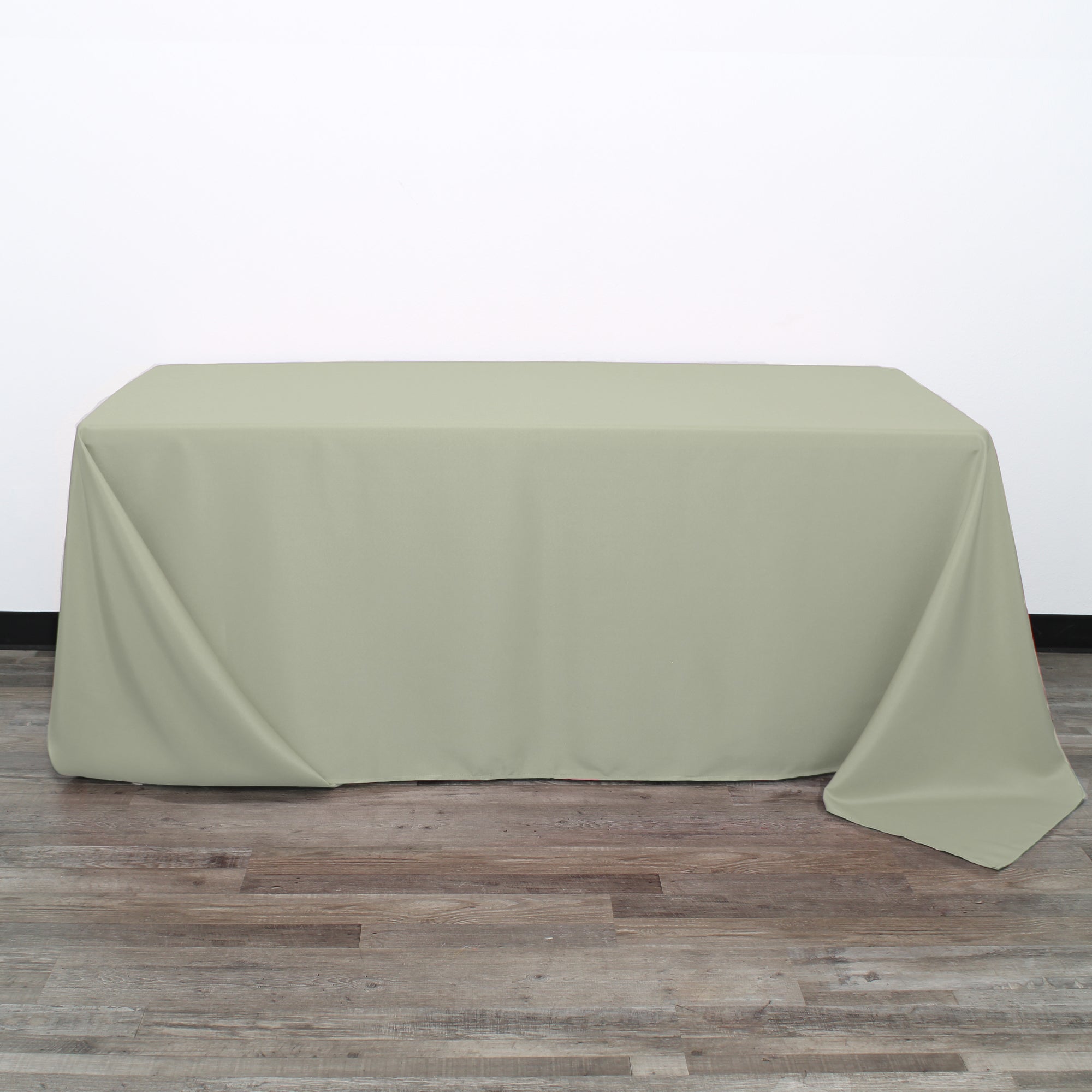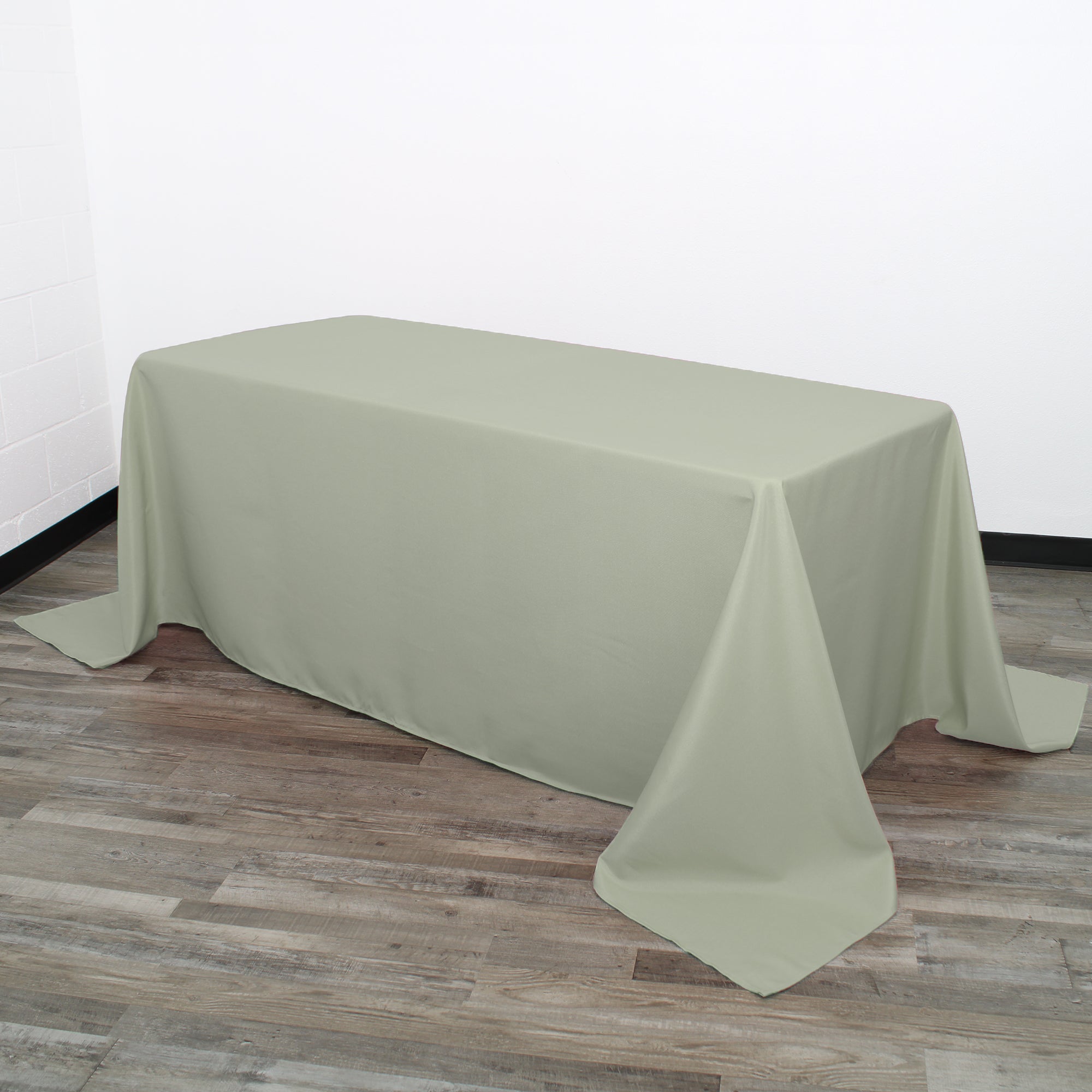 90 x 156 inch polyester rectangular tablecloths in sage are designed to fully drape 96 inch rectangular tables or 8 ft rectangle tables with 30 inch height. Meaning, a 90 x 156-inch sage rectangular poly tablecloth will drop to the floor, giving the table an elegant appearance. High quality large rectangle tablecloths are a rare find in the wedding industry and Bridal Tablecloths is dedicated to supplying these types of rectangular table linens. Aside from that fact that it's fully drapable, wedding planners and fine-dining professionals prefer to use sage 90 x 156 inch rectangle tablecloths over other wedding linen tablecloths due to their matte finish, durability plus stain and wrinkle resistant properties.