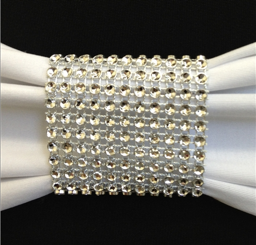 Dazzling rhinestone chair sash slips in silver as accents for your chair covers, bouquets and table centerpieces. Bendable and easy to use, have fun using these rhinestone diamond wraps as silver napking rings or metallic silver napkin holders. It's the inexpensive way to splash some sparkle into your event!