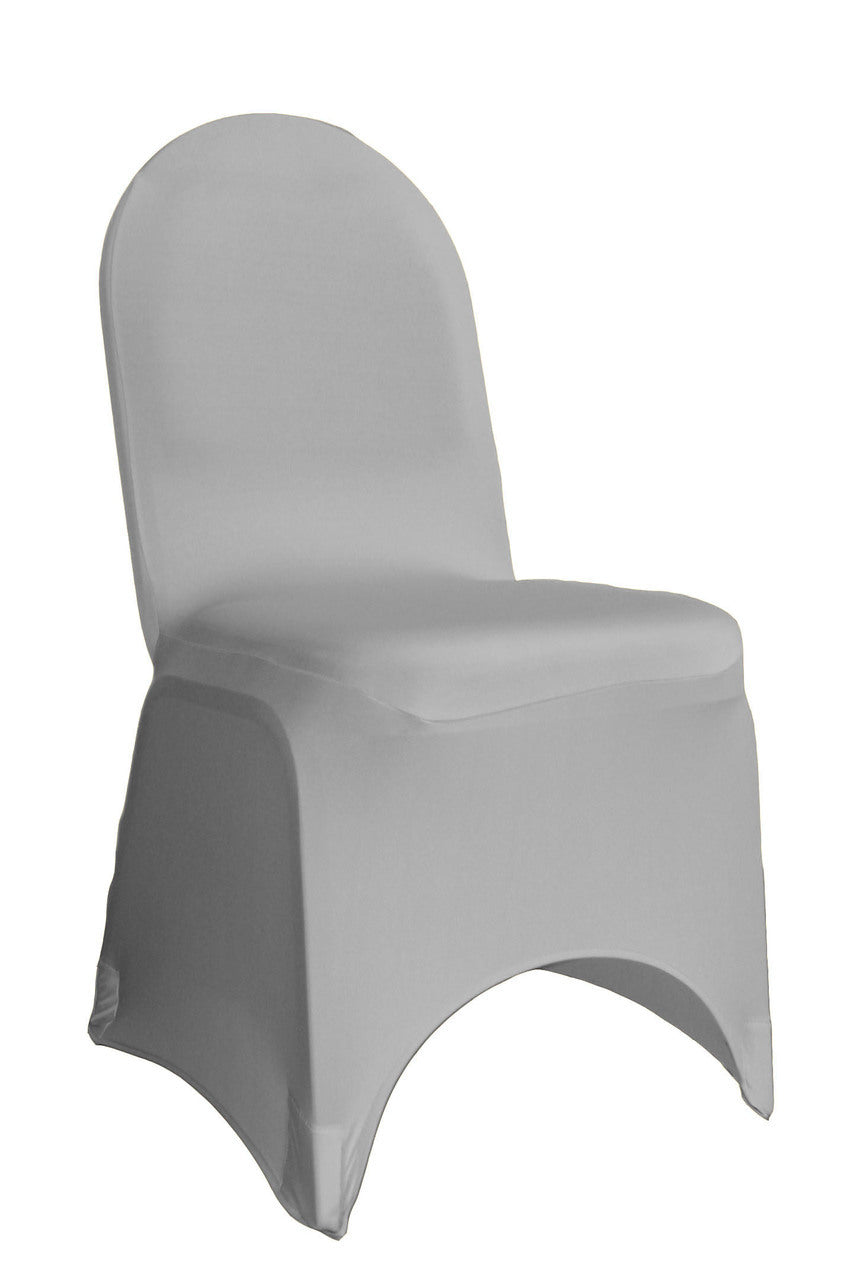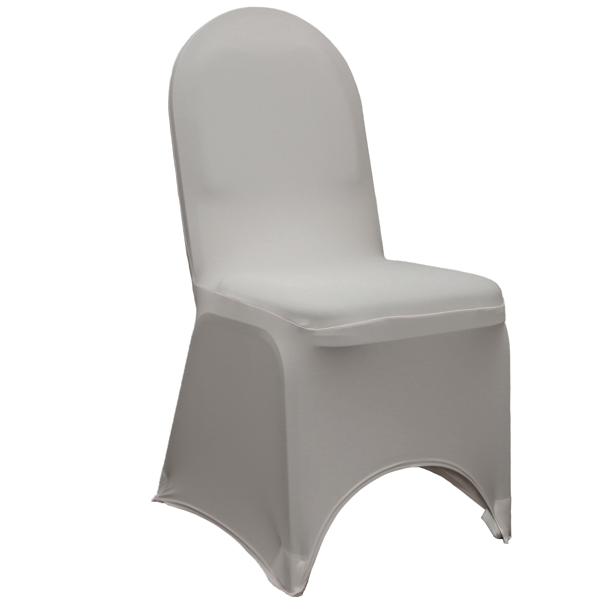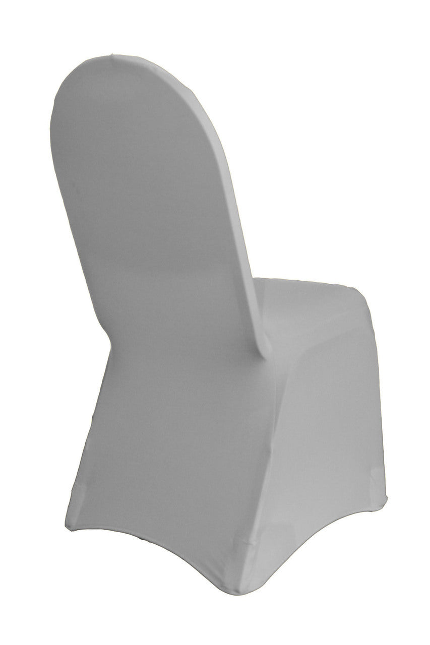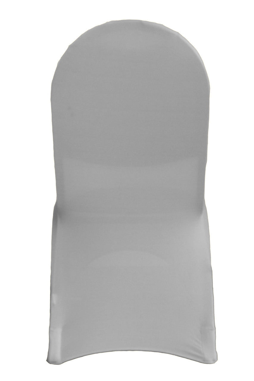 Made from high-quality four-way stretch spandex material, our Gray stretch spandex chair covers exemplify modern sophistication and luxurious elegance and are designed to fit round-top banquet chairs at weddings, casinos, hotels, restaurants, and other special events. Gray spandex chair covers from Bridal Tablecloths have deep elastic foot pockets, are durable, do not require ironing, and can be laundered countless times. There are cheaper versions of this material available in the market, ours is crafted from a hotel and restaurant quality spandex type of material.