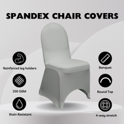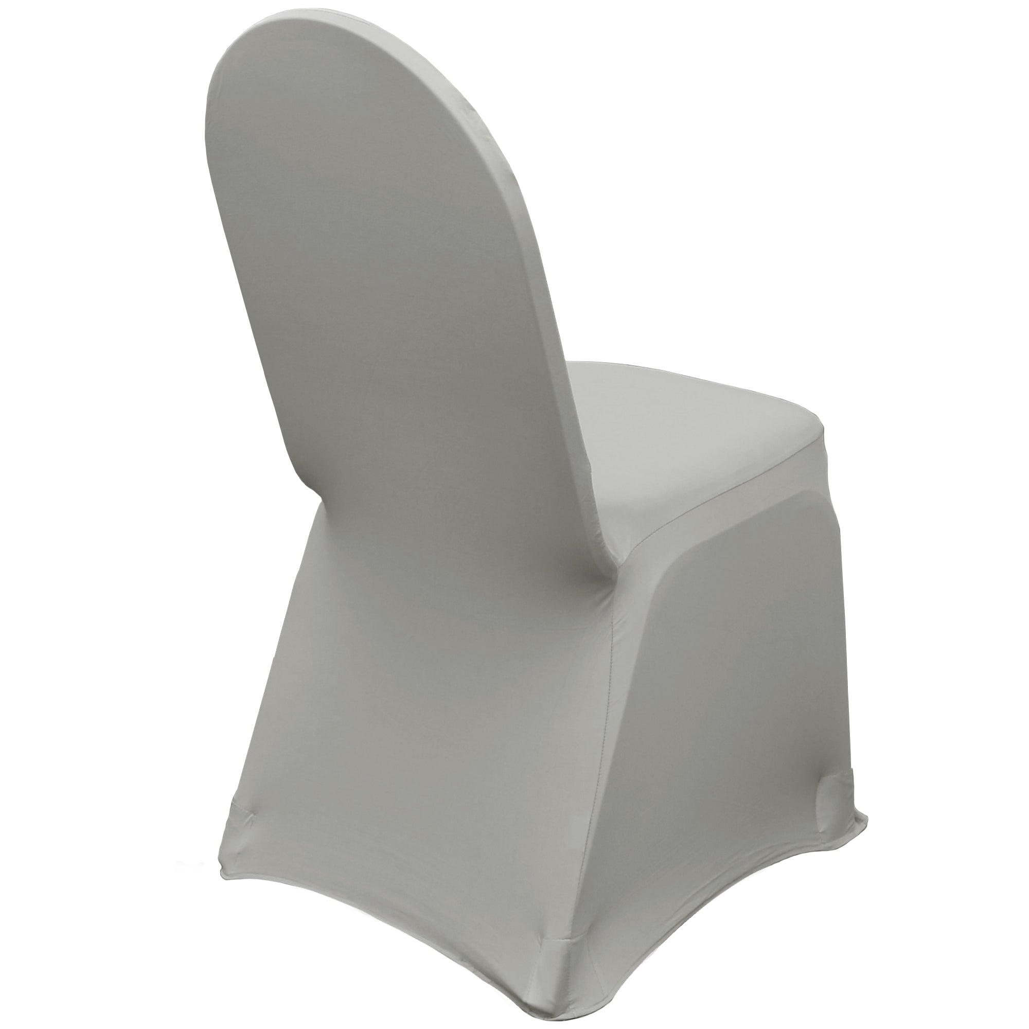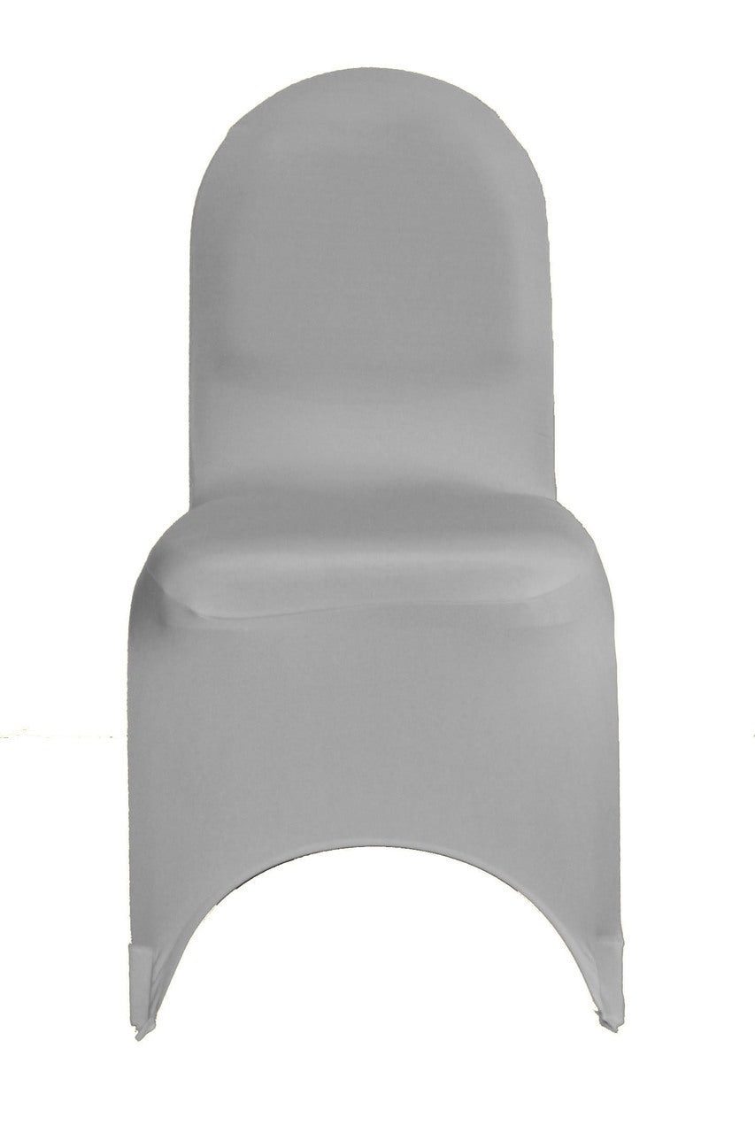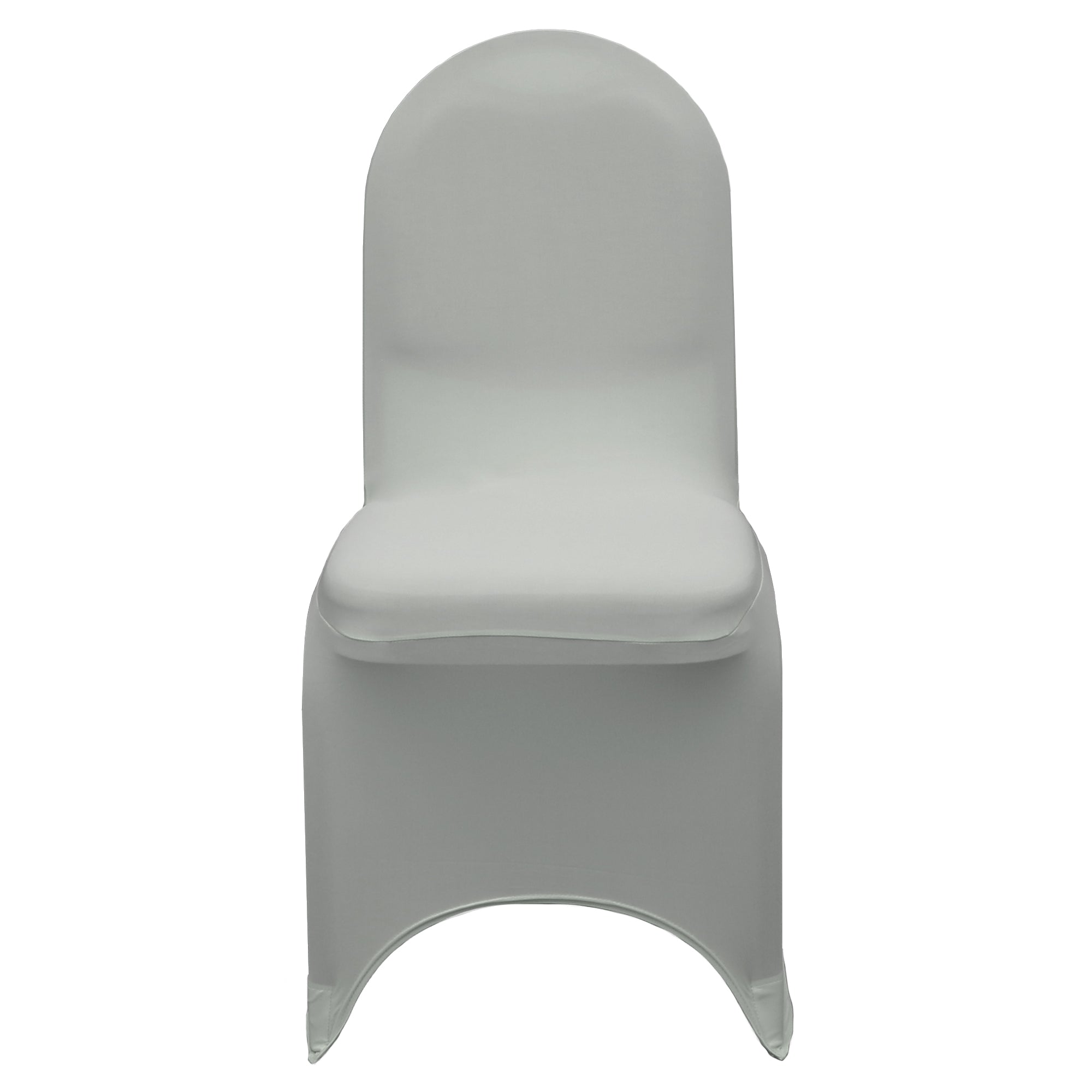 Made from high-quality four-way stretch spandex material, our Gray stretch spandex chair covers exemplify modern sophistication and luxurious elegance and are designed to fit round-top banquet chairs at weddings, casinos, hotels, restaurants, and other special events. Gray spandex chair covers from Bridal Tablecloths have deep elastic foot pockets, are durable, do not require ironing, and can be laundered countless times. There are cheaper versions of this material available in the market, ours is crafted from a hotel and restaurant quality spandex type of material.