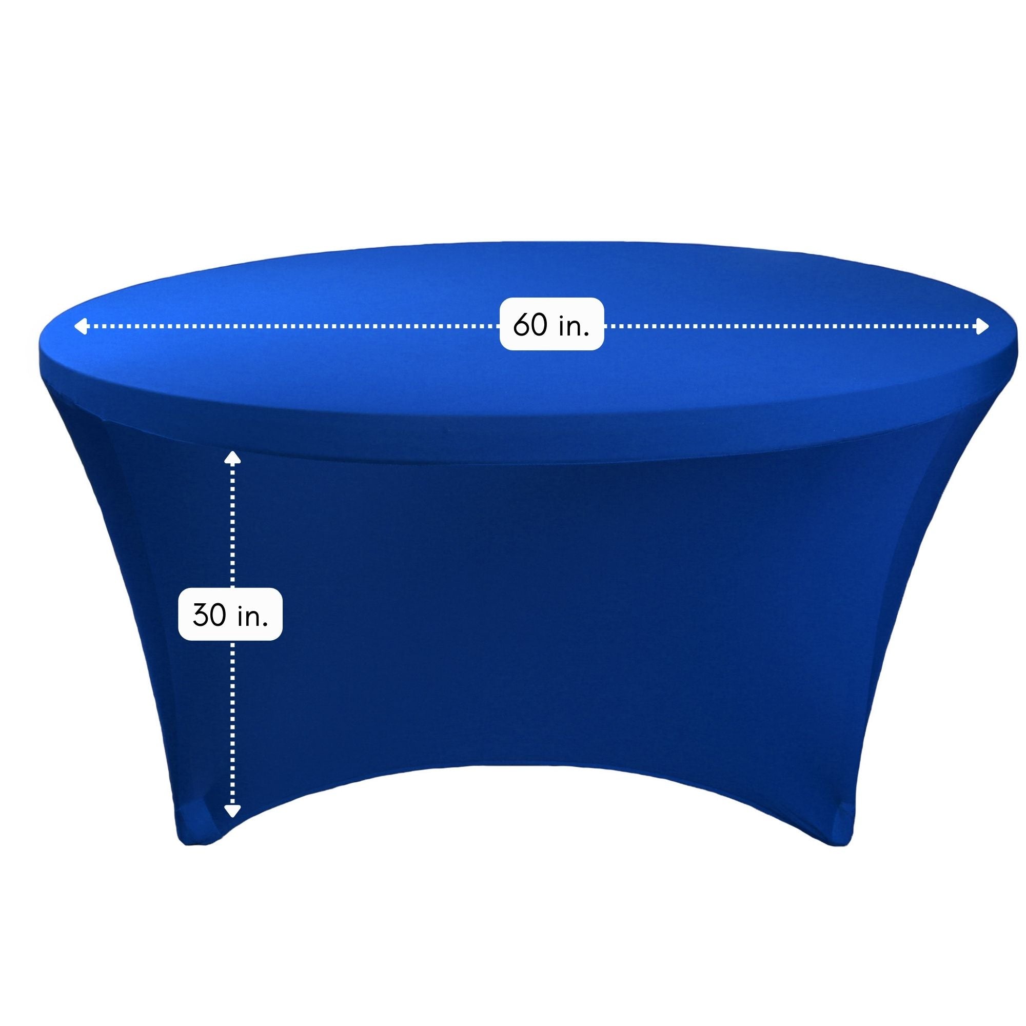 Made from high quality four-way stretch spandex material, our royal blue stretch spandex 5 ft round table covers exemplify modern sophistication and luxurious elegance and are designed to fit 5 ft or 60" round tables with 30" height at weddings, casinos, hotels, restaurants and other special events. Royal Blue spandex table covers from Bridal Tablecloths have deep canvas foot pockets, are durable, do not require ironing and can be laundered countless times. Please note that there are inferior and cheaper versions of this material available in the market, ours is crafted from a hotel and restaurant quality spandex type of material.