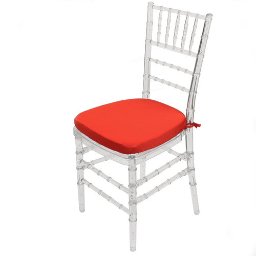Our Stretch Spandex Chiavari Pad Cover with Ties in Red are a sleek and stylish accessory designed to enhance the comfort and appearance of Chiavari chairs. Made from high-quality stretch spandex fabric, this cover fits snugly over most Chiavari chair cushions, offering a smooth and wrinkle-free look. The red color adds an elegant and sophisticated touch, ideal for weddings, banquets, corporate events, or any formal occasion. The cover is equipped with durable ties to ensure a secure fit, preventing any slipping or movement during use. Easy to install and remove, it is also machine washable for convenient cleaning and maintenance. This cover offers a simple yet refined way to protect chair pads while upgrading the overall decor. If you're planning a lavish event, chair covers from Bridal Tablecloths make an excellent choice because our wholesale tablecloth and chair cover company is known for meeting hotel and restaurant product quality standards.
