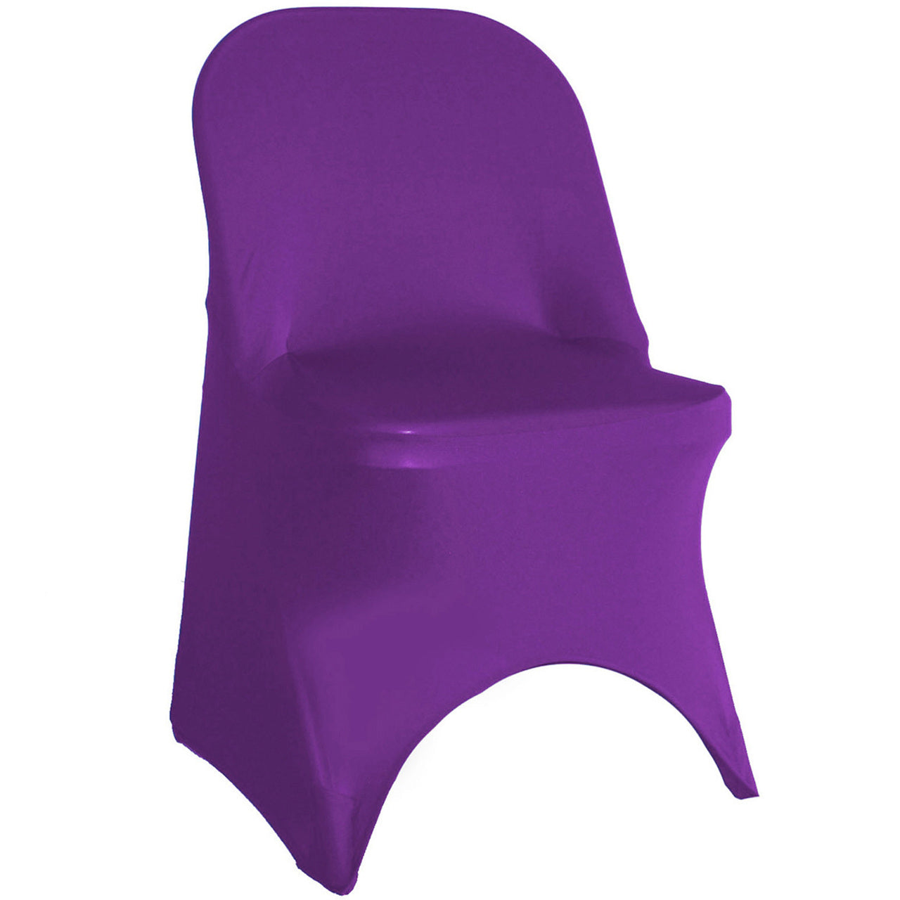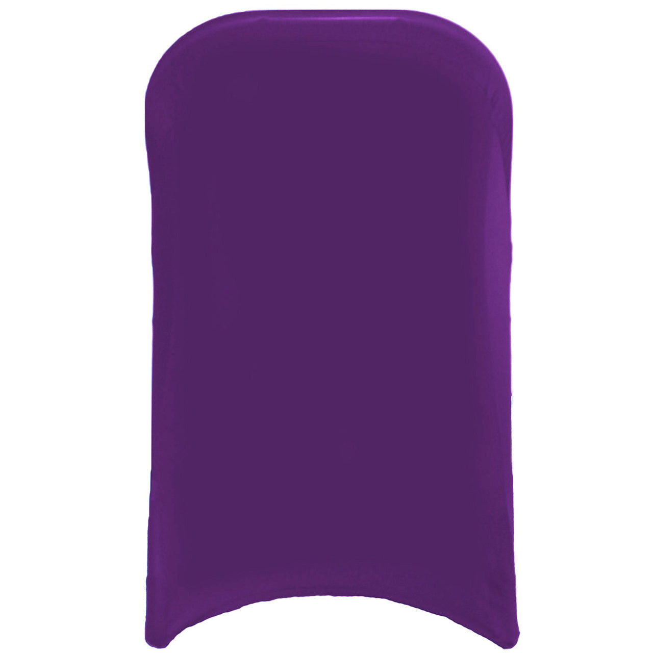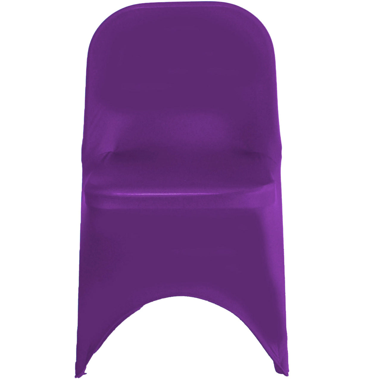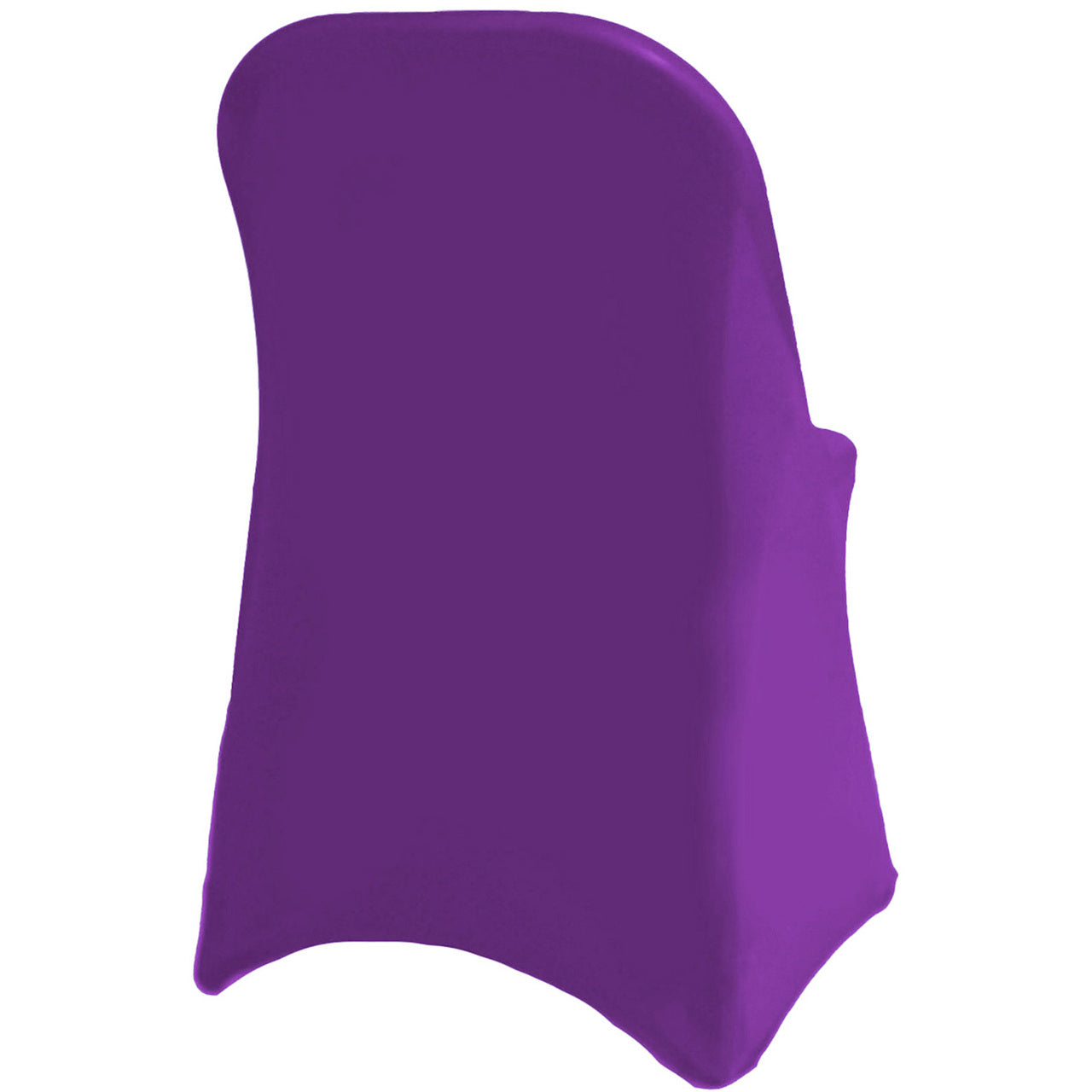Made from high-quality four-way stretch spandex material, our purple stretch spandex folding chair covers exemplify modern sophistication and luxurious elegance and are designed to fit standard folding chairs at weddings, casinos, hotels, restaurants, and other special events. Purple spandex chair covers from Bridal Tablecloths have deep canvas foot pockets, are durable, do not require ironing, and can be laundered countless times. There are cheaper versions of this material available in the market, ours is crafted from a hotel and restaurant quality spandex type of material.
