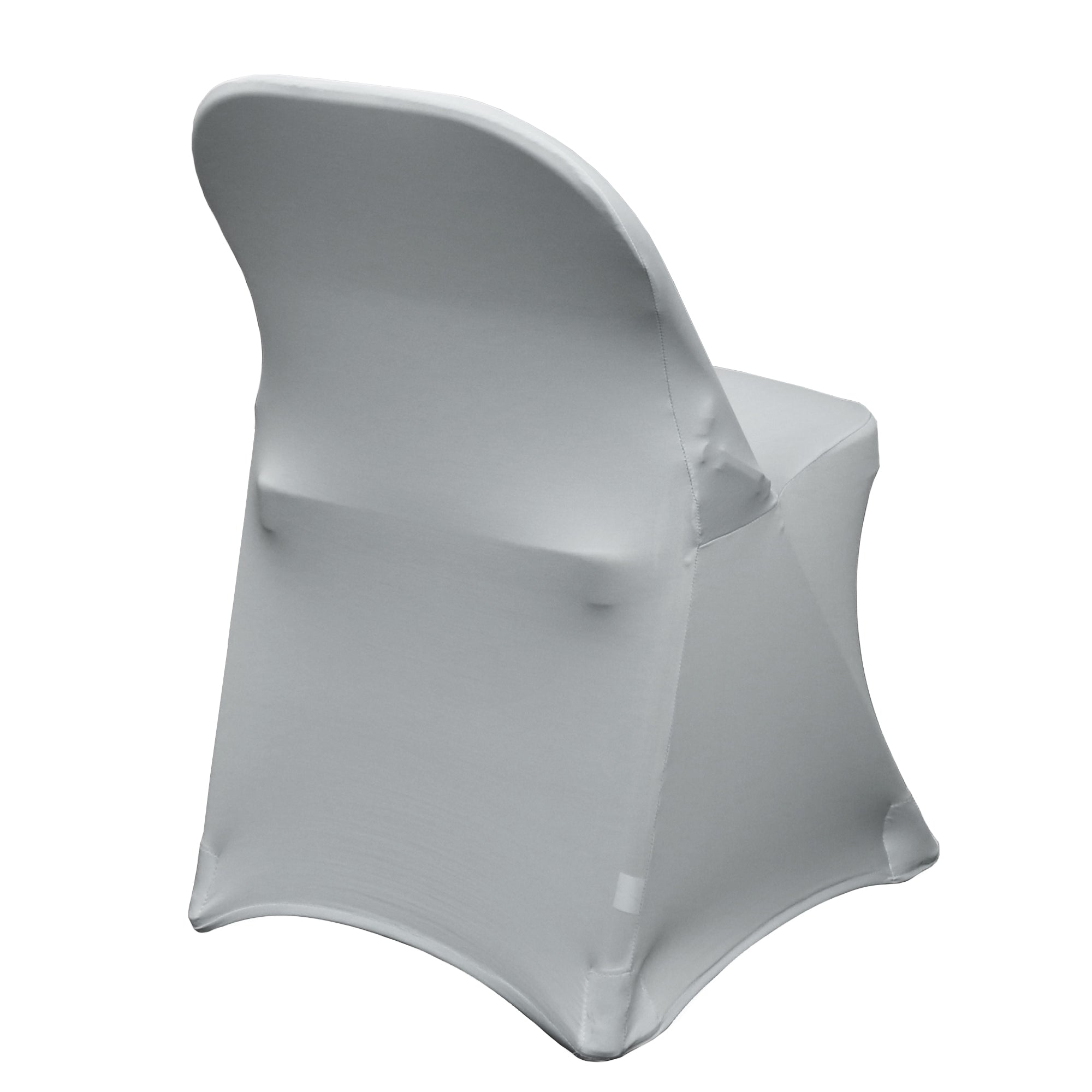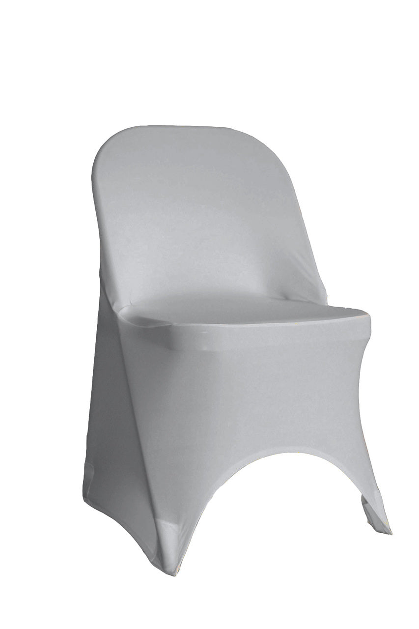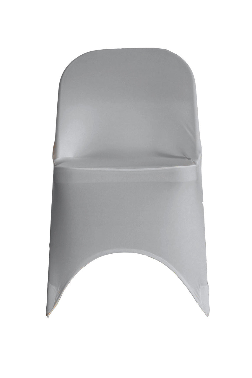 Made from high-quality four-way stretch spandex material, our silver stretch spandex folding chair covers exemplify modern sophistication and luxurious elegance and are designed to fit standard folding chairs at weddings, casinos, hotels, restaurants, and other special events. Silver spandex chair covers from Bridal Tablecloths have deep elastic foot pockets, are durable, do not require ironing, and can be laundered countless times. There are cheaper versions of this material available in the market, ours is crafted from a hotel and restaurant quality spandex type of material.