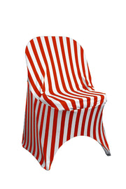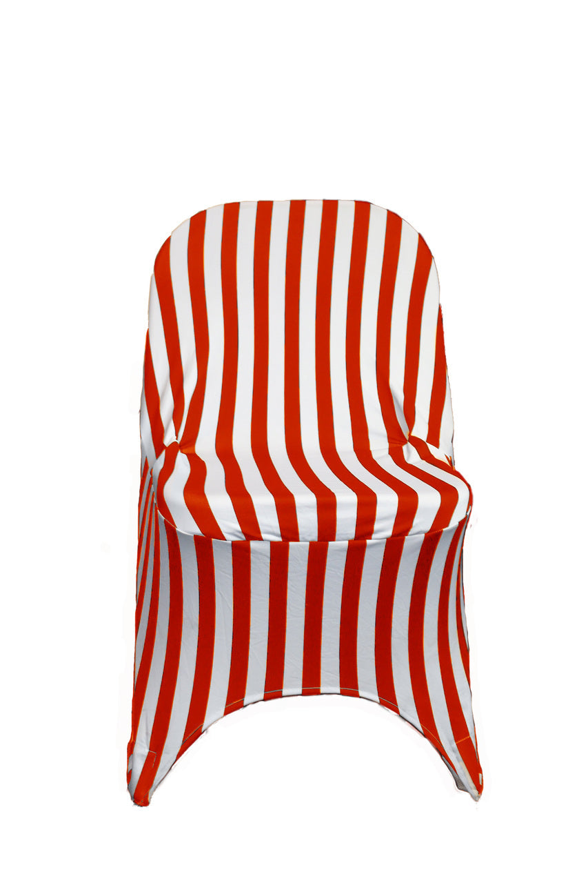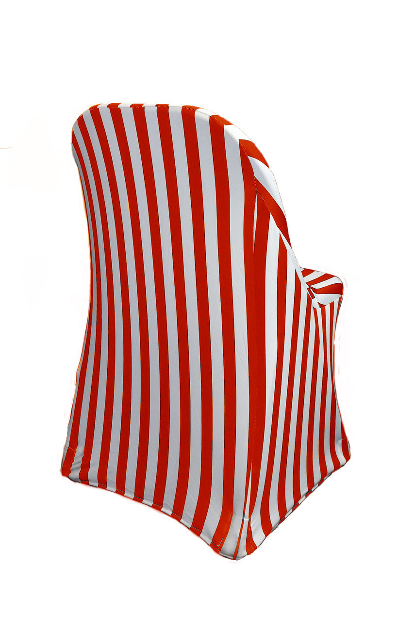 Made from high quality four-way stretch spandex material, our Striped Red and White stretch spandex folding chair covers exemplify modern sophistication and luxurious elegance and are designed to fit standard folding chairs at weddings, casinos, hotels, restaurants and other special events. Striped Red and White spandex chair covers from Bridal Tablecloths have deep canvas foot pockets, are durable, do not require ironing and can be laundered countless times. There are cheaper versions of this material available in the market, ours is crafted from a hotel and restaurant quality spandex type of material.